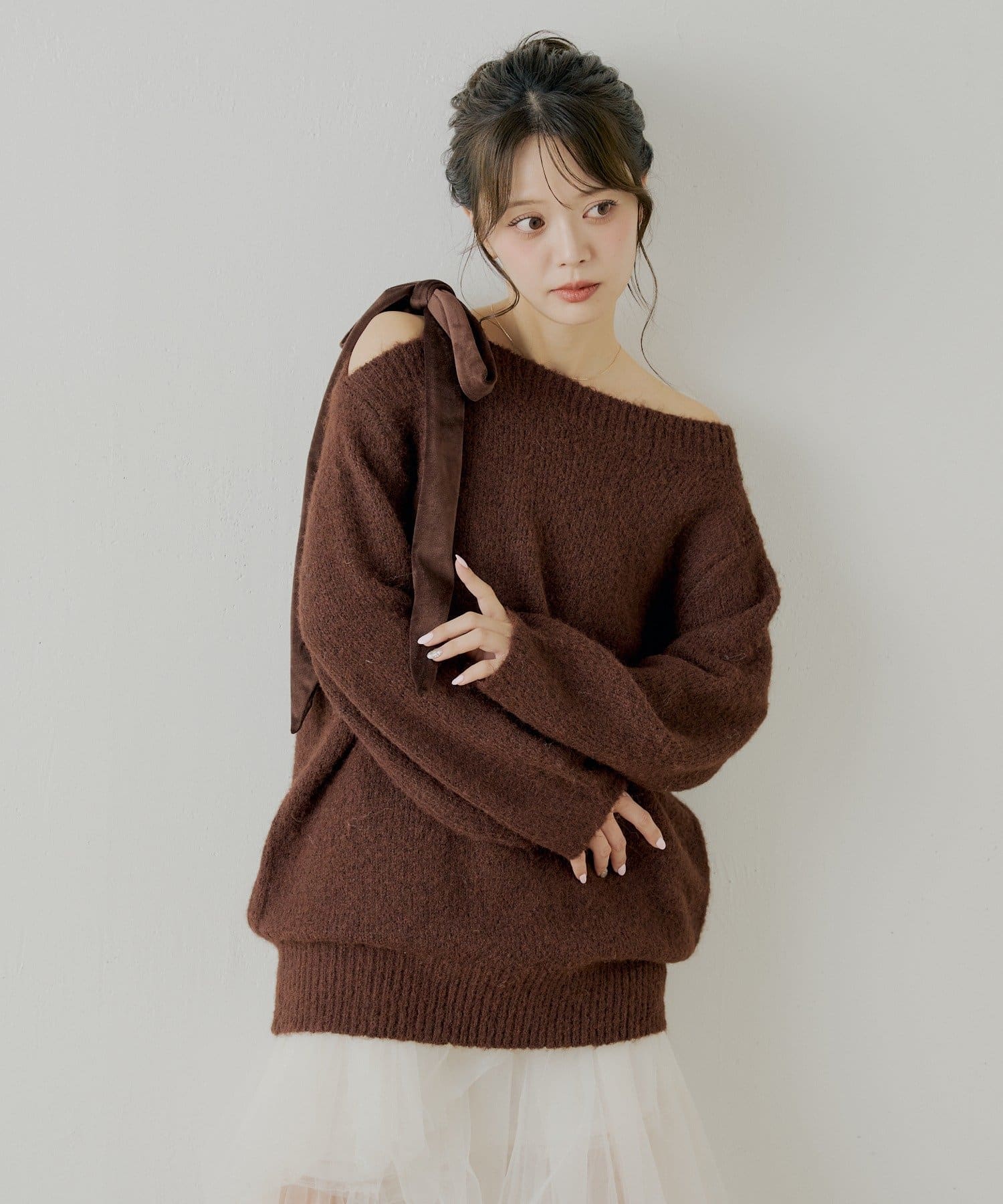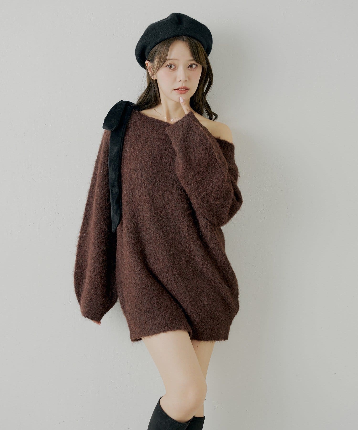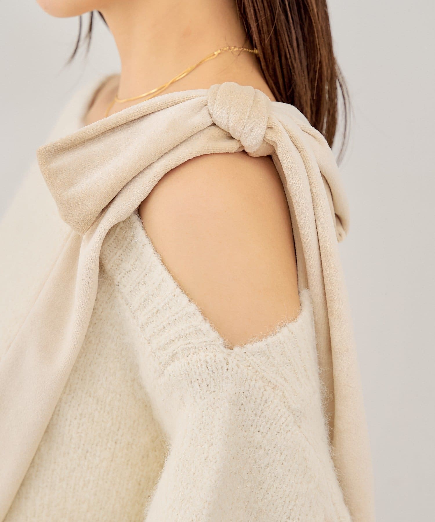 ・上品な光沢のベロア調リボンが、フェミニンな印象をプラス。