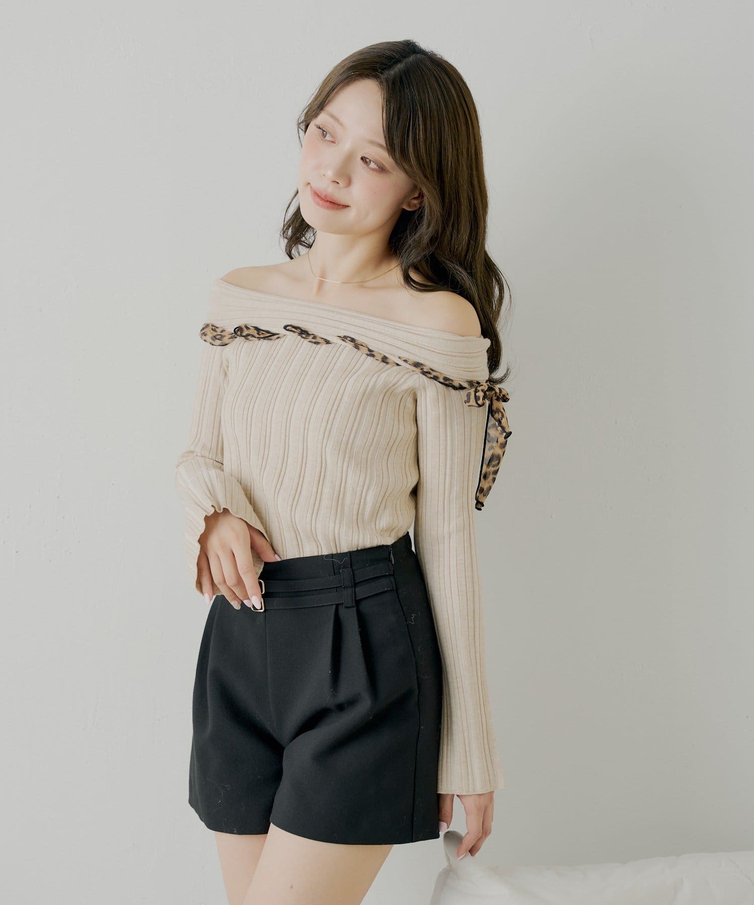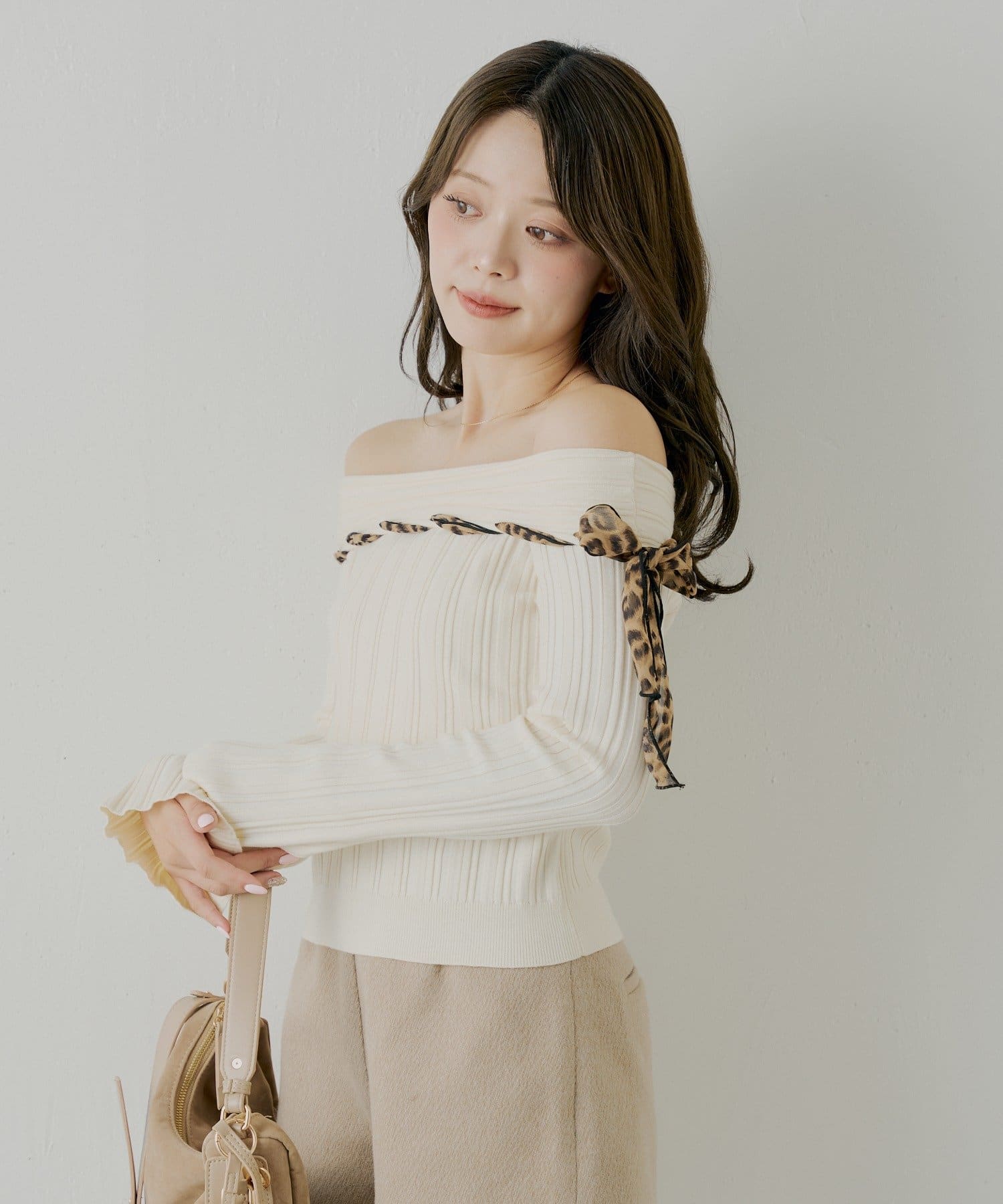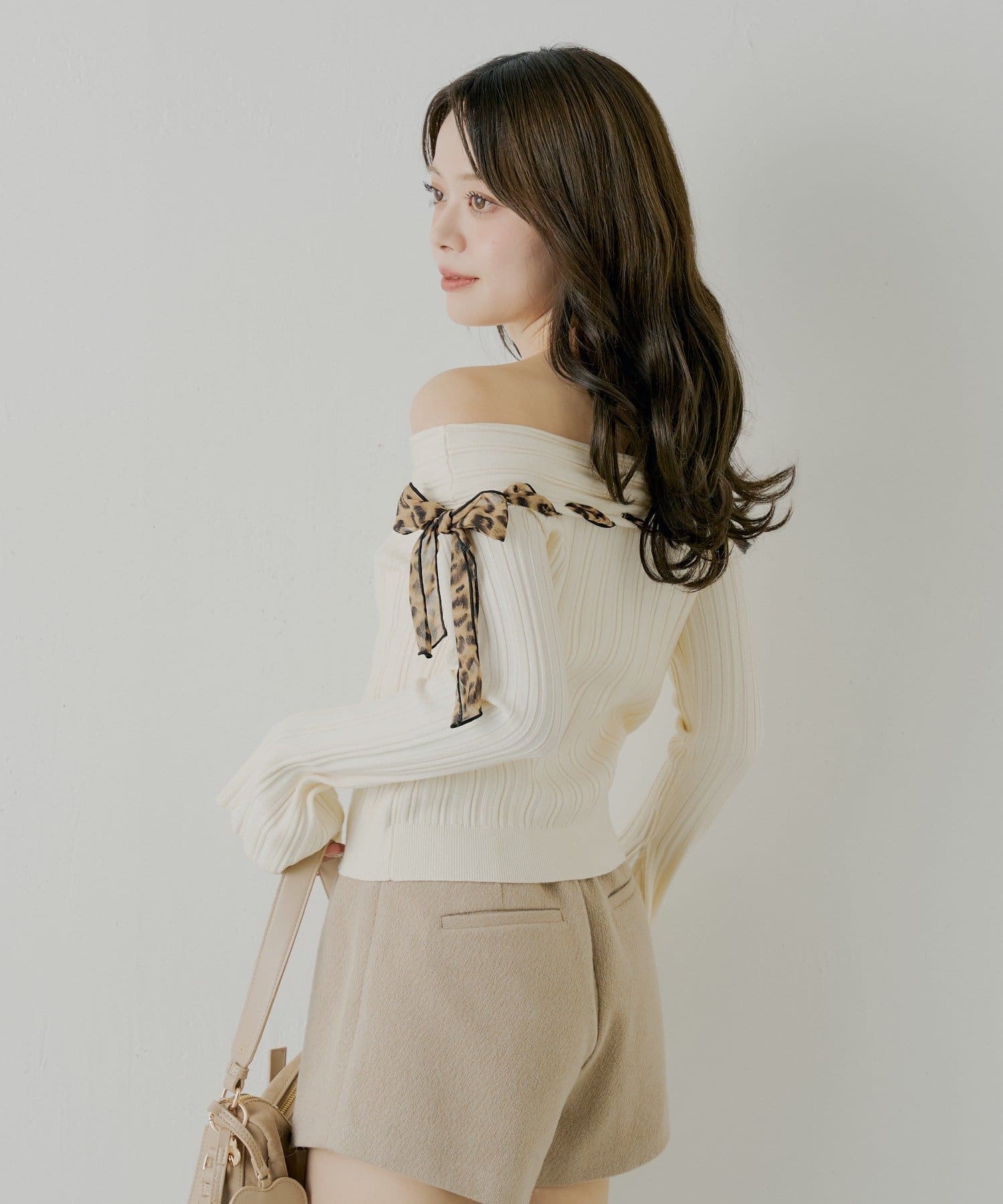・肩にあしらわれたリボンは、レオパード柄で、コーディネートのアクセントにも。