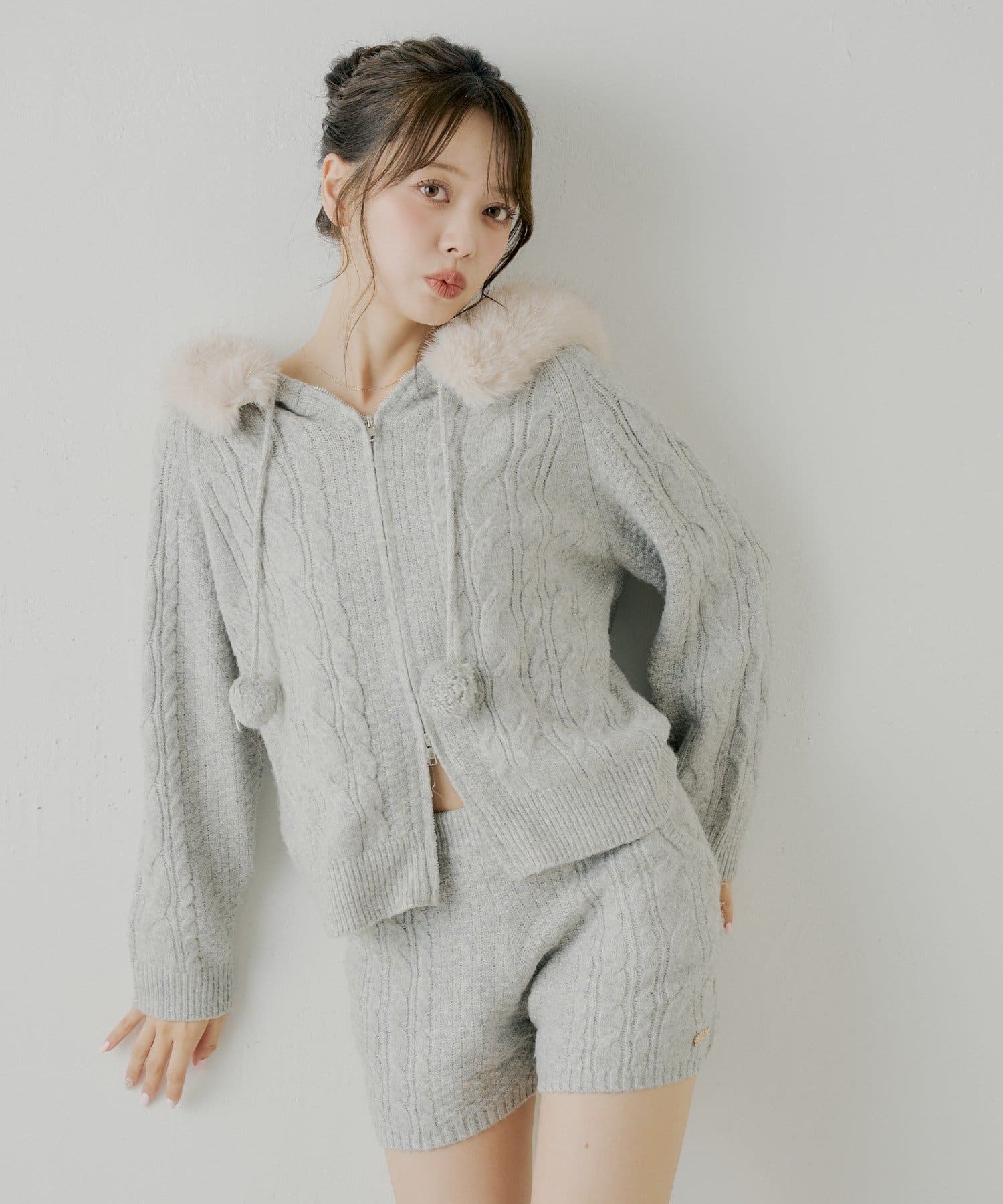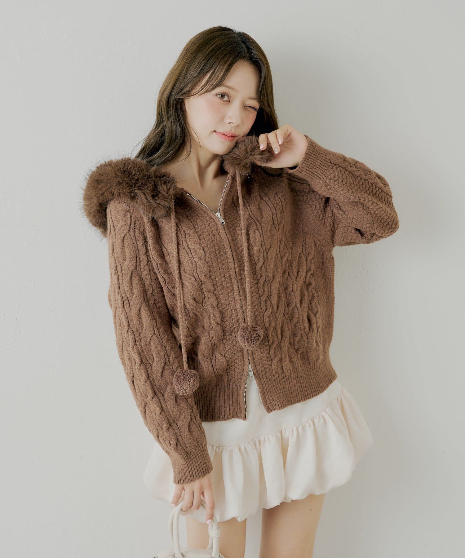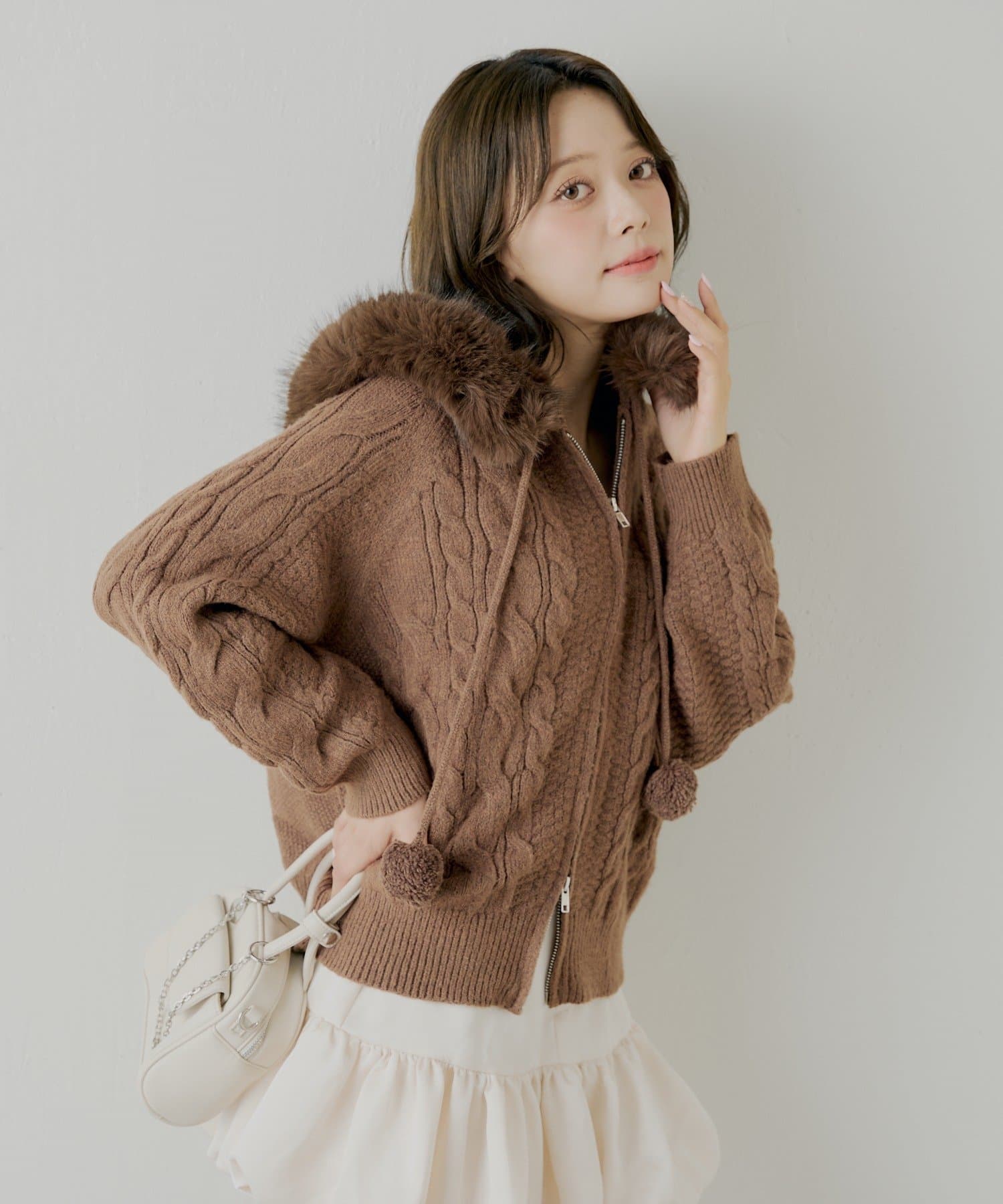 フードにあしらわれたファーとポンポンが可愛いケーブルニット登場!