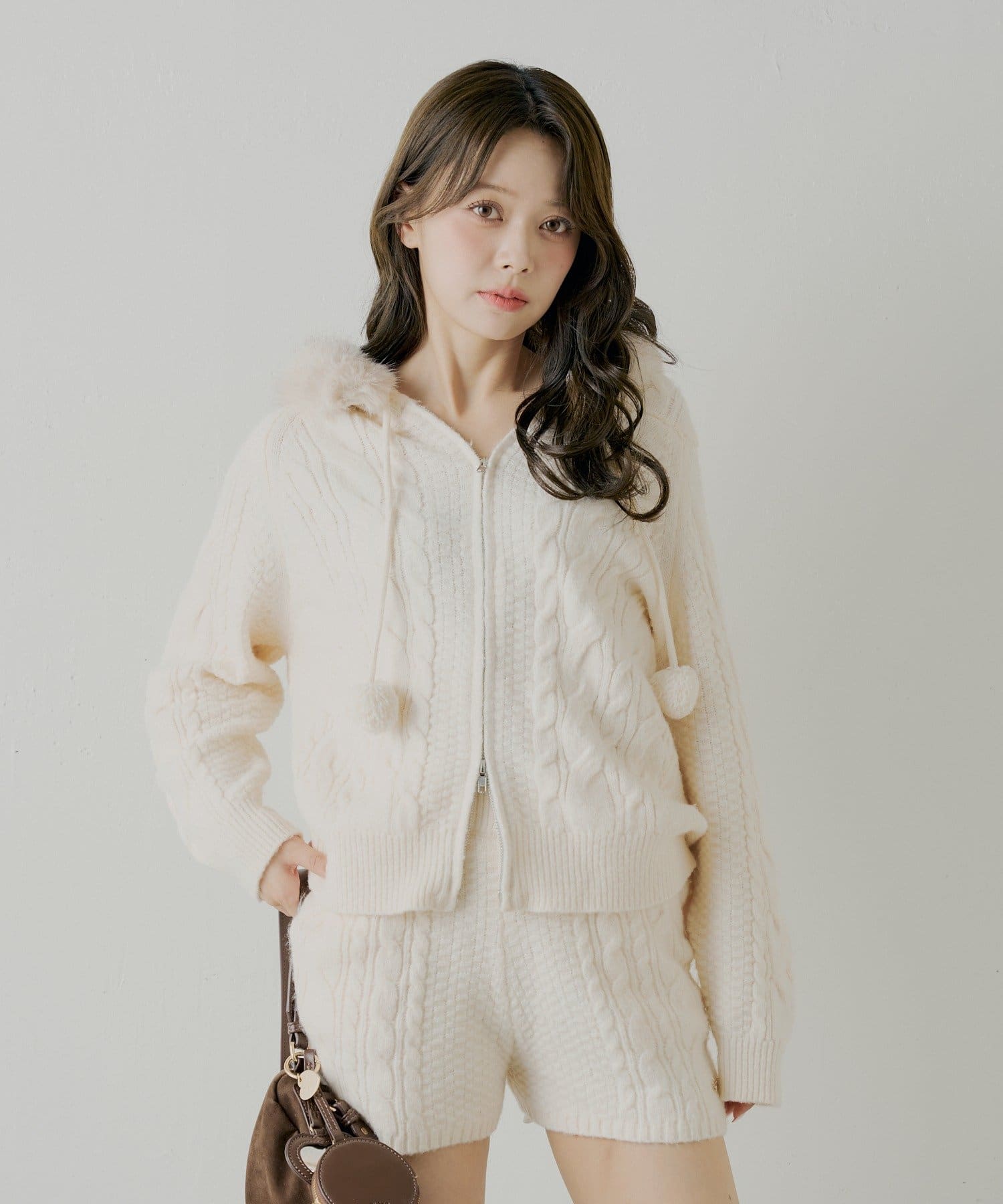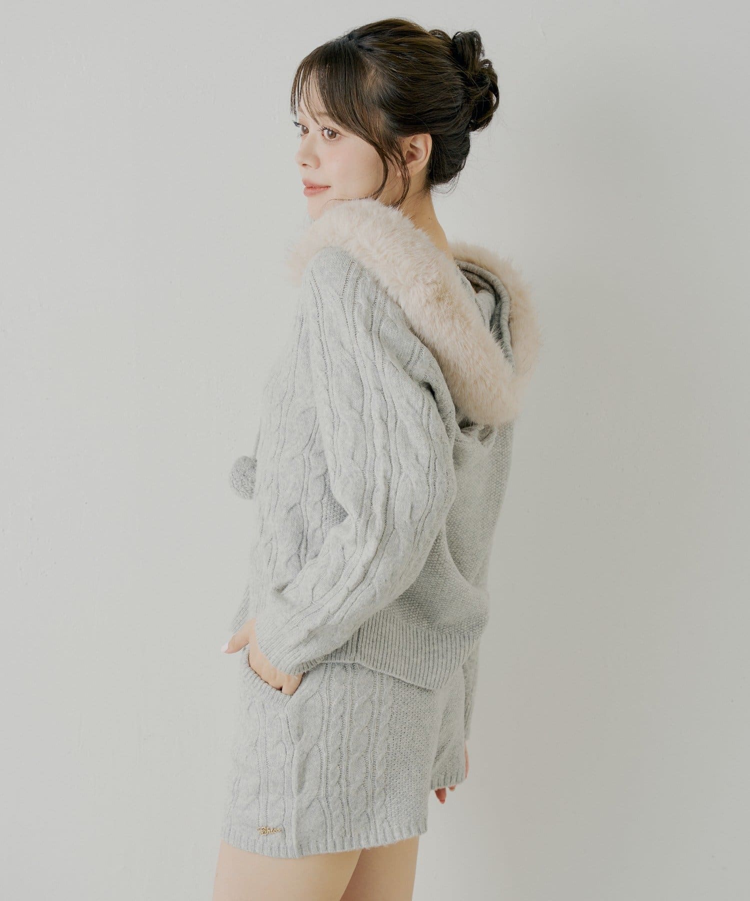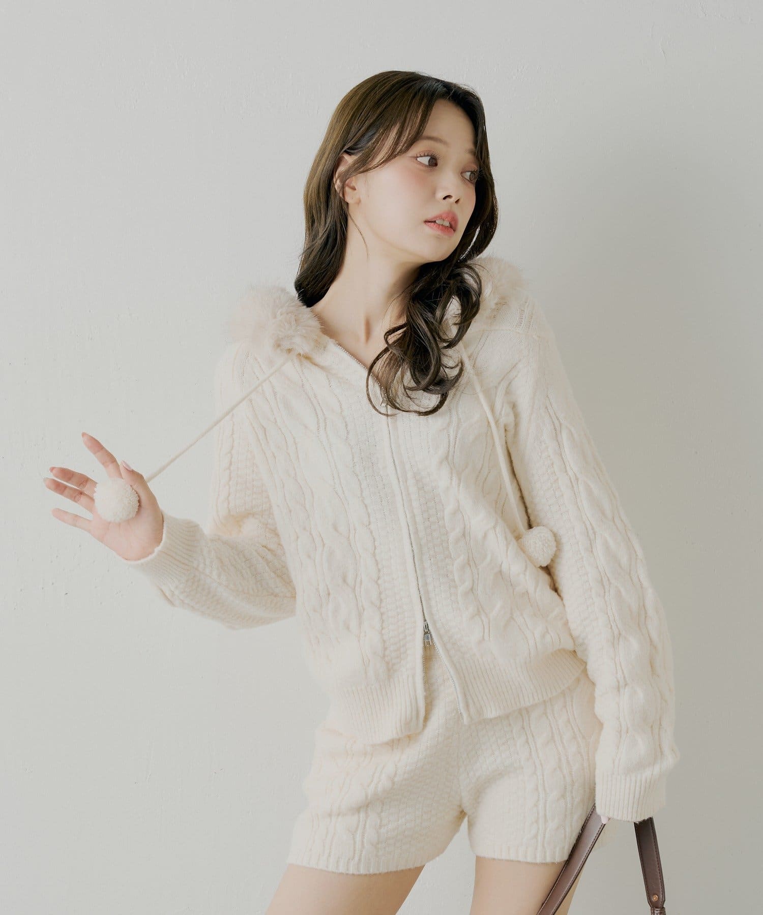 【セットアップ対応】ポンポン付きファーフードケーブルニット