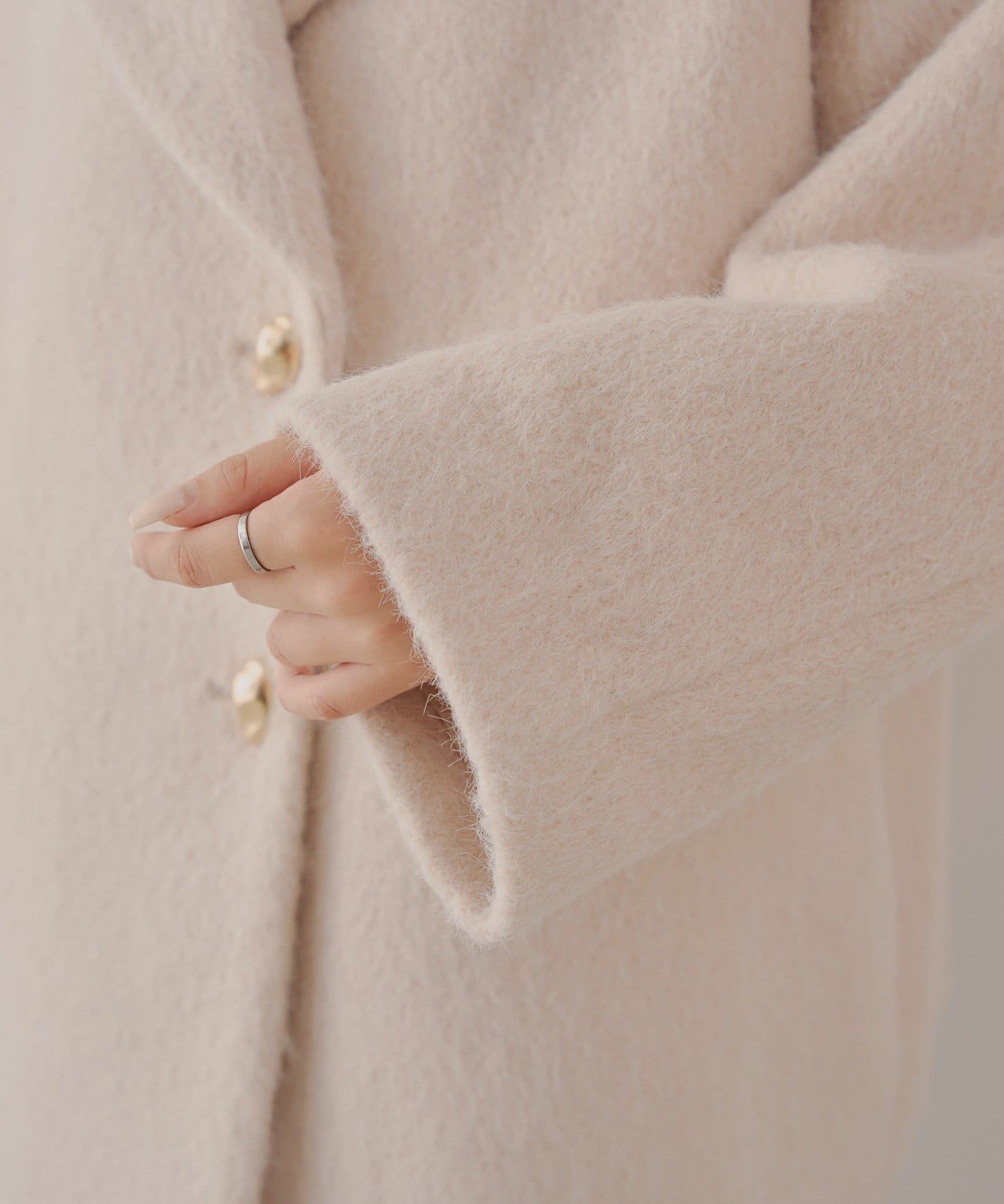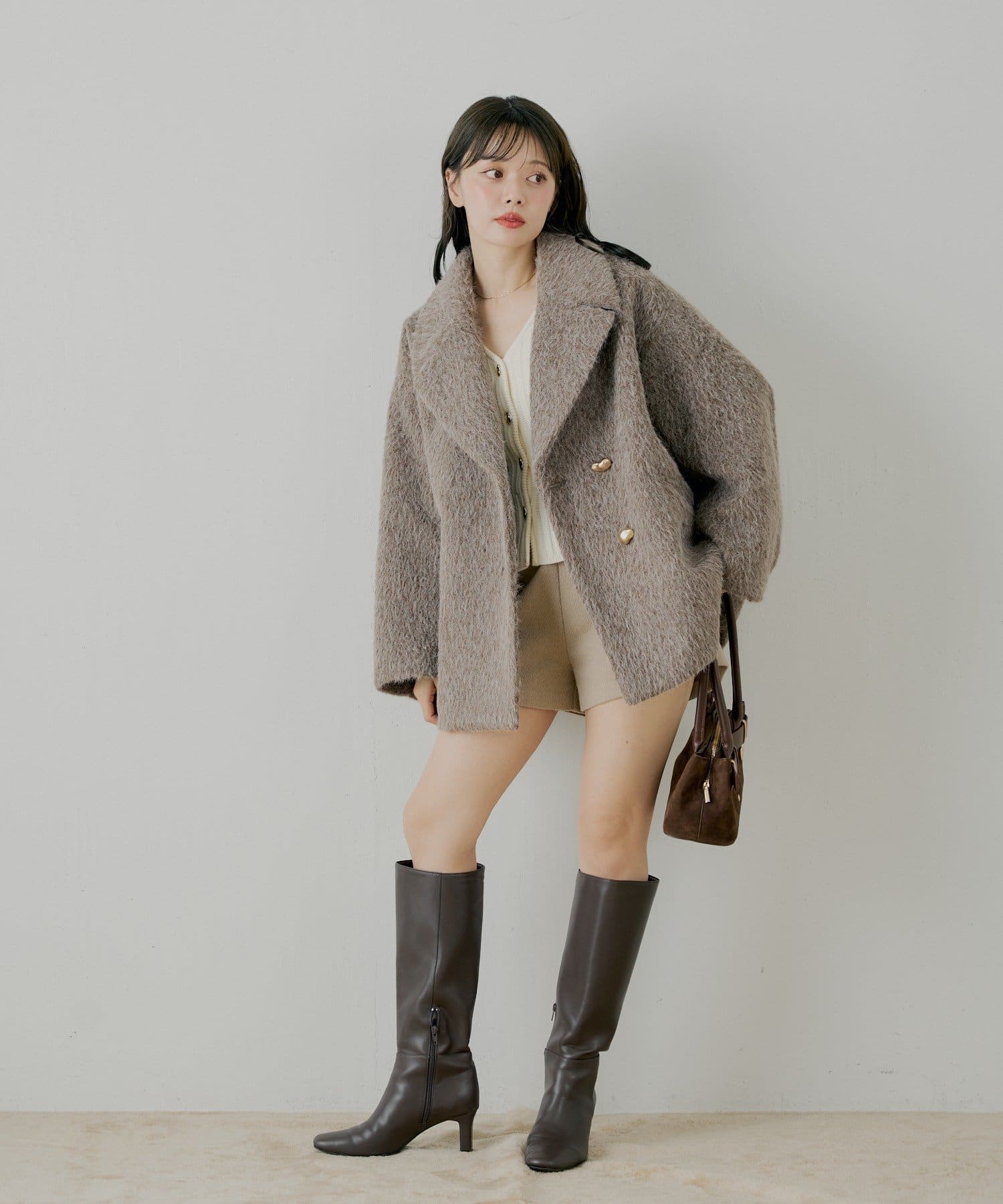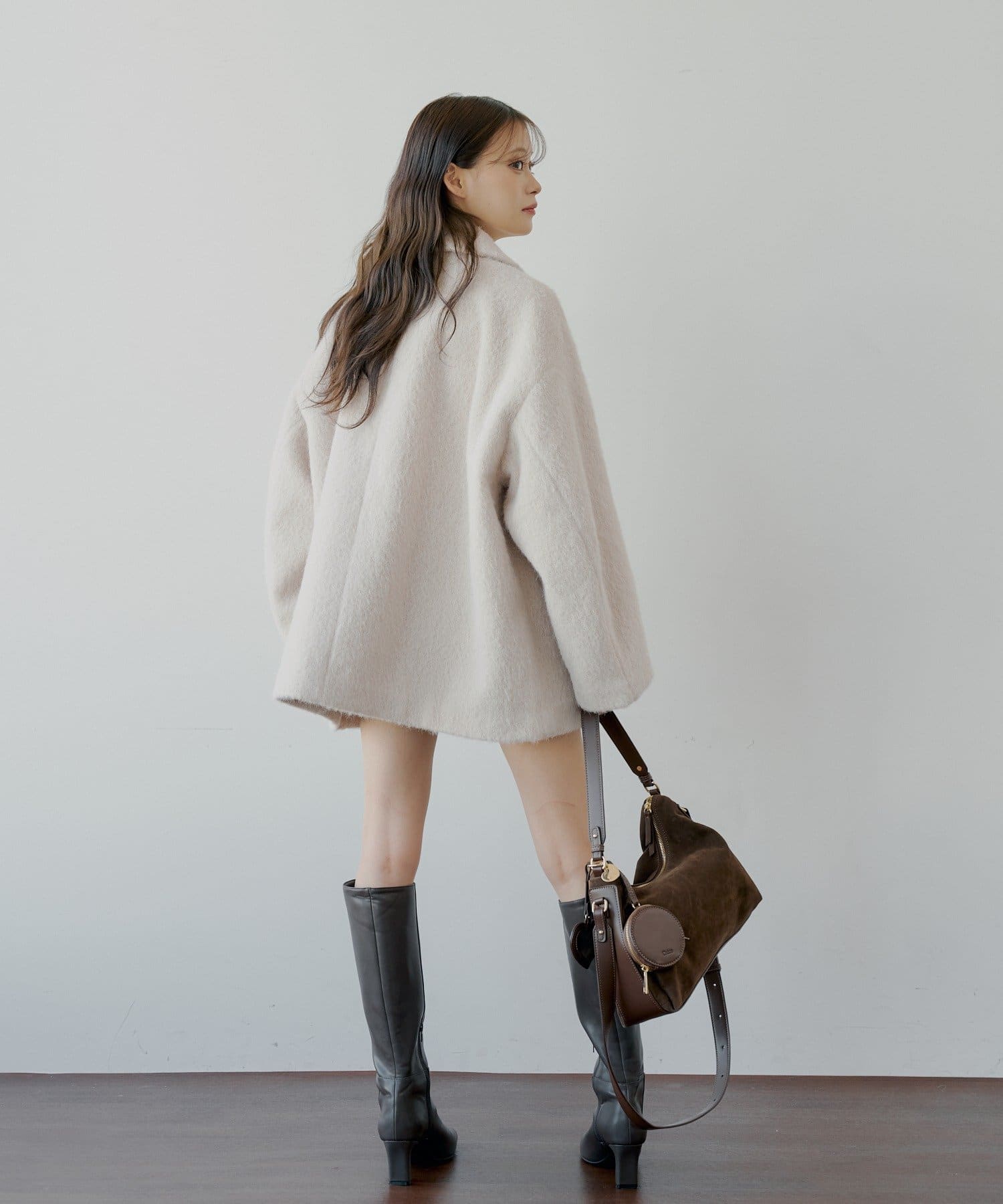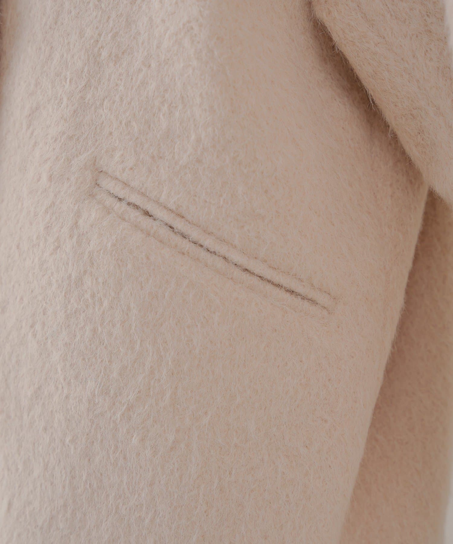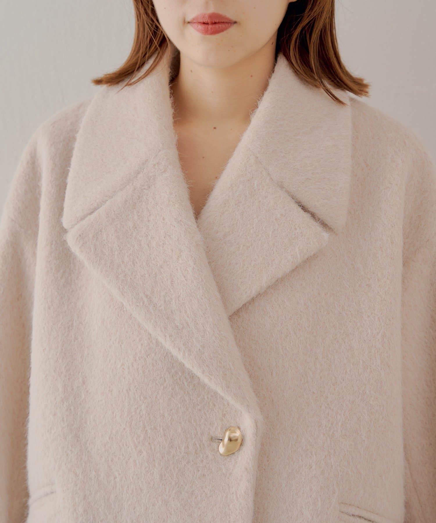 ふんわりと柔らかなシャギー素材が、大人の可愛らしさを引き立てるミディジャケットコート