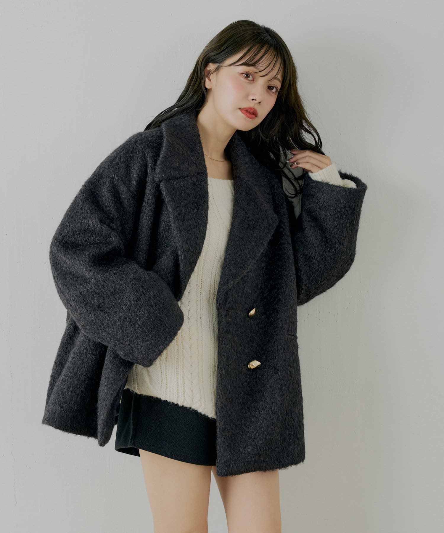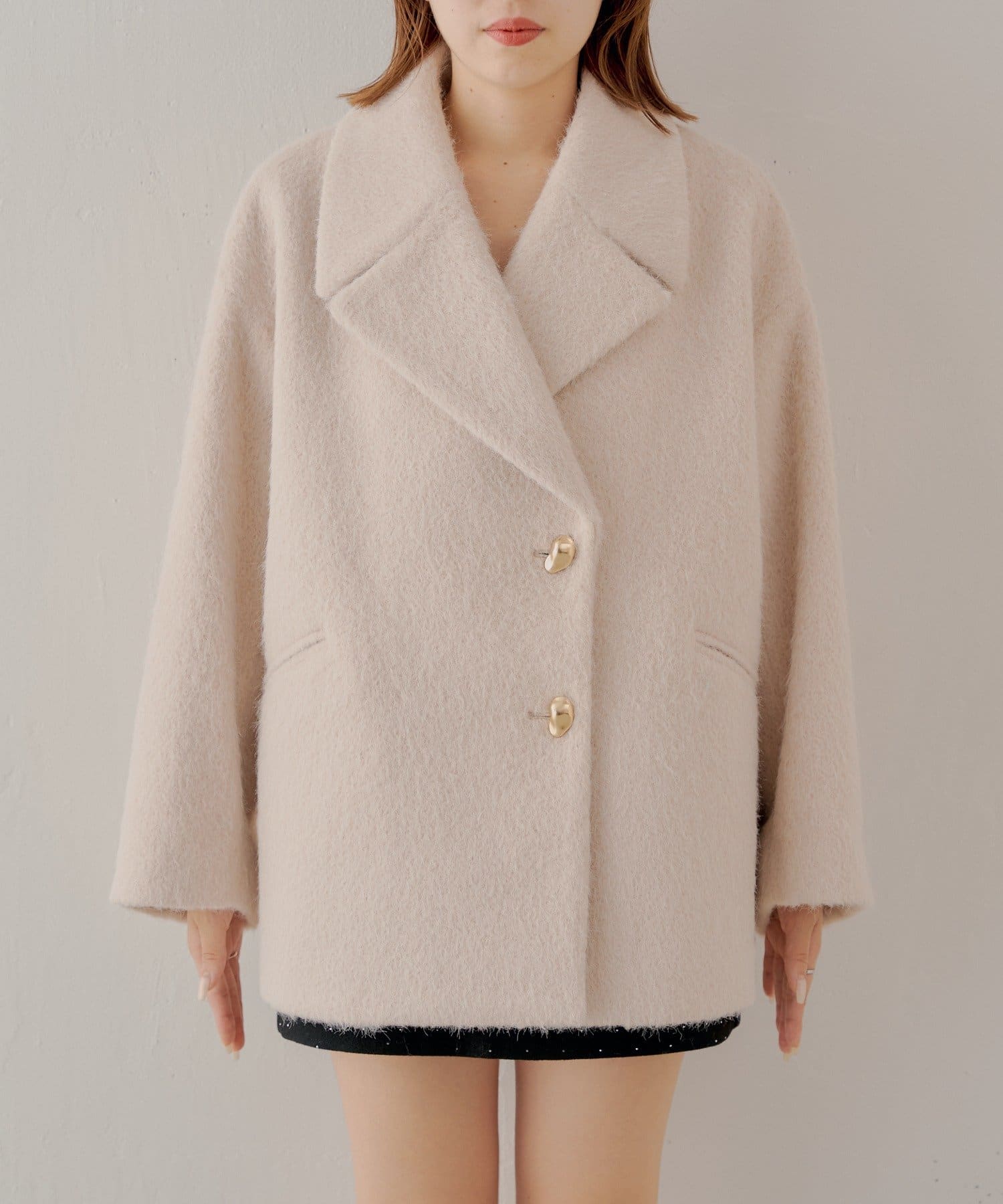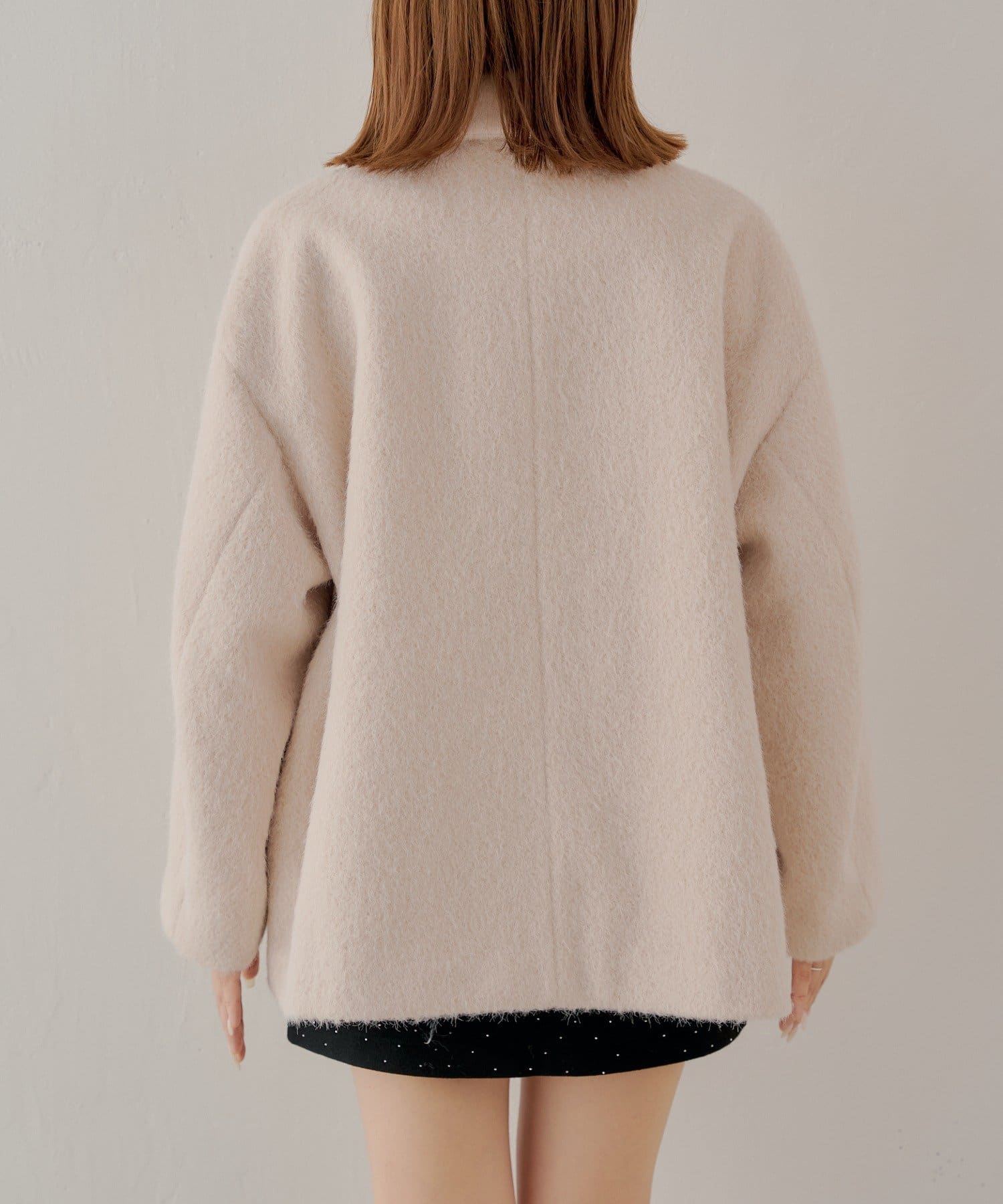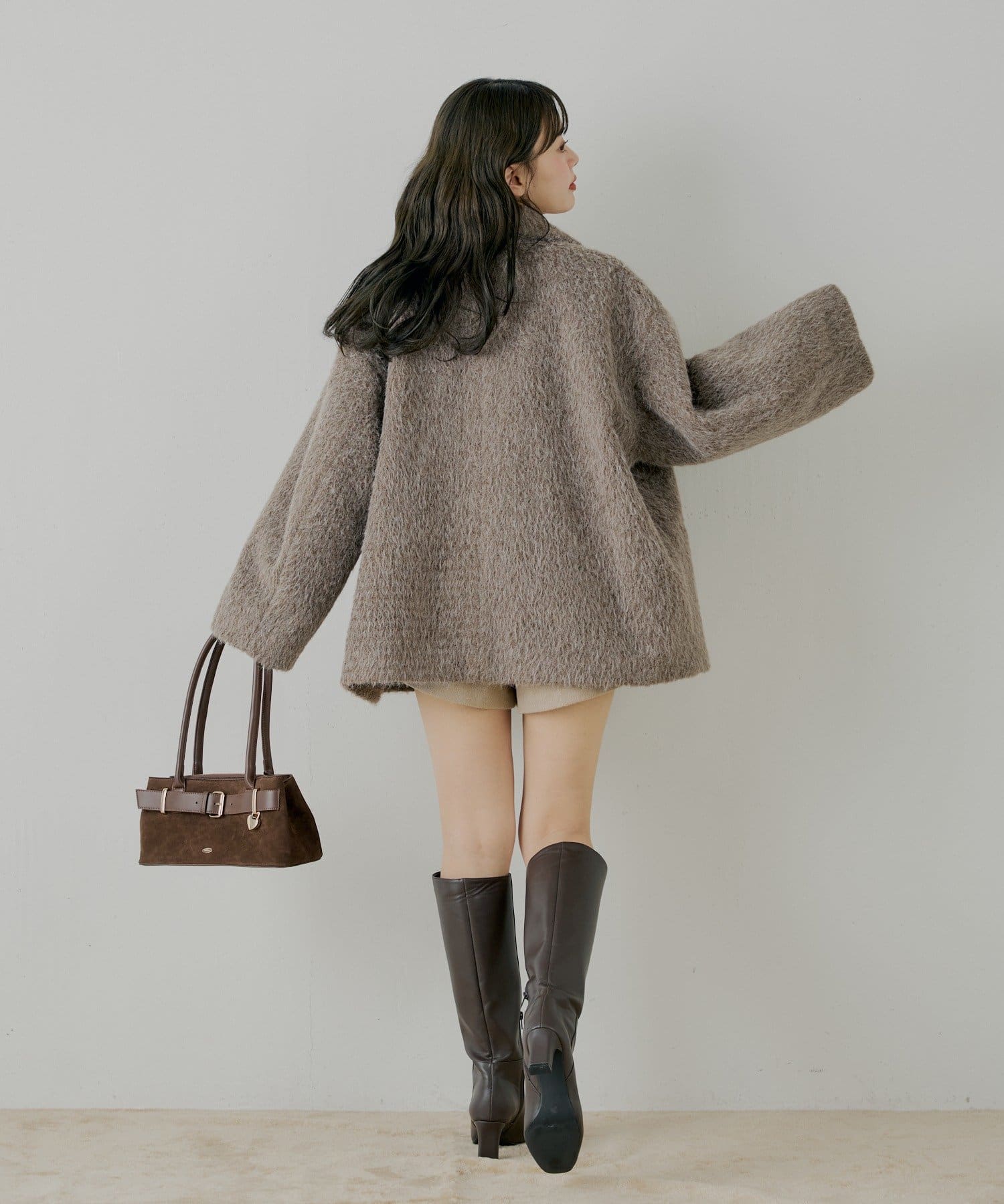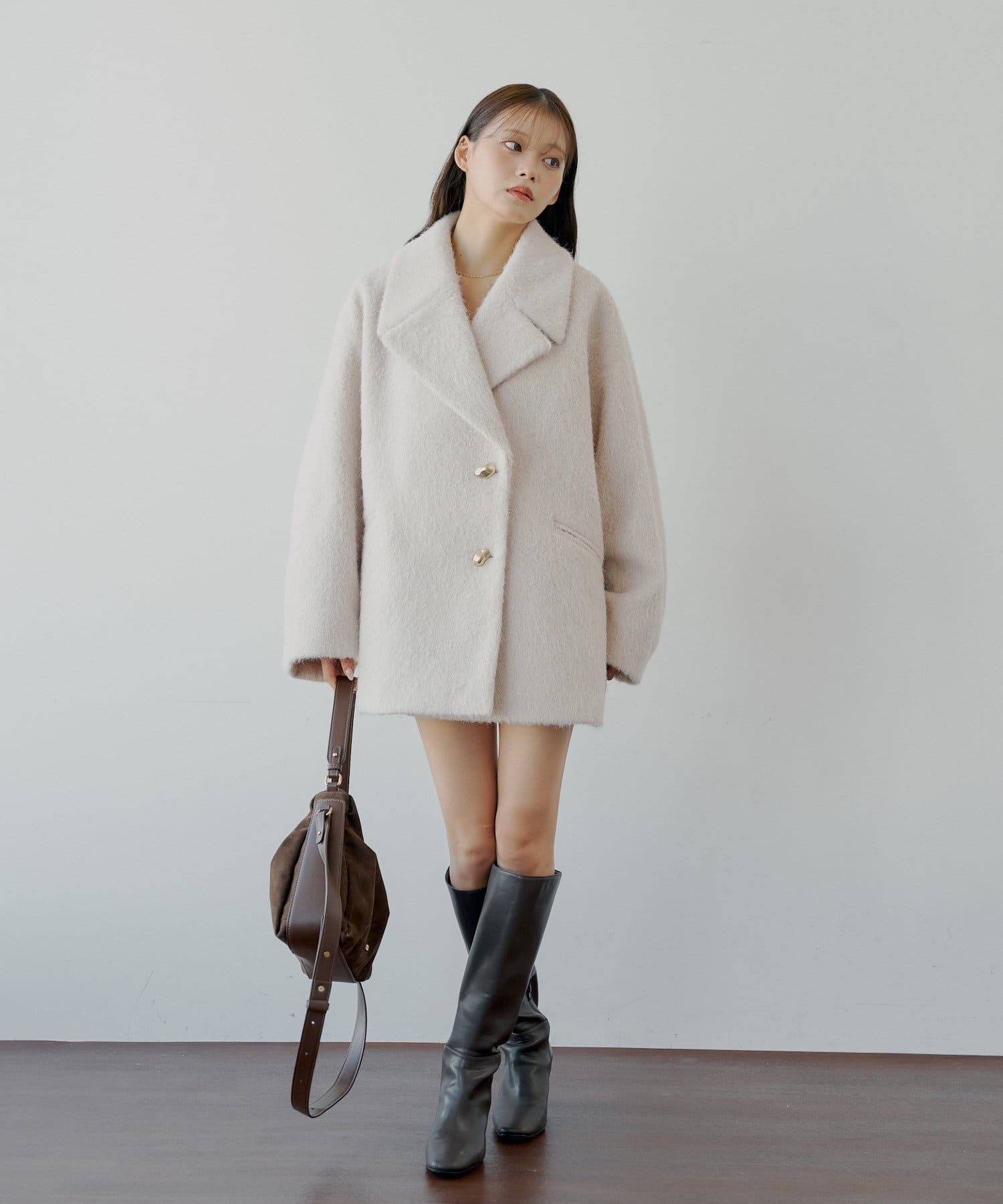 ふんわりと柔らかなシャギー素材が、大人の可愛らしさを引き立てるミディジャケットコート