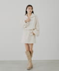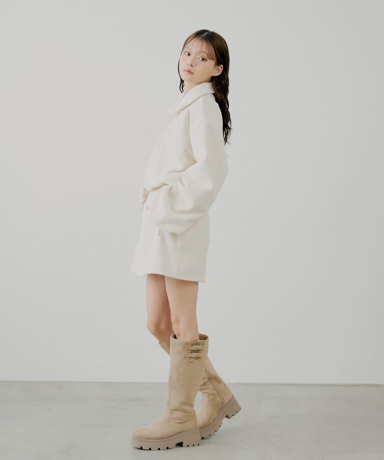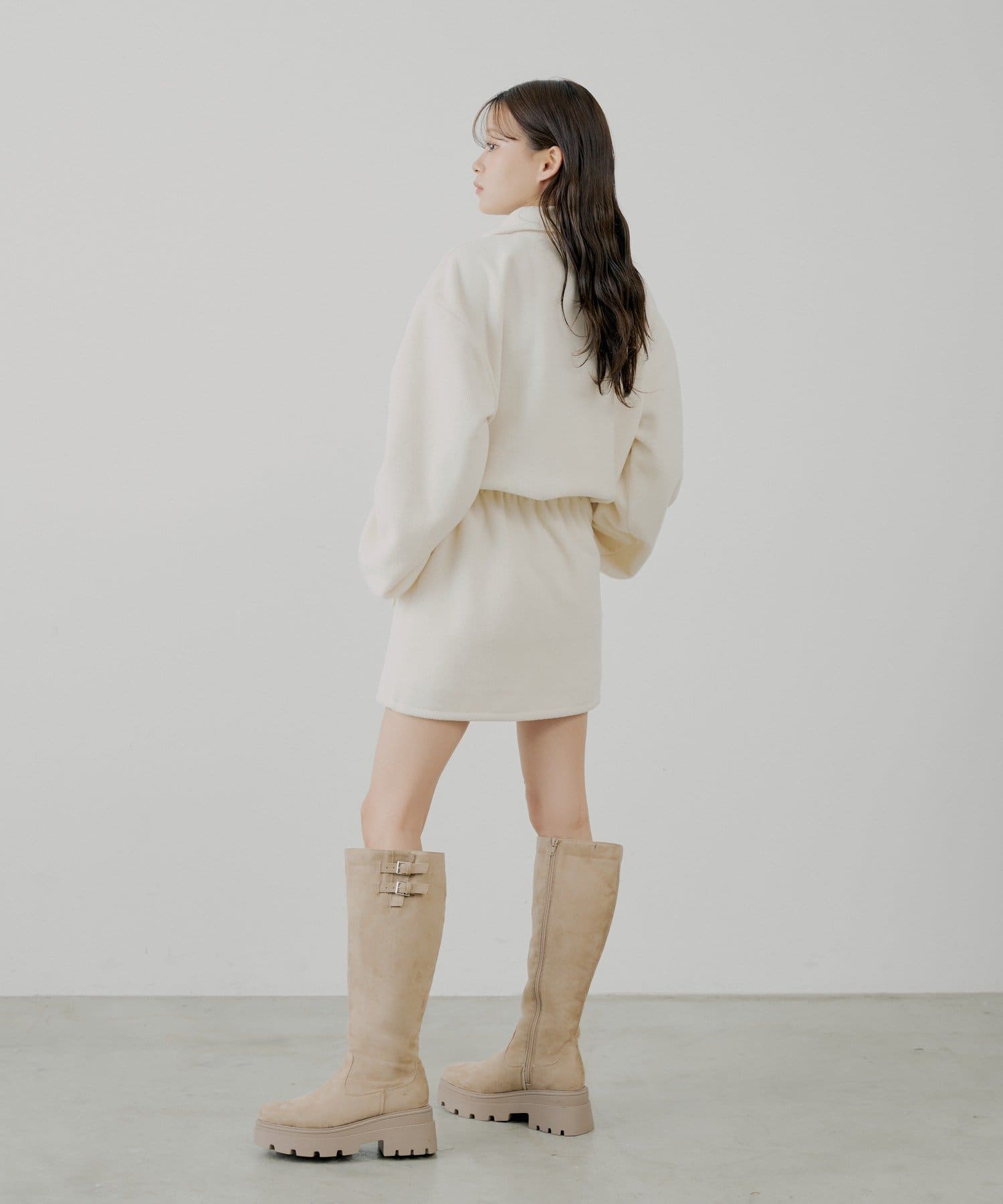 ・ミニ丈なので、足元はロングブーツと合わせたトレンド感のあるスタイリングがおすすめです。