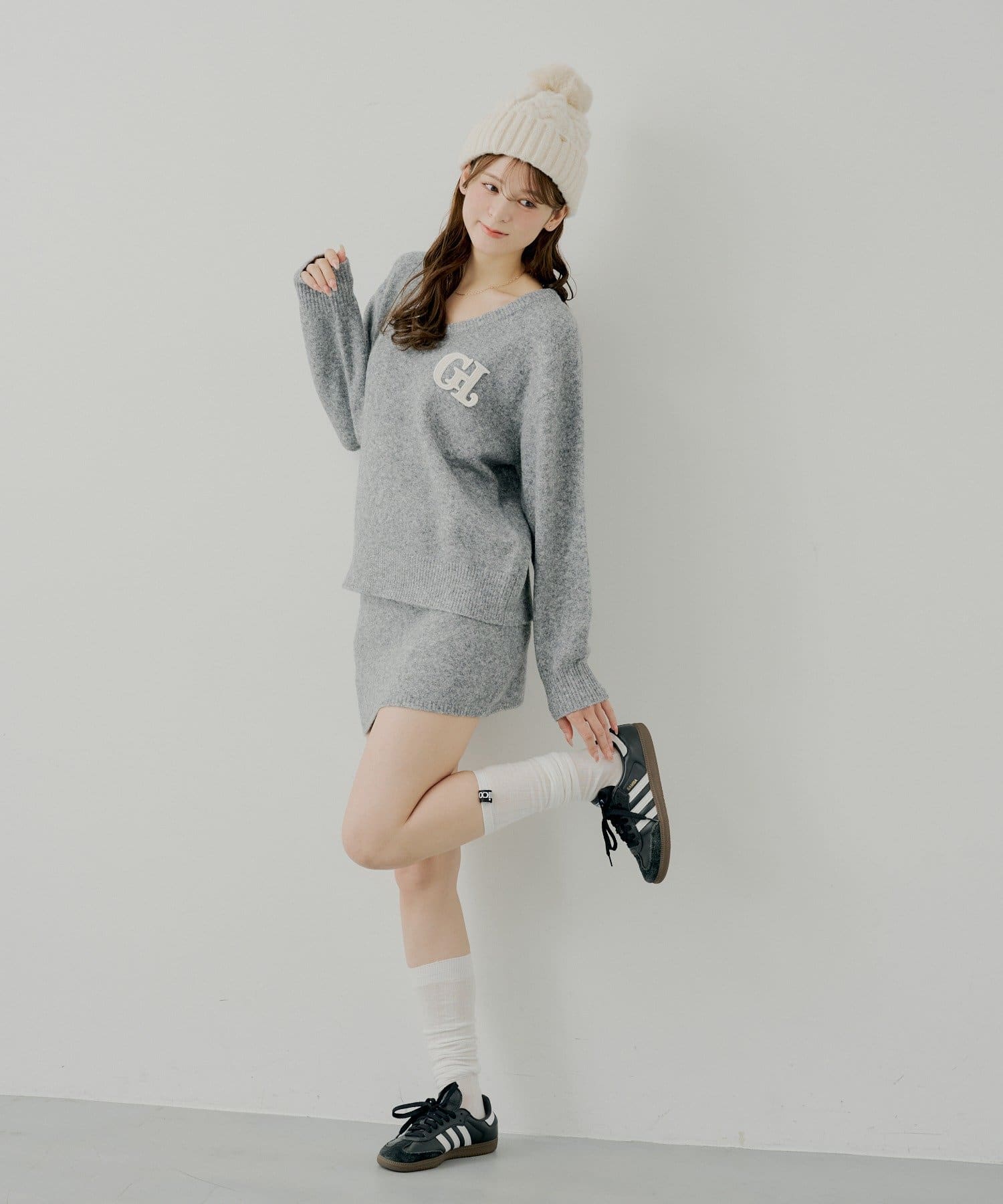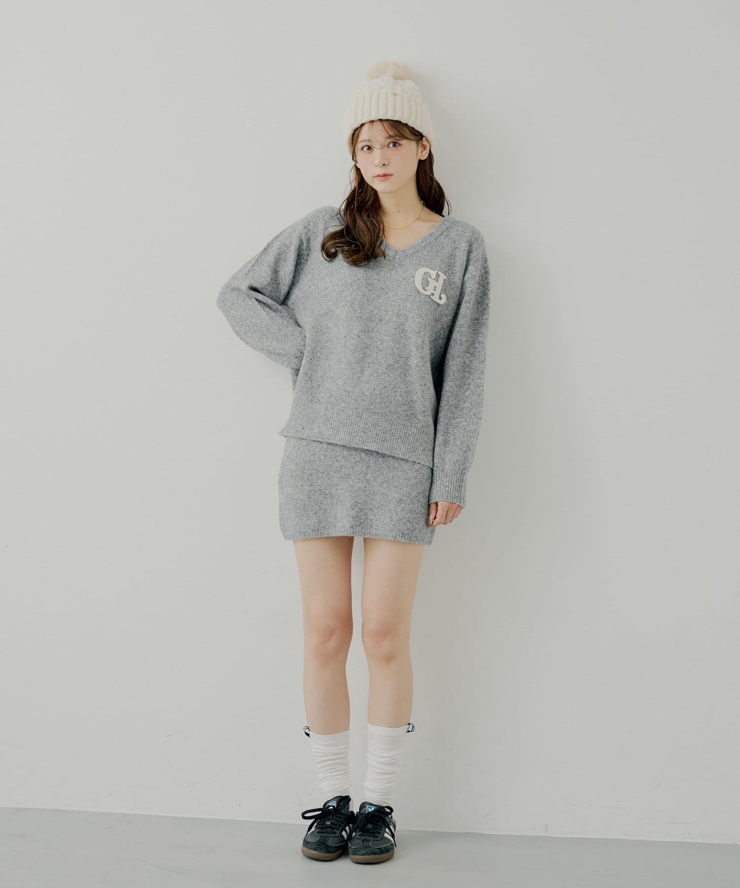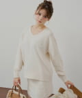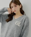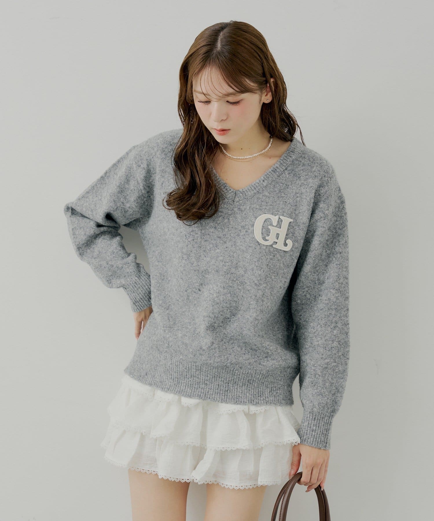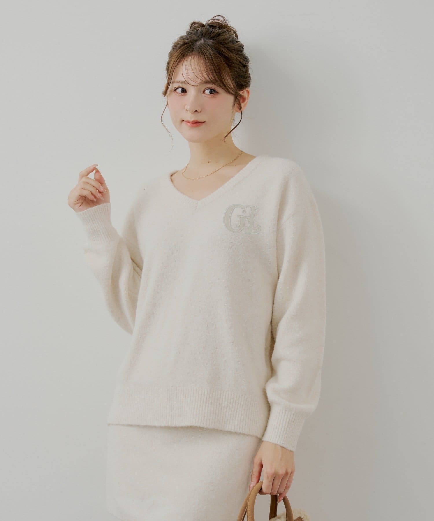 胸元のワンポイントロゴが、大人の可愛らしさを引き立てるVネックニット登場!