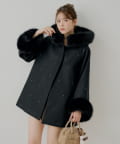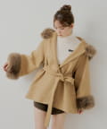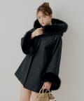 ・ふわふわのファーがあしらわれたフードと袖口は、顔周りを華やかに彩り、上品な女性らしさを引き立てます。