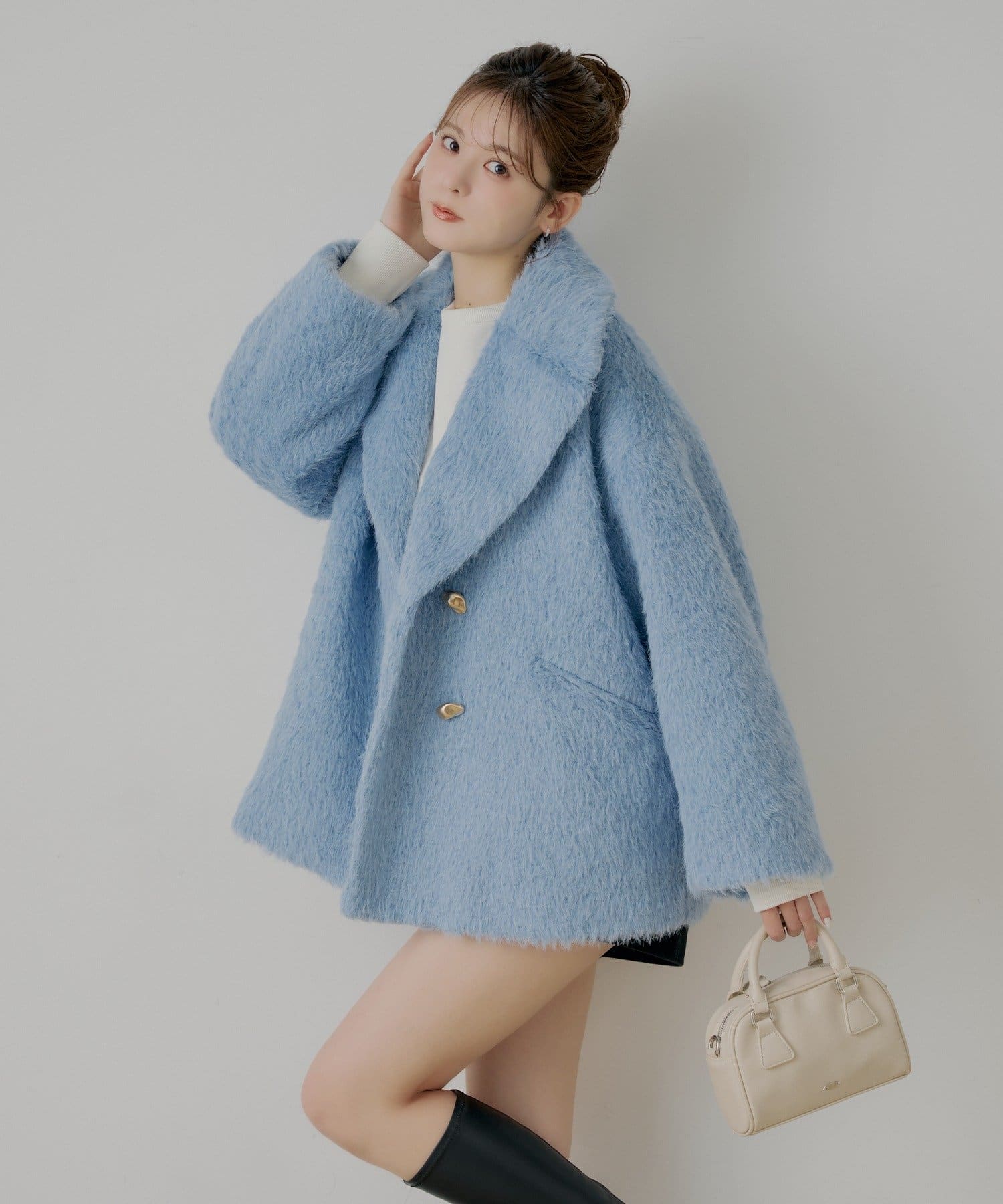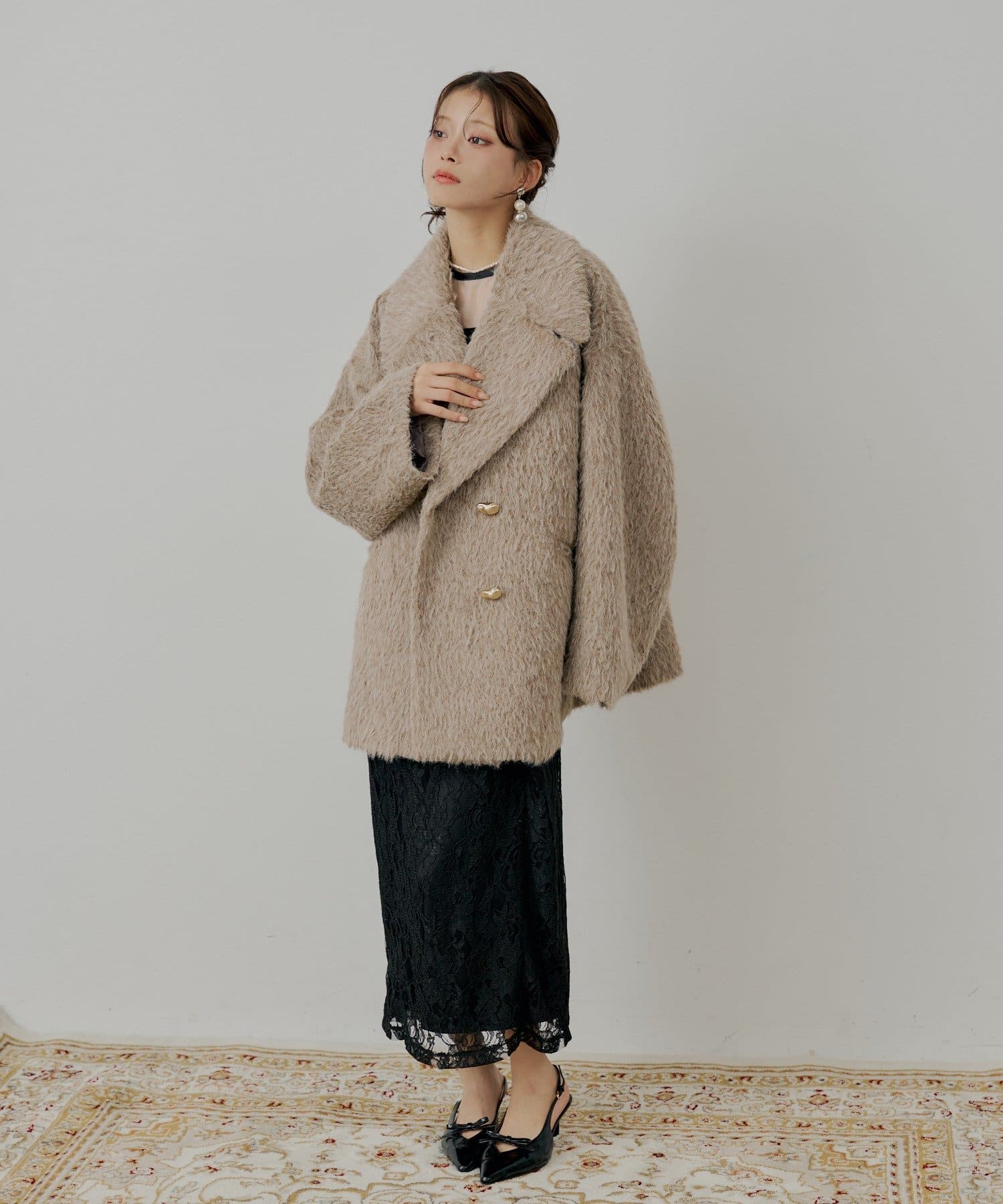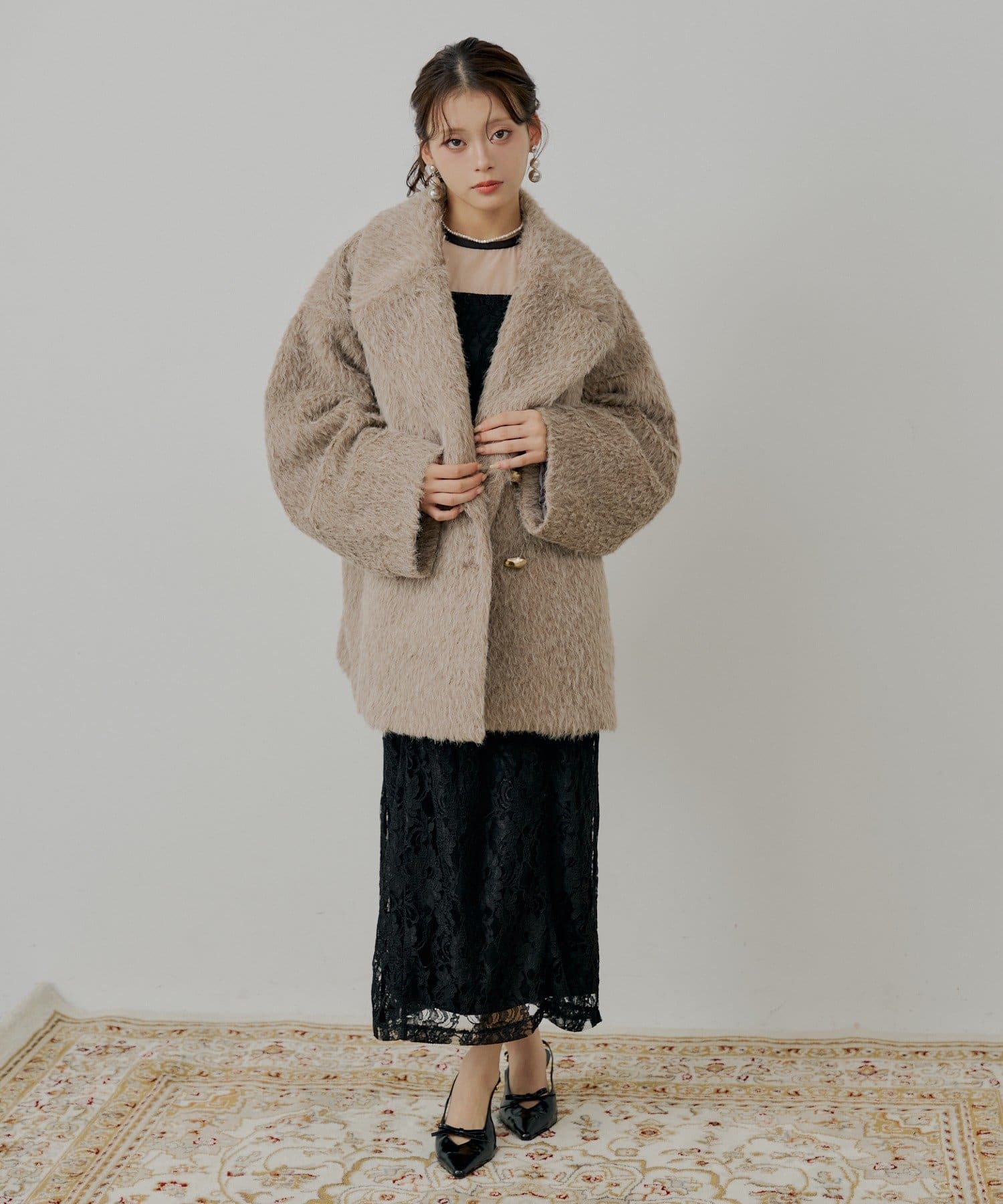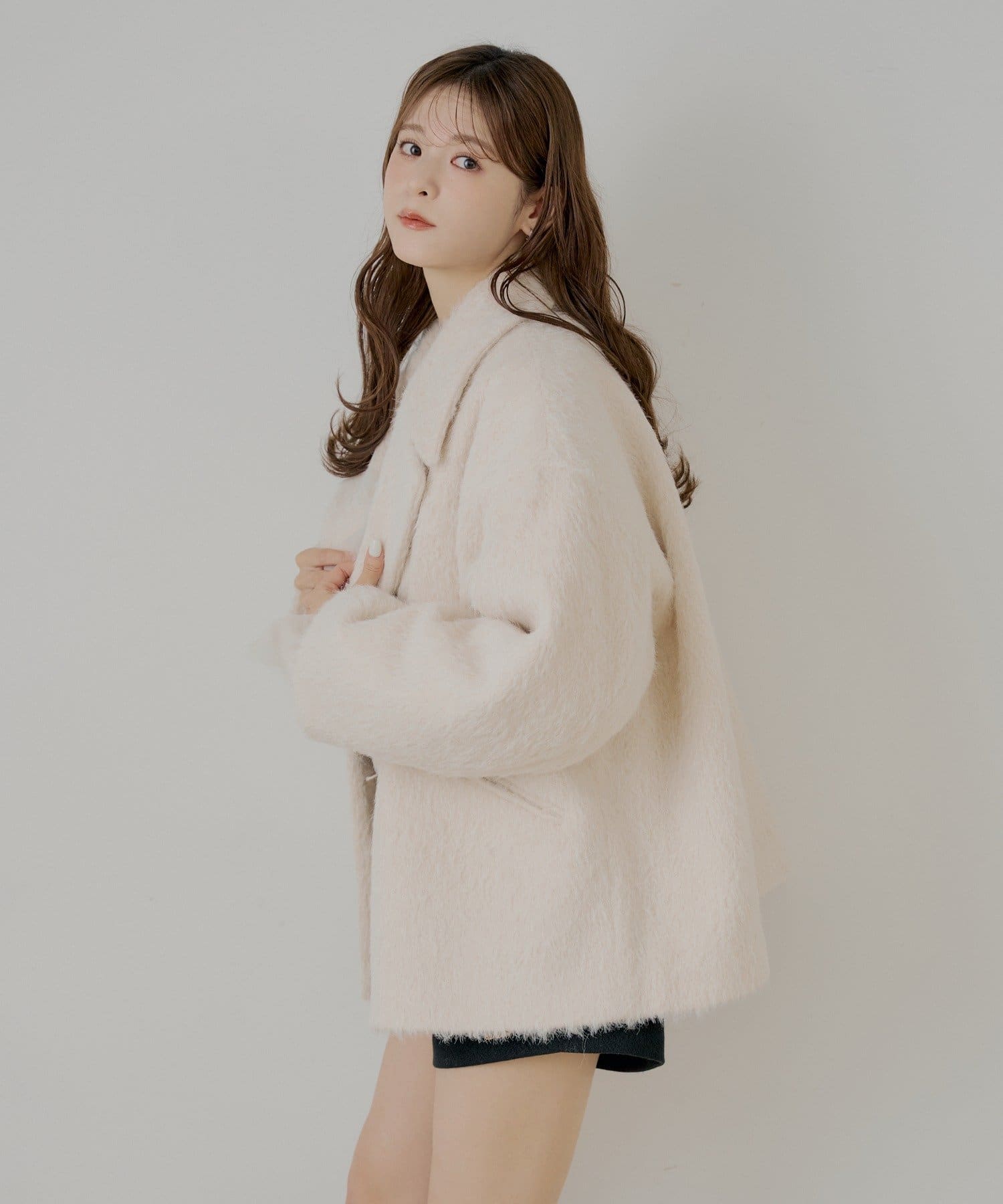 ・ふわふわのシャギー素材が、見た目にもあたたかいミディ丈のジャケットコート。
