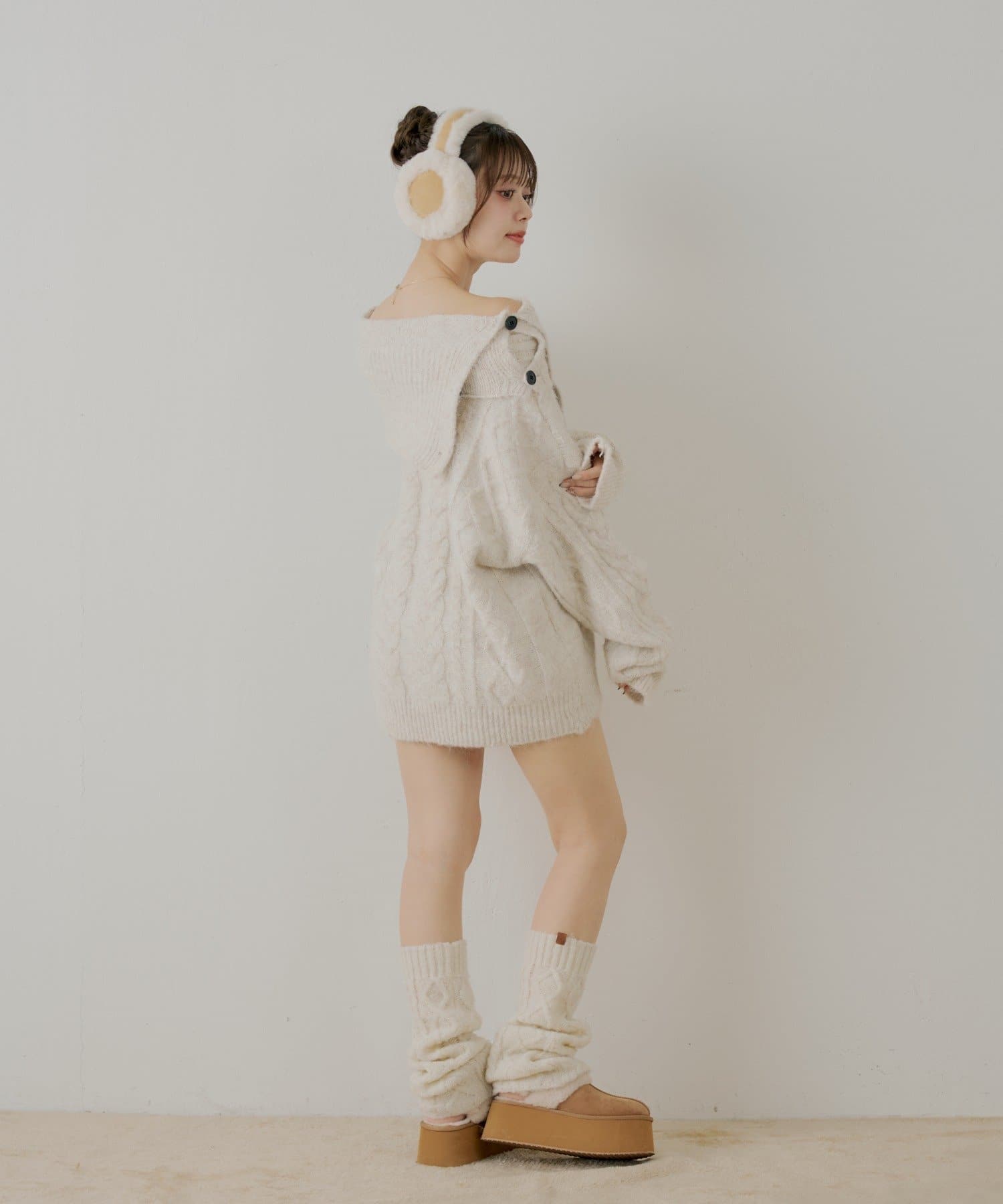 ・足元はレッグウォーマー+ムートンサボでトレンド感のあるスタイリングにも。