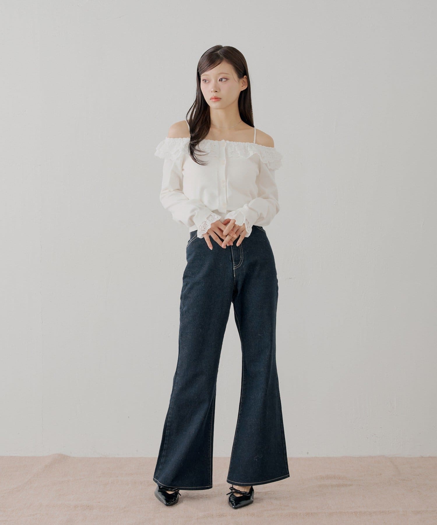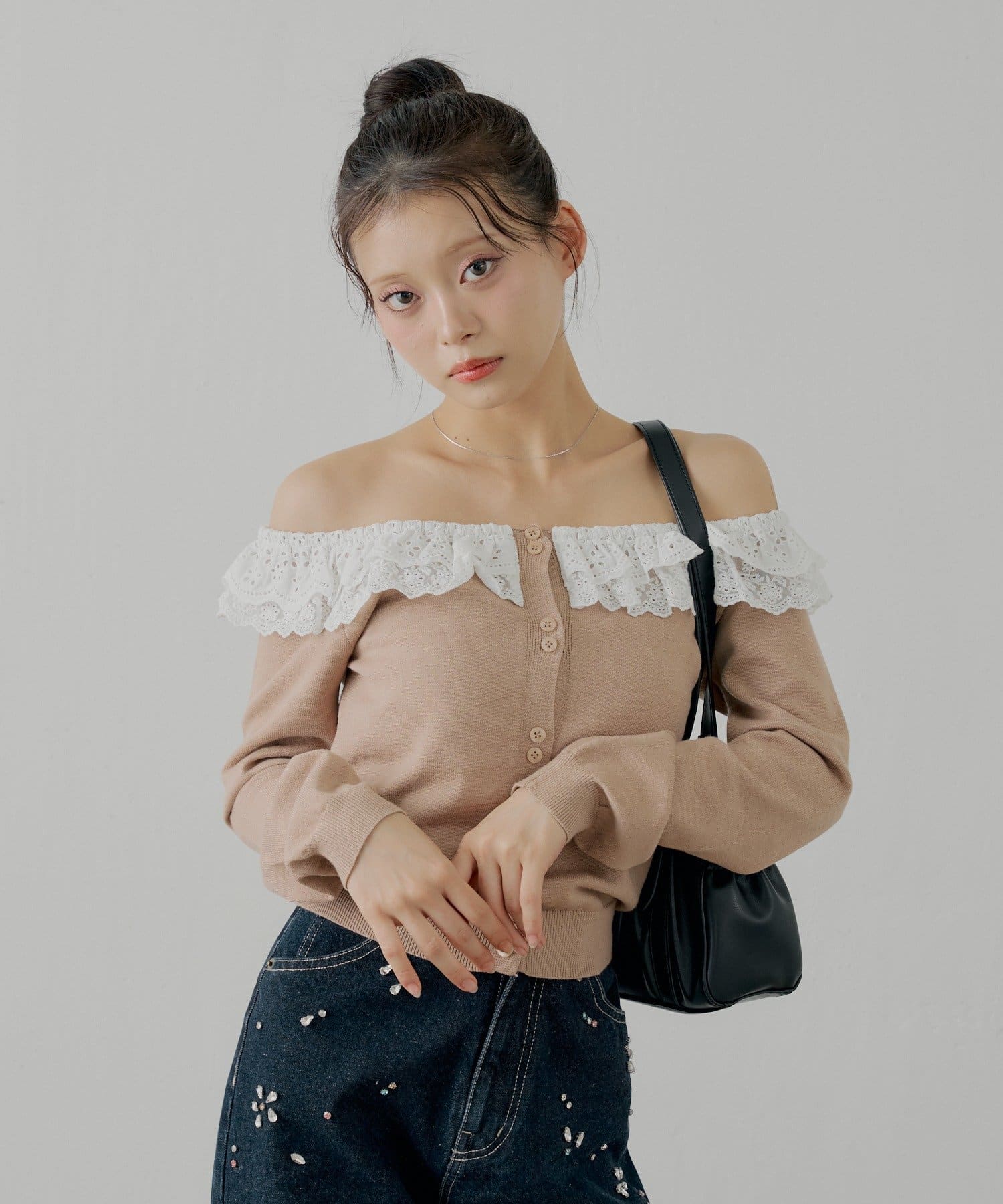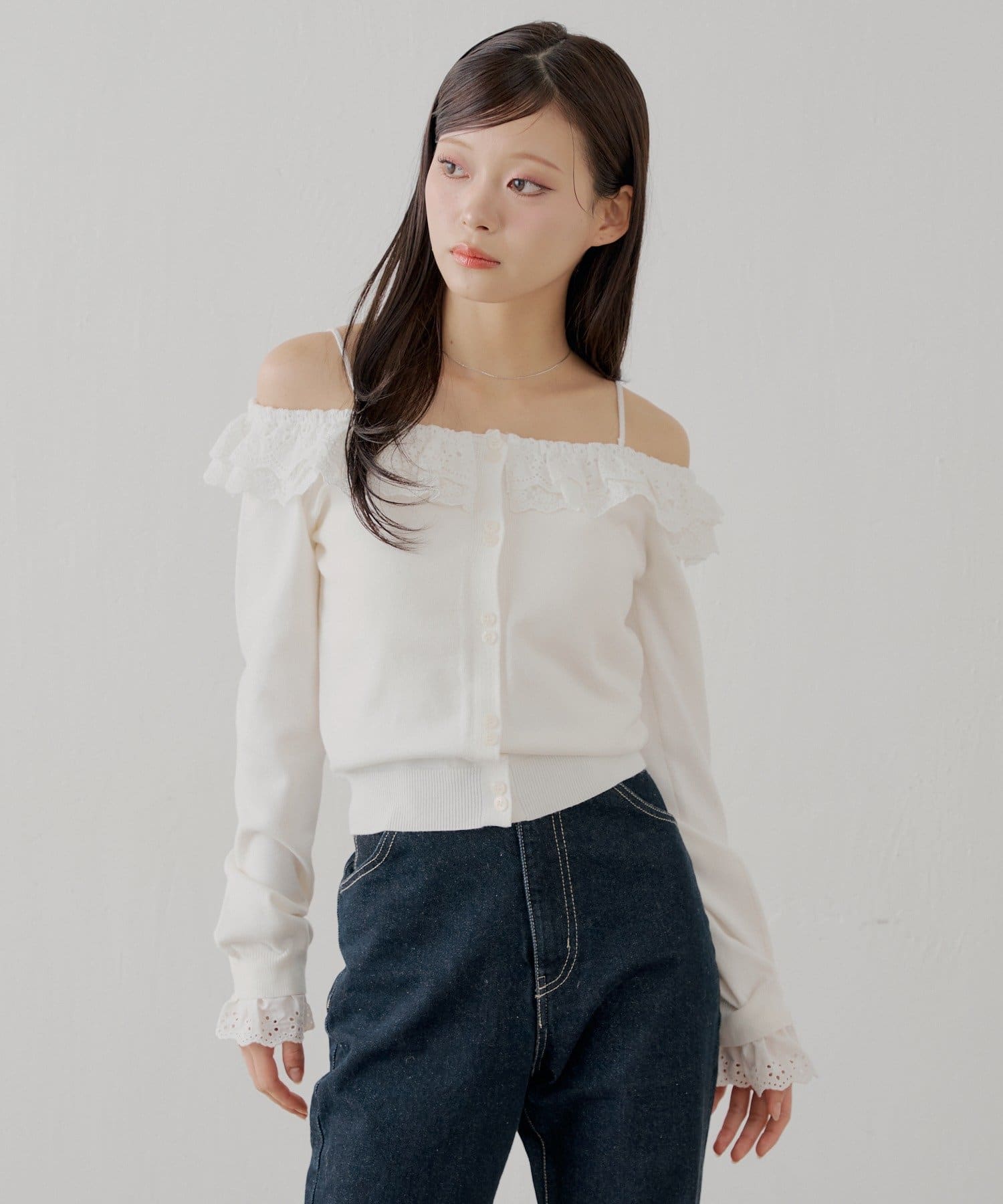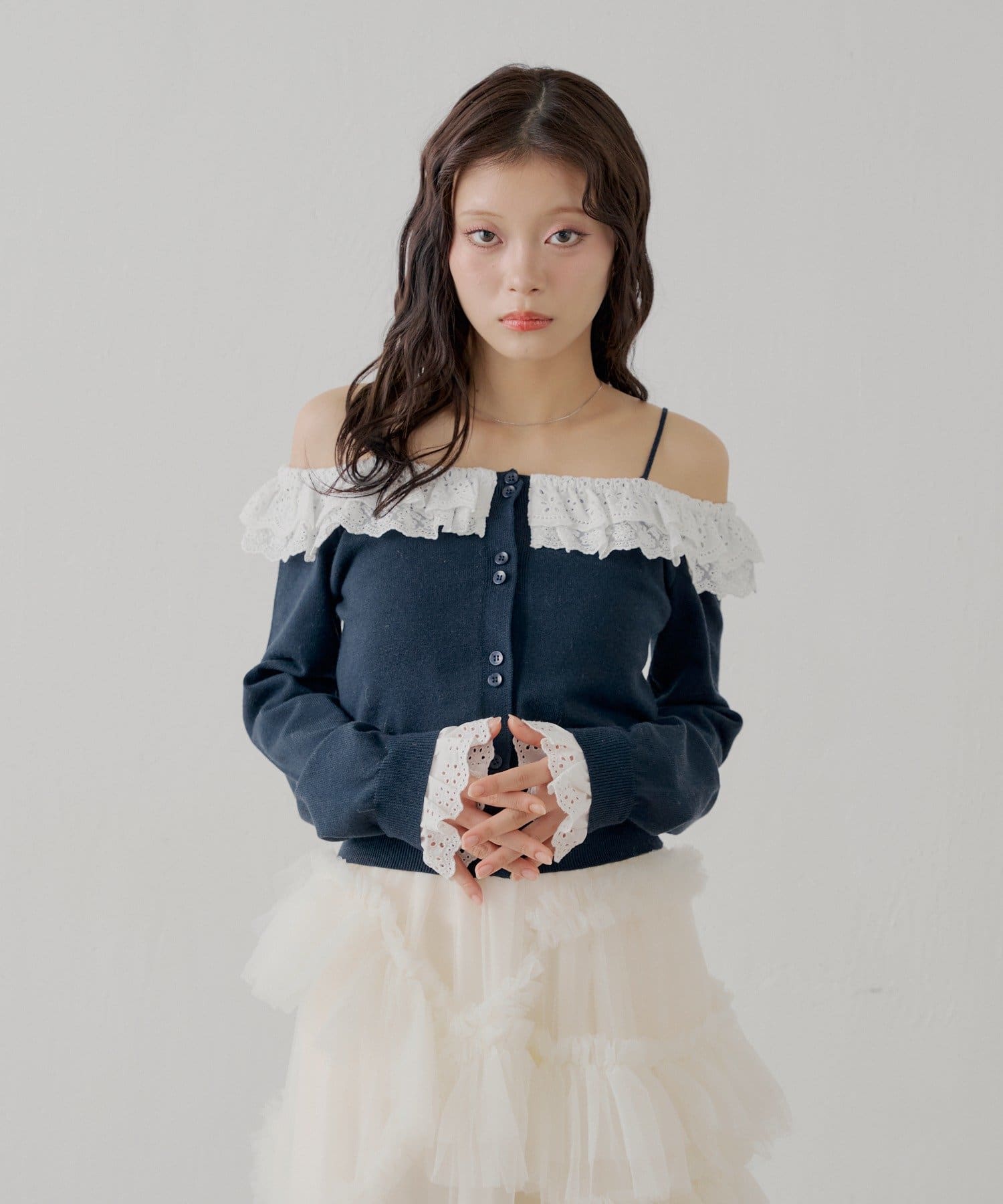 ・繊細なレースを贅沢にあしらった、レディライクなオフショルカーディガン。