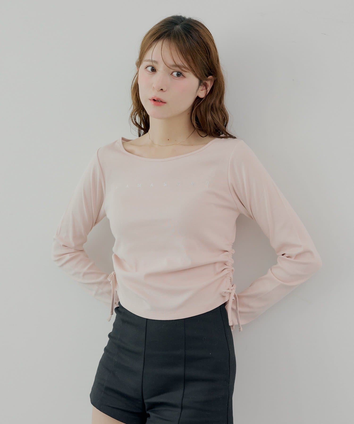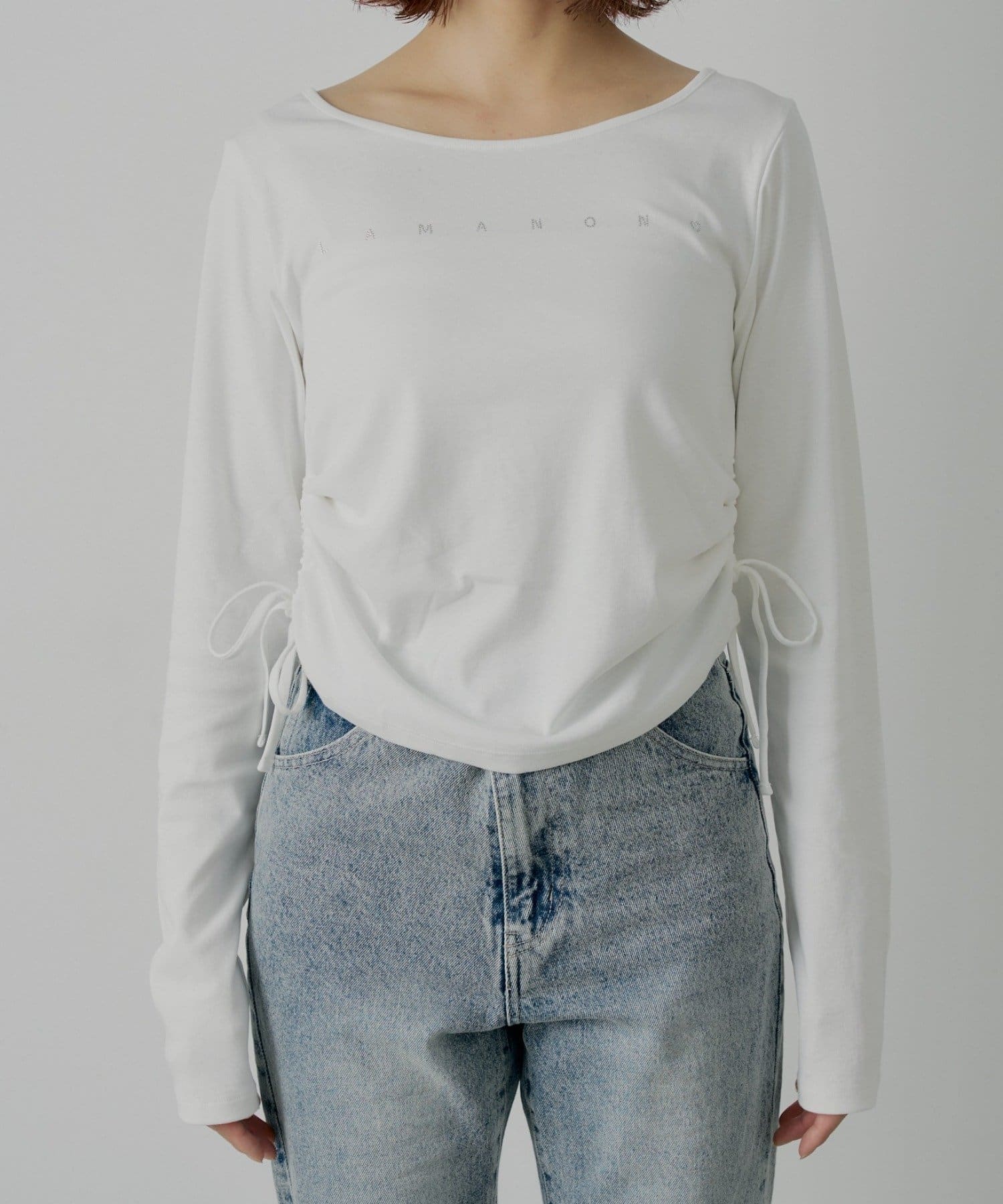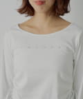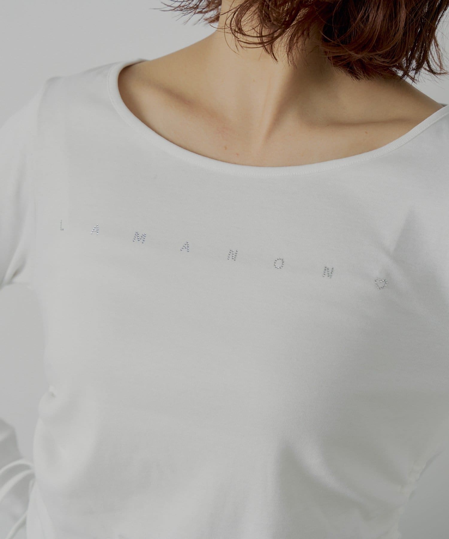 ・胸元にあしらわれたラインストーンが目を惹くロゴロンT。