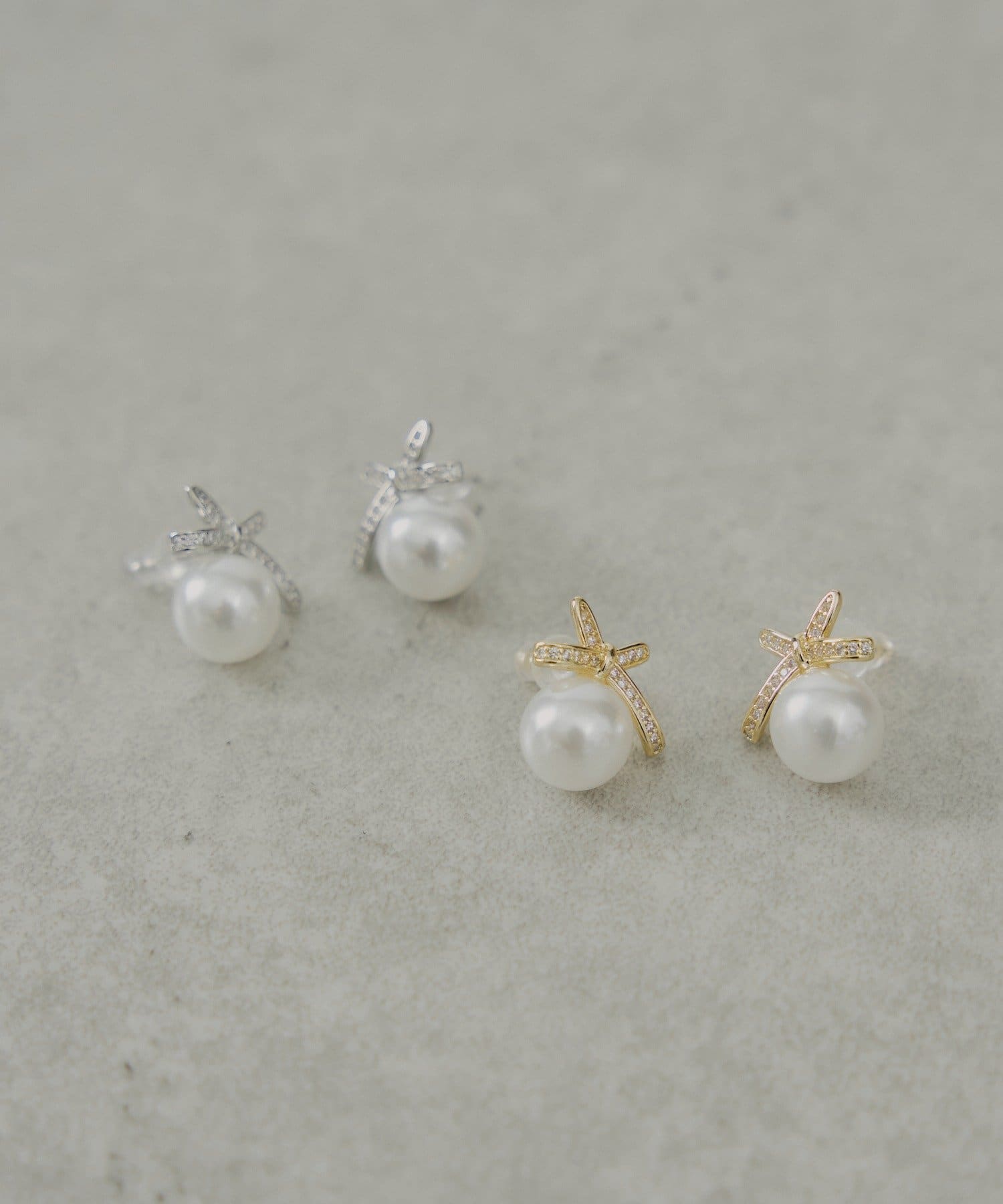 ・ふっくらとしたパールと、繊細なリボンモチーフの組み合わせが、大人の可愛らしさを引き立てるピアス。