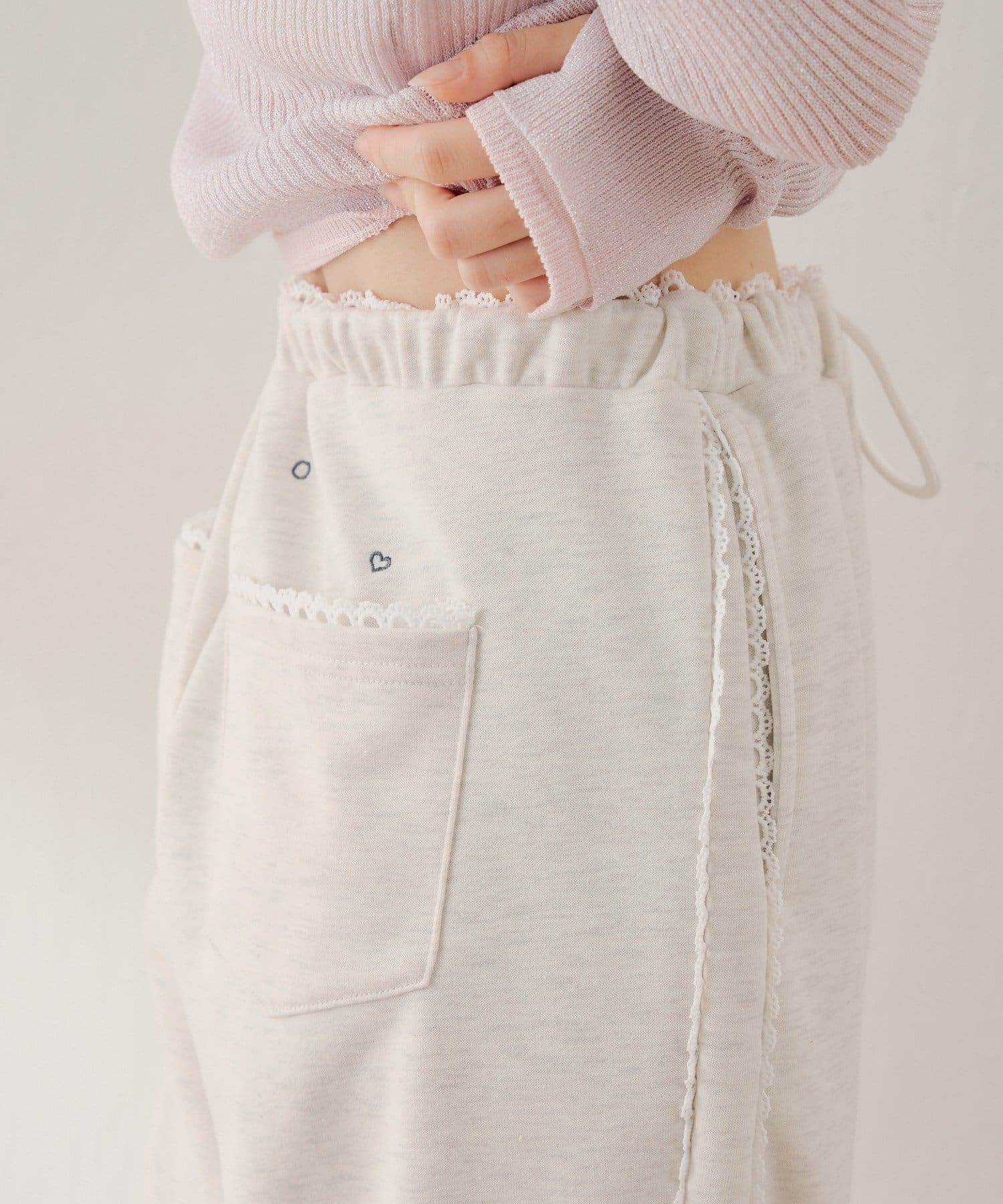 ・リラックス感のあるスウェットパンツに、繊細なレースをあしらったスウェットパンツ。