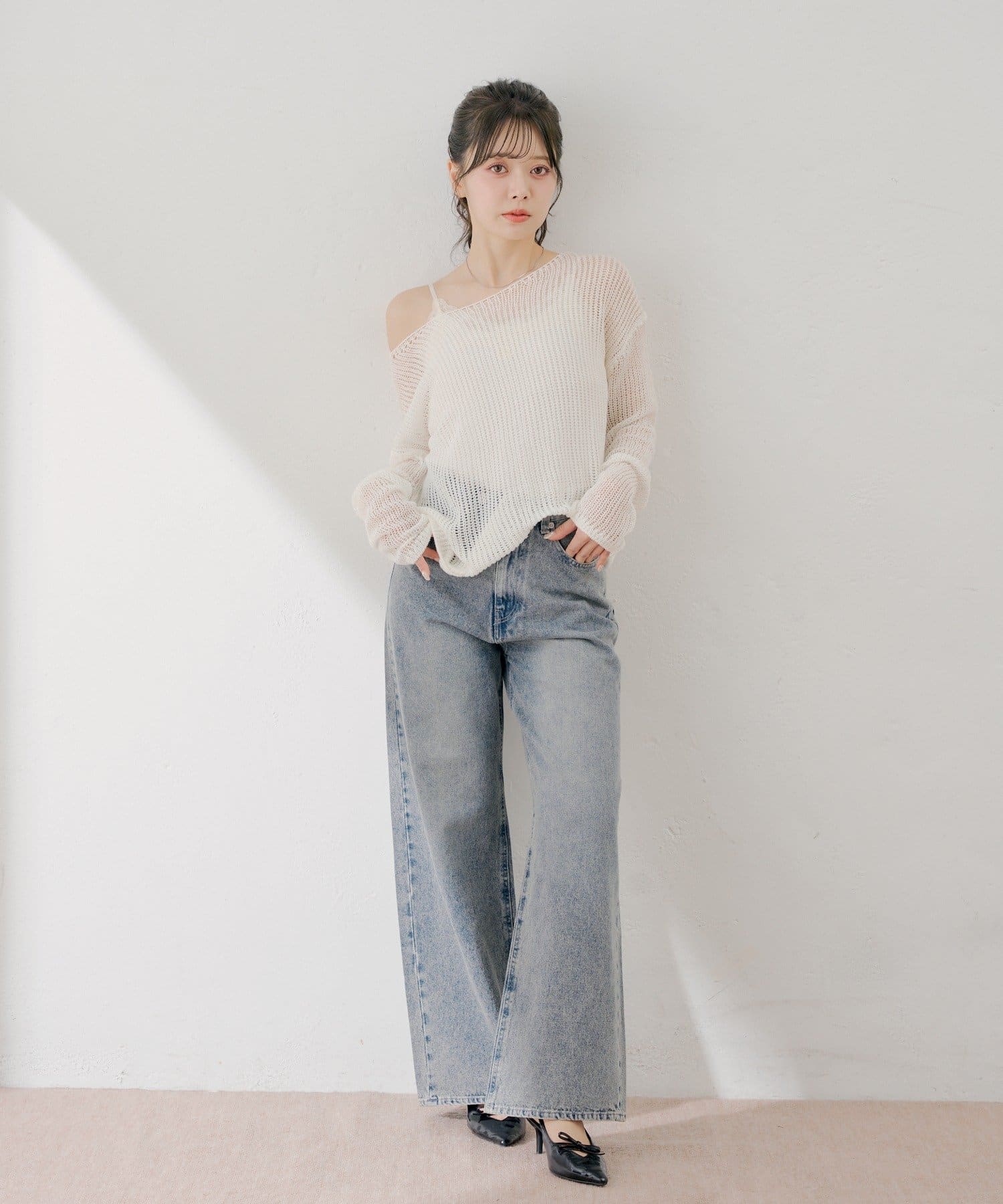 ・ヒールを合わせると足元に華奢さがプラスされて女性らしく仕上がります。