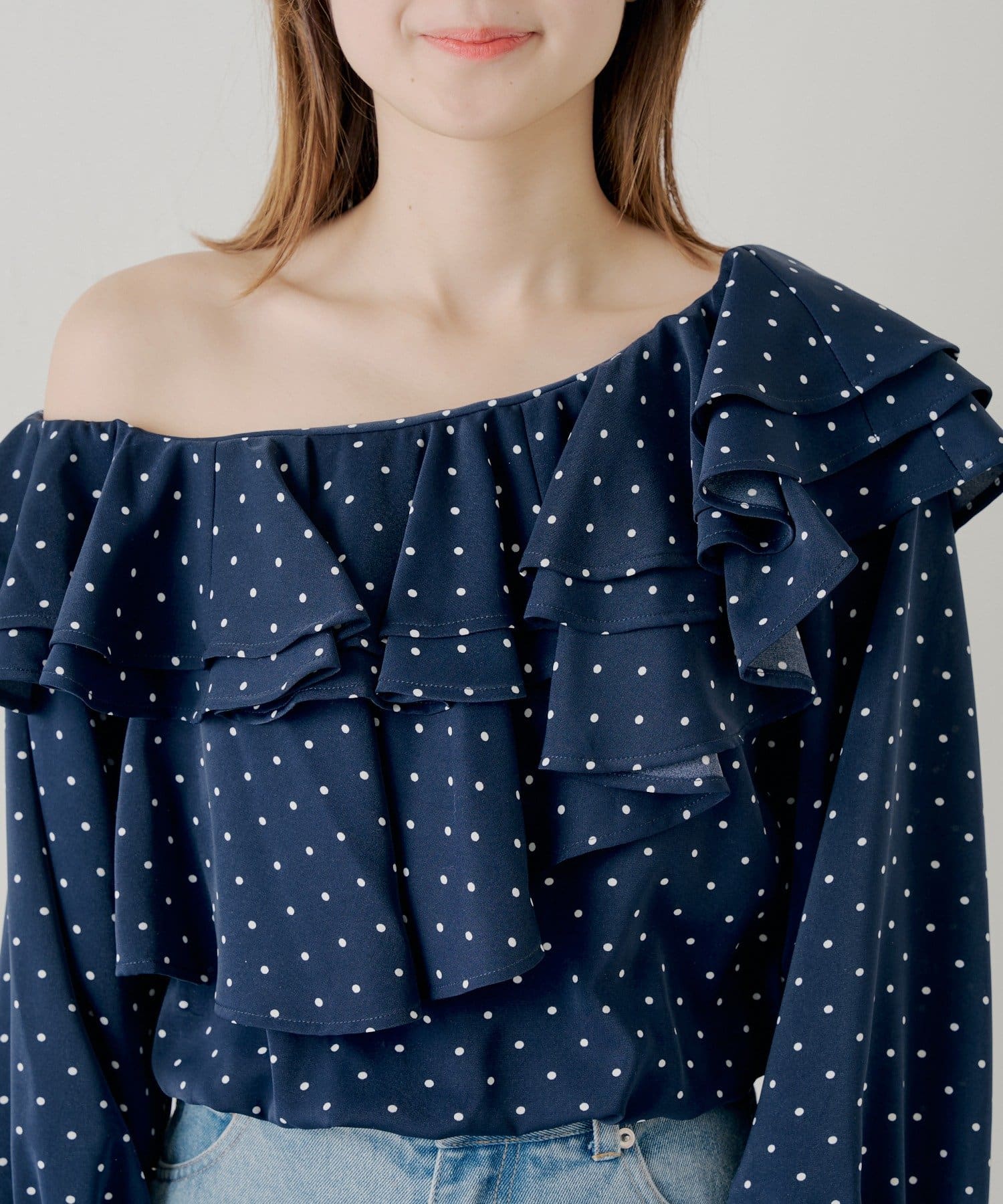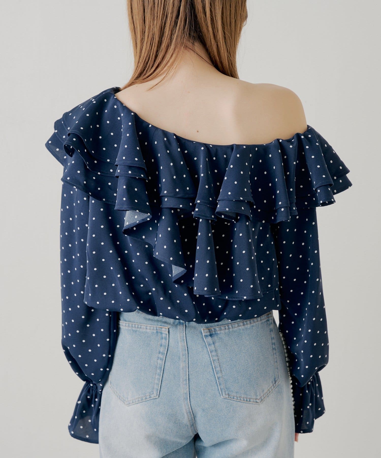 ドット柄とワンショルデザインが目を惹くフリルブラウス登場!