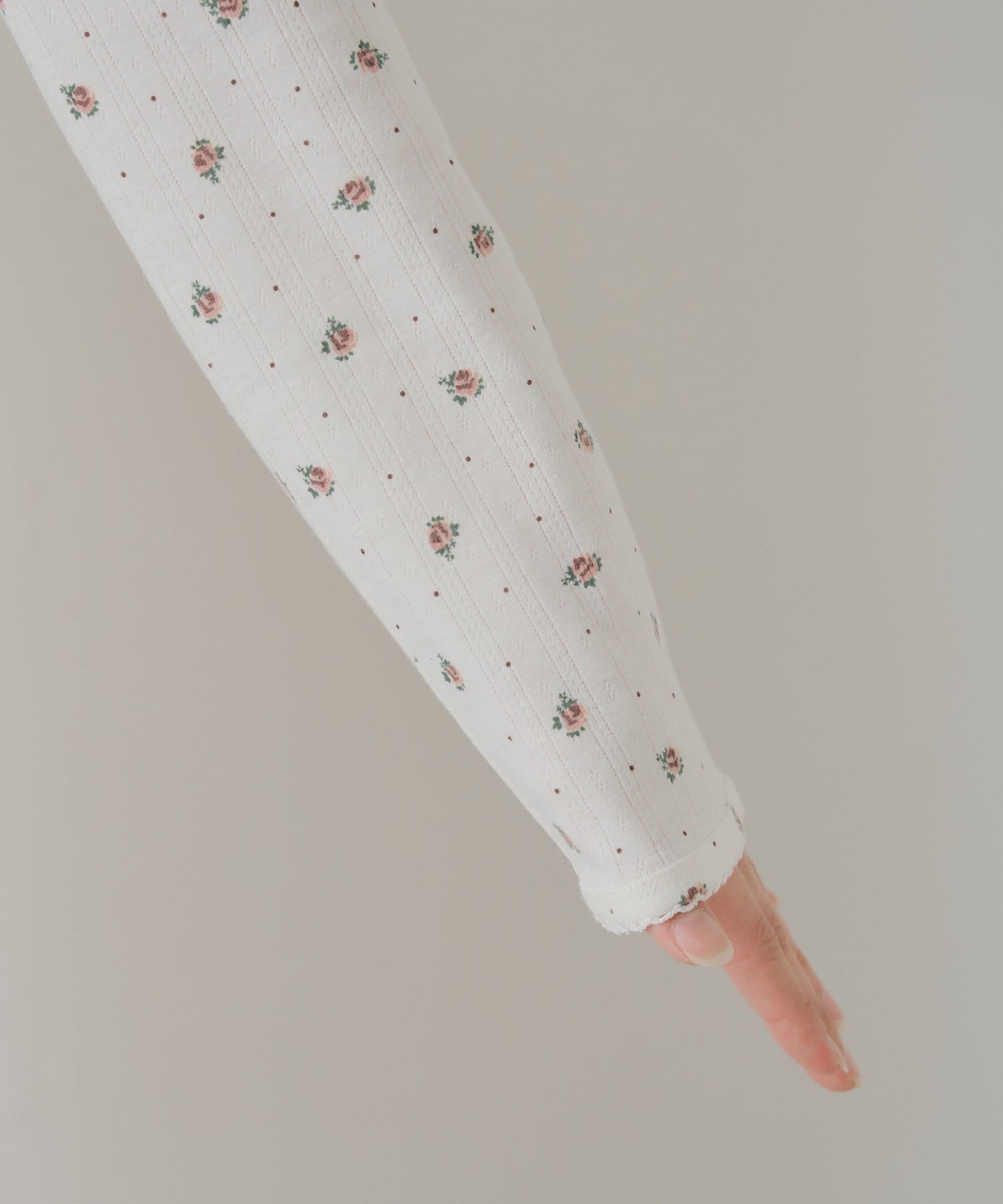 ・ネックラインと袖口には、さりげないレースがあしらわれており、フェミニンな雰囲気をプラス。