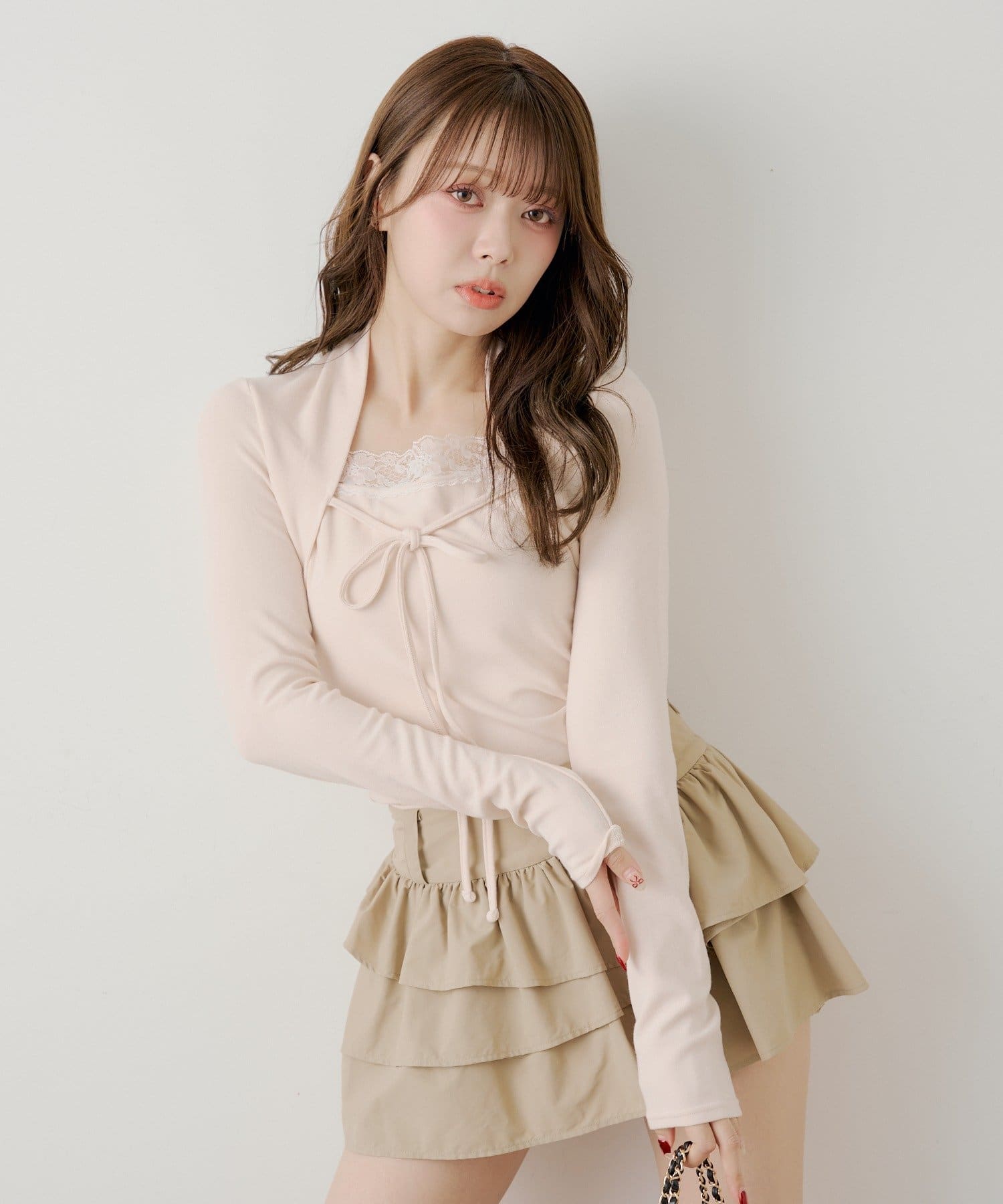 ・ミニボトムと合わせるとフェミニンなスタイルに仕上がります。