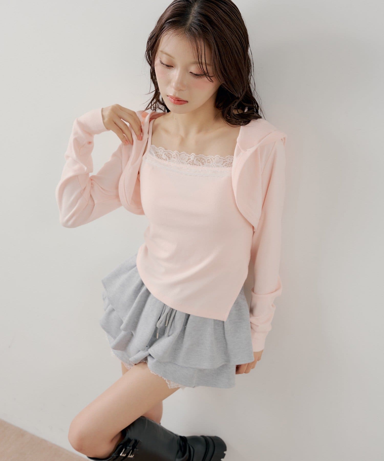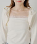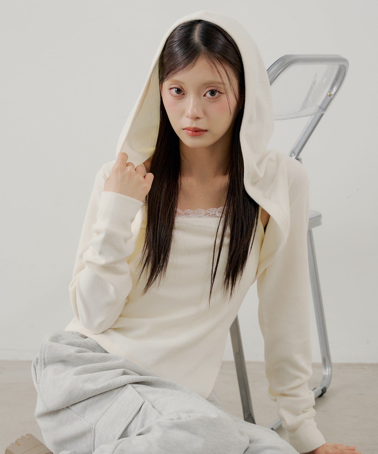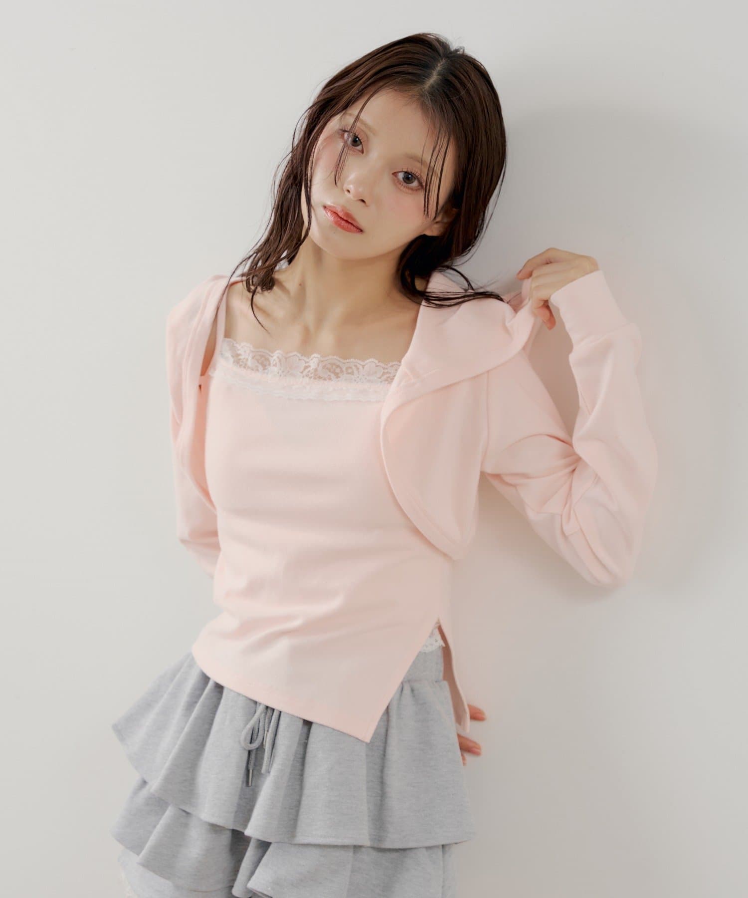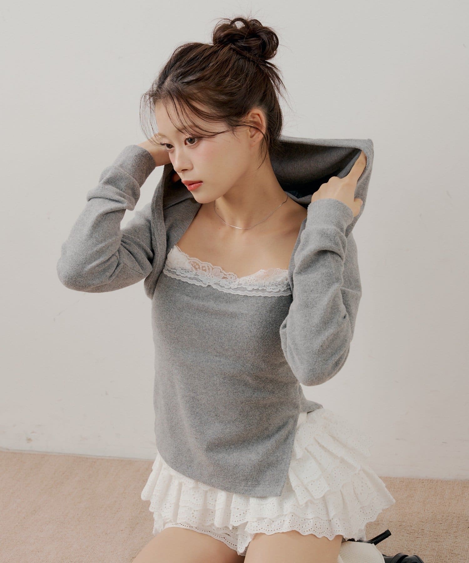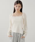 ・繊細なレースキャミとフード付きボレロの組み合わせで、甘すぎないこなれ感のあるスタイリングが叶います。