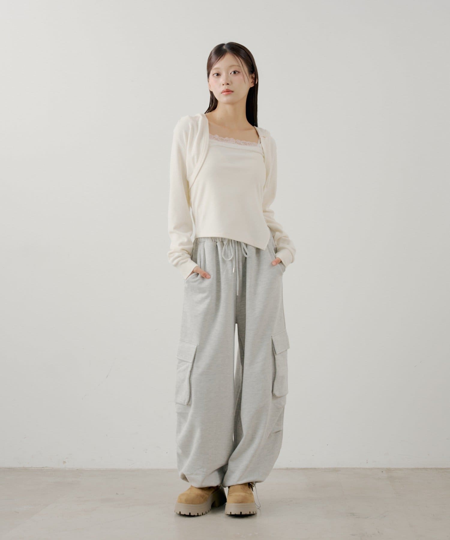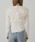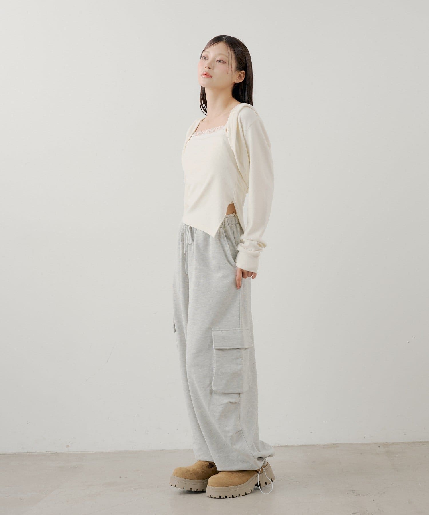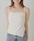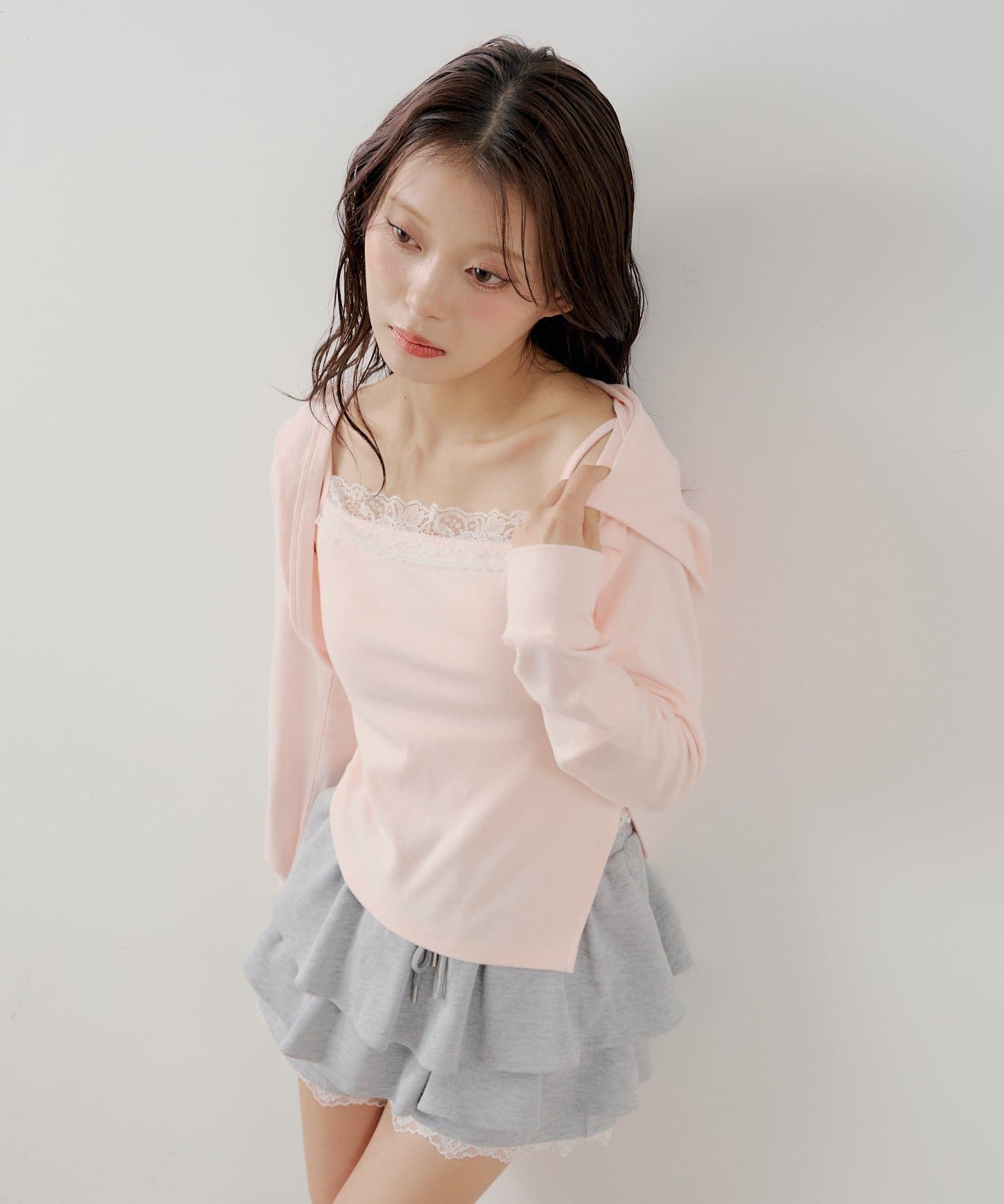 ・繊細なレースキャミとフード付きボレロの組み合わせで、甘すぎないこなれ感のあるスタイリングが叶います。