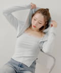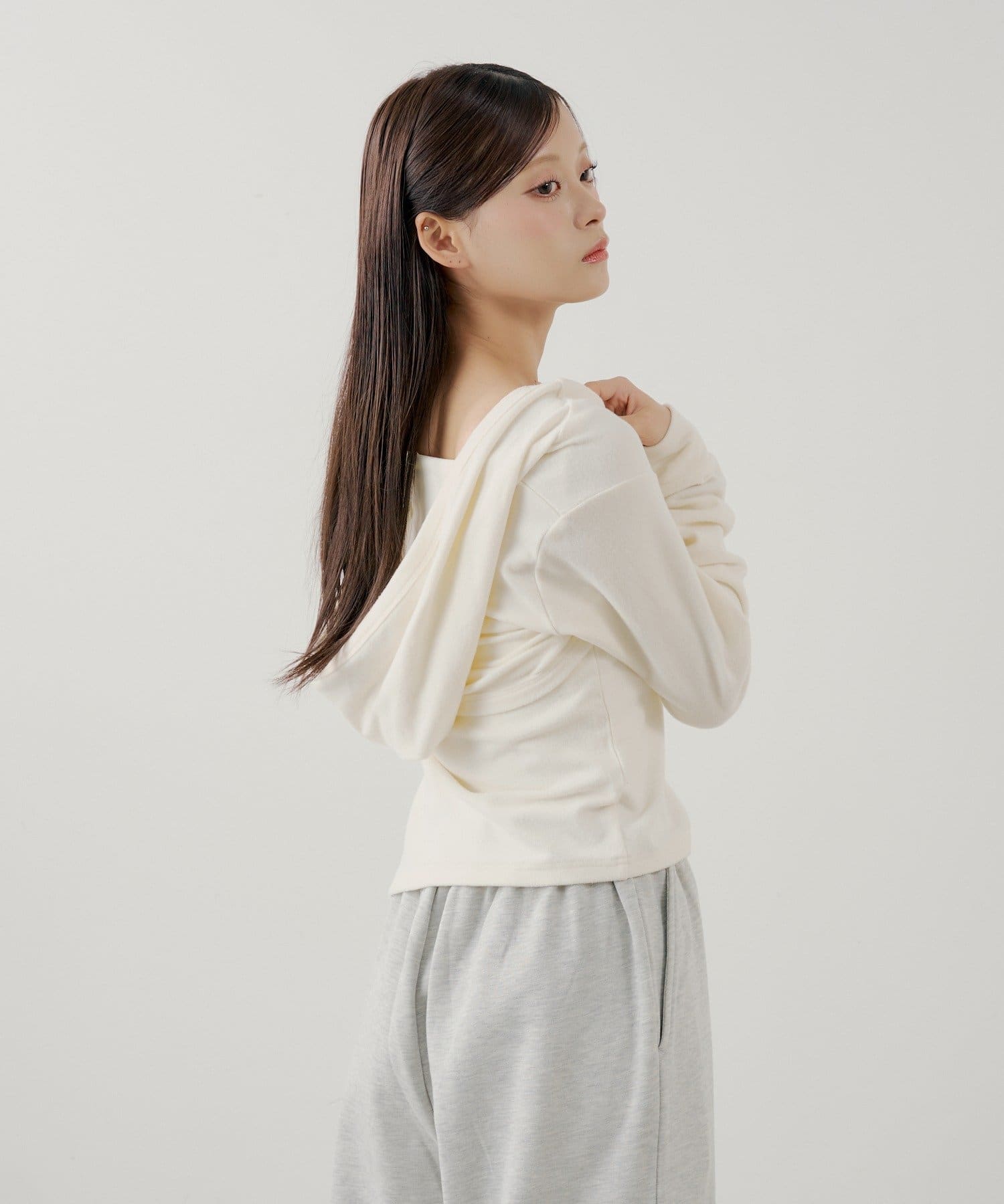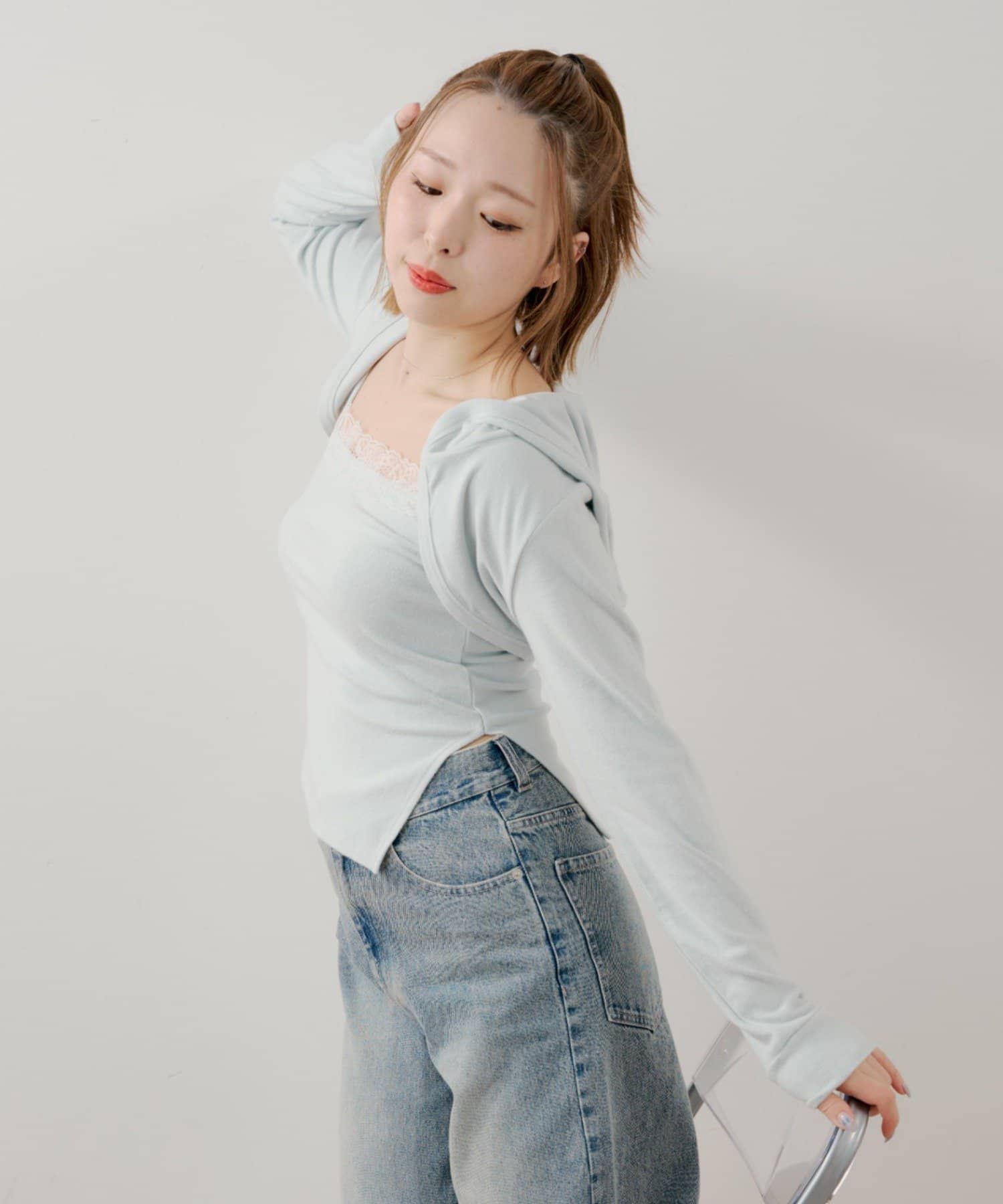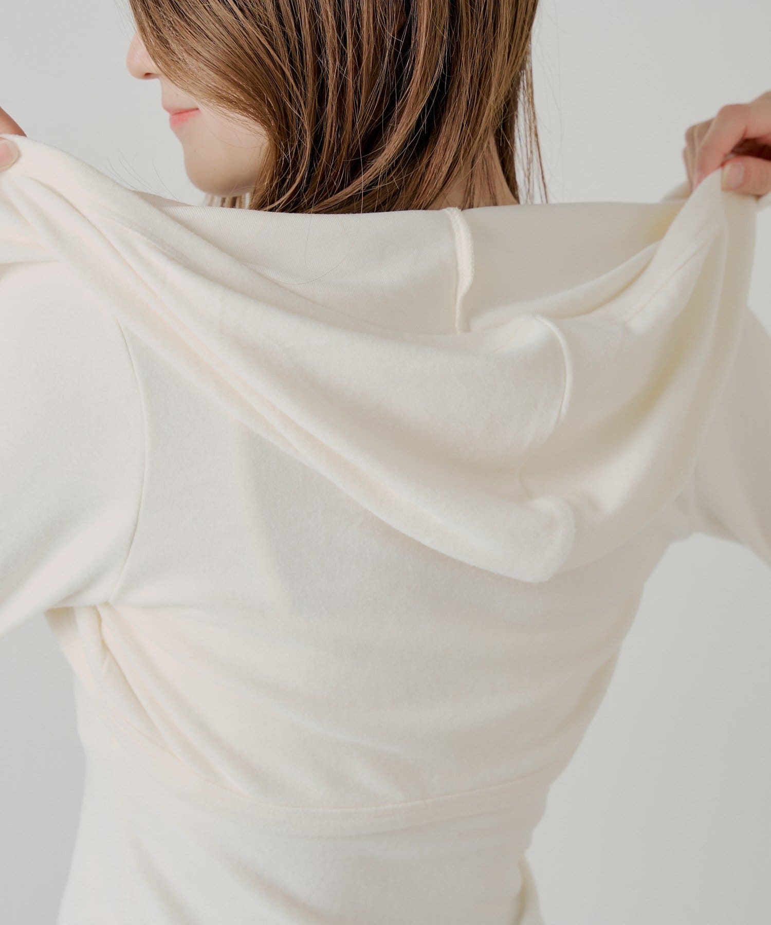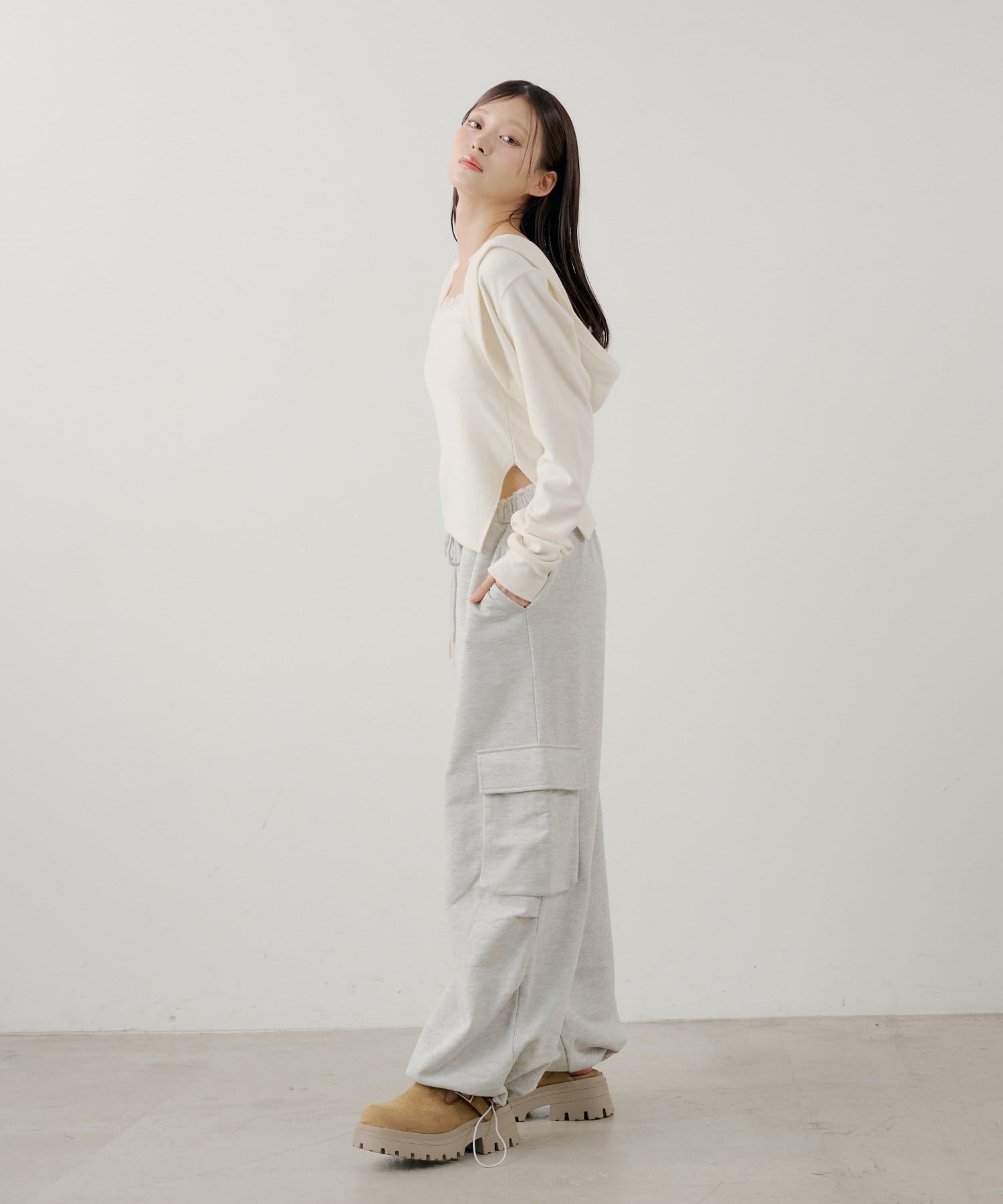・繊細なレースキャミとフード付きボレロの組み合わせで、甘すぎないこなれ感のあるスタイリングが叶います。
