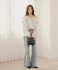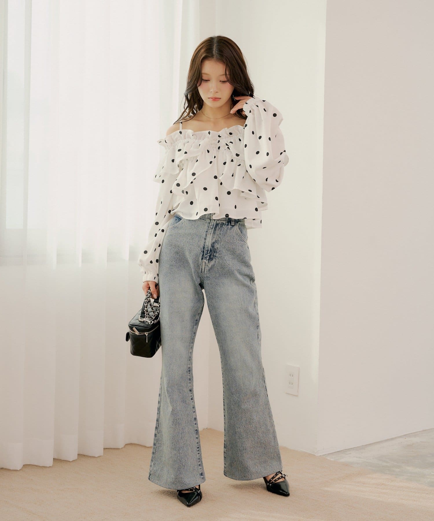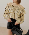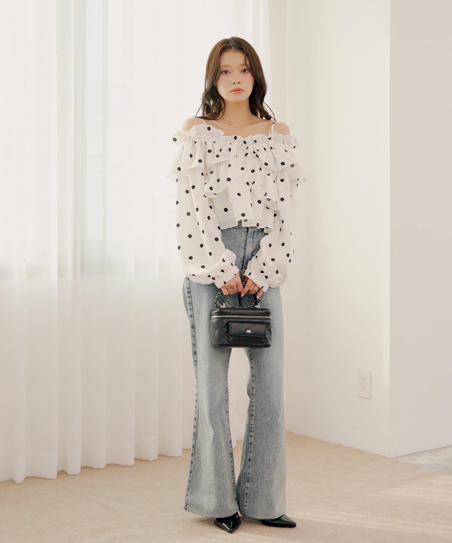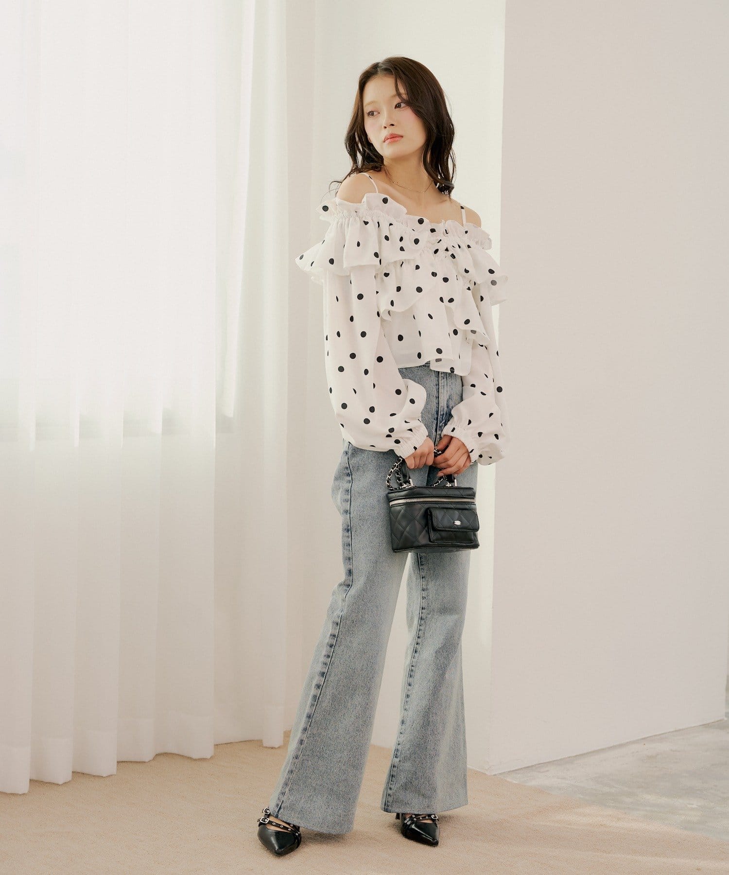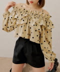 ドット柄が目を惹くオフショルフリルブラウス登場!