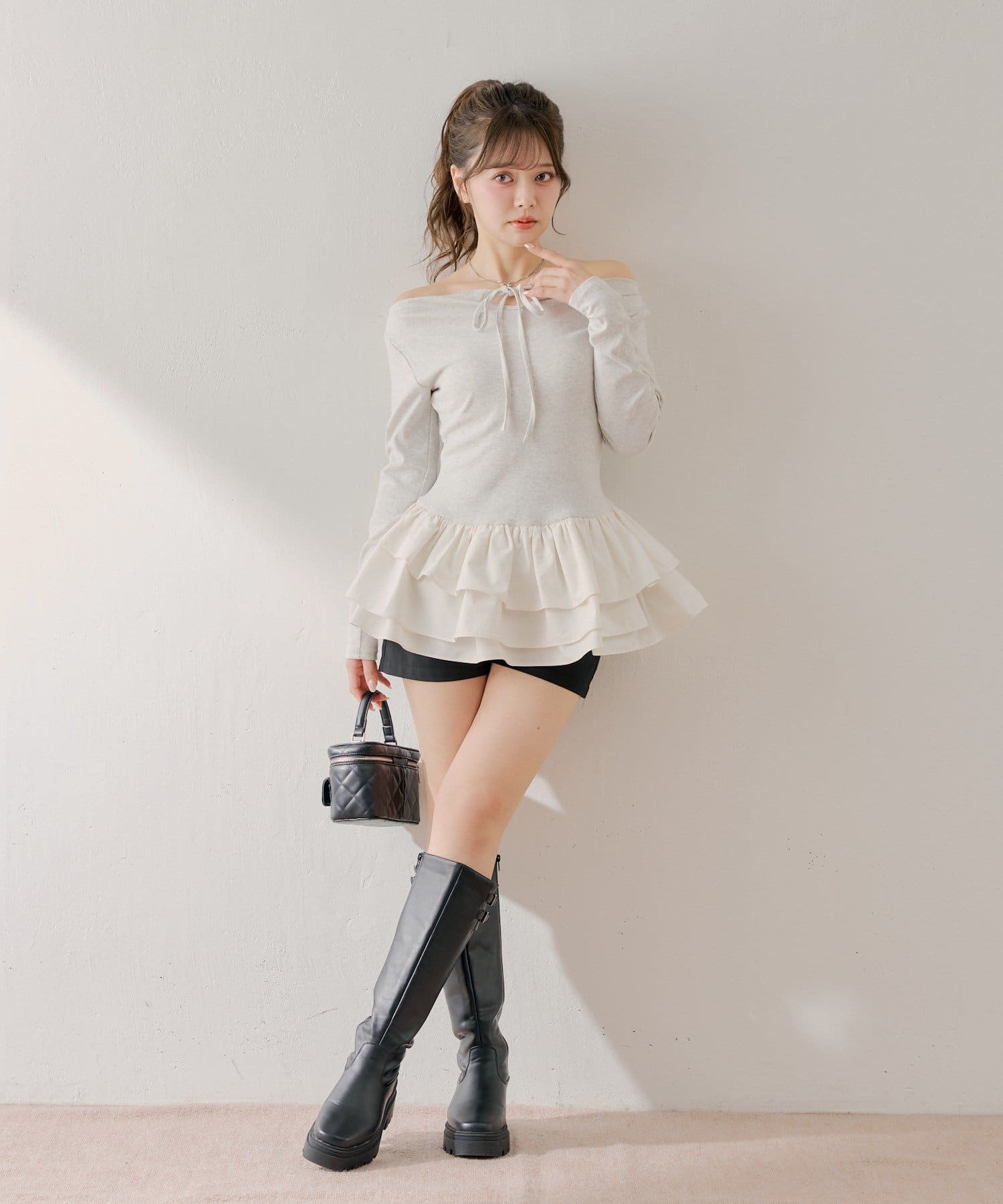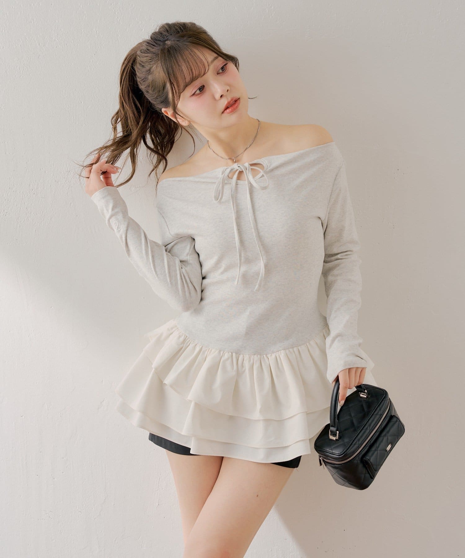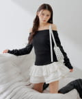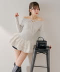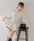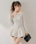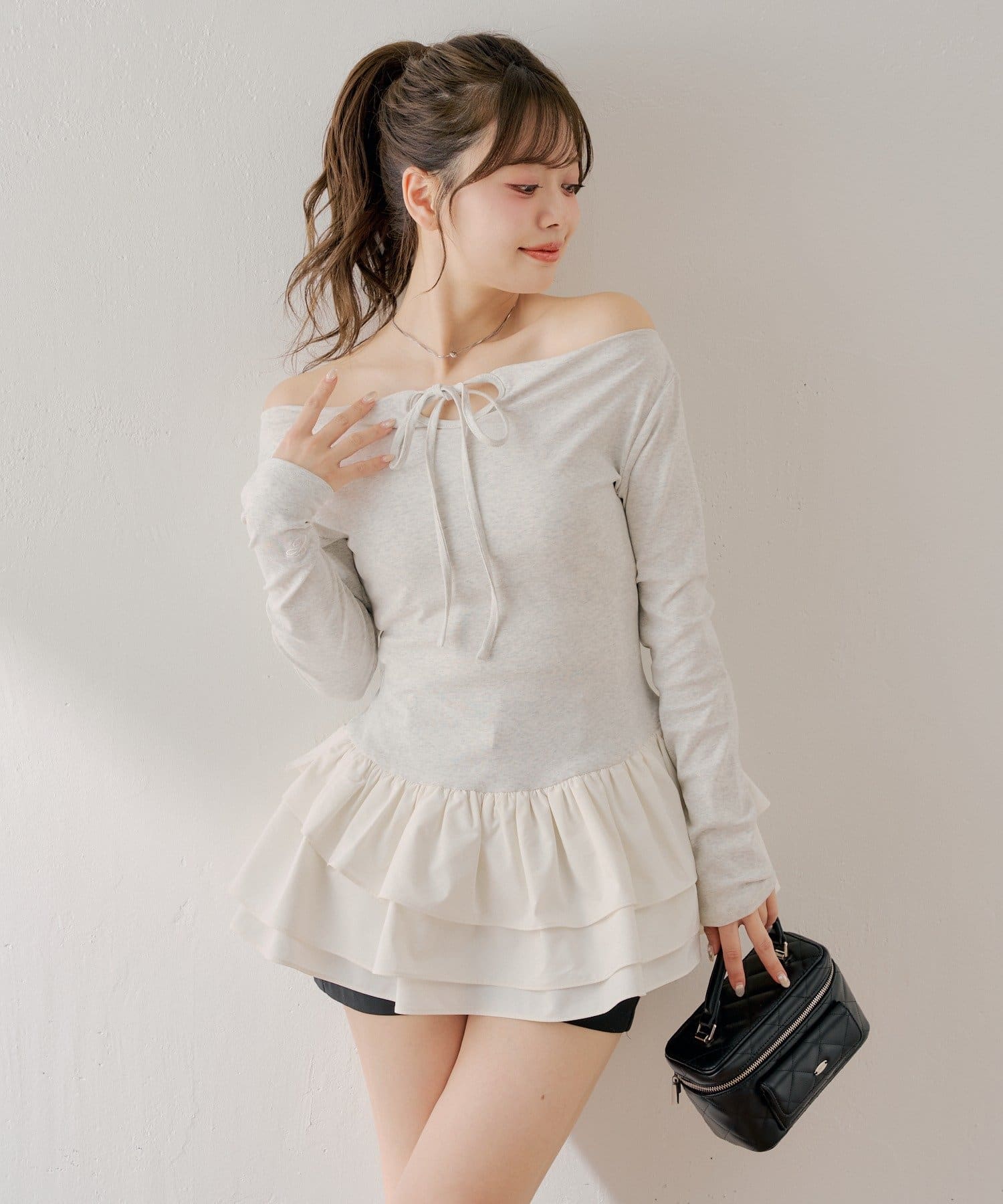 可愛いとスタイルアップを叶えるフリルティアードオフショルチュニック