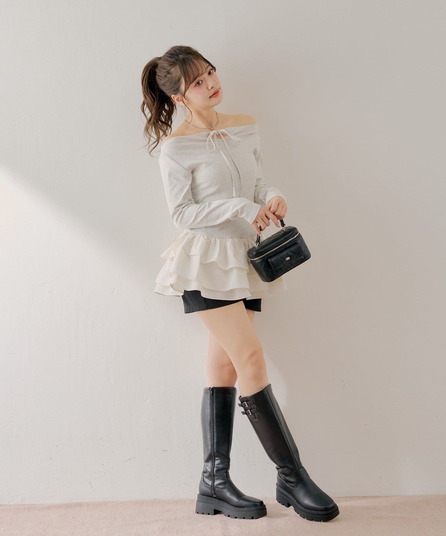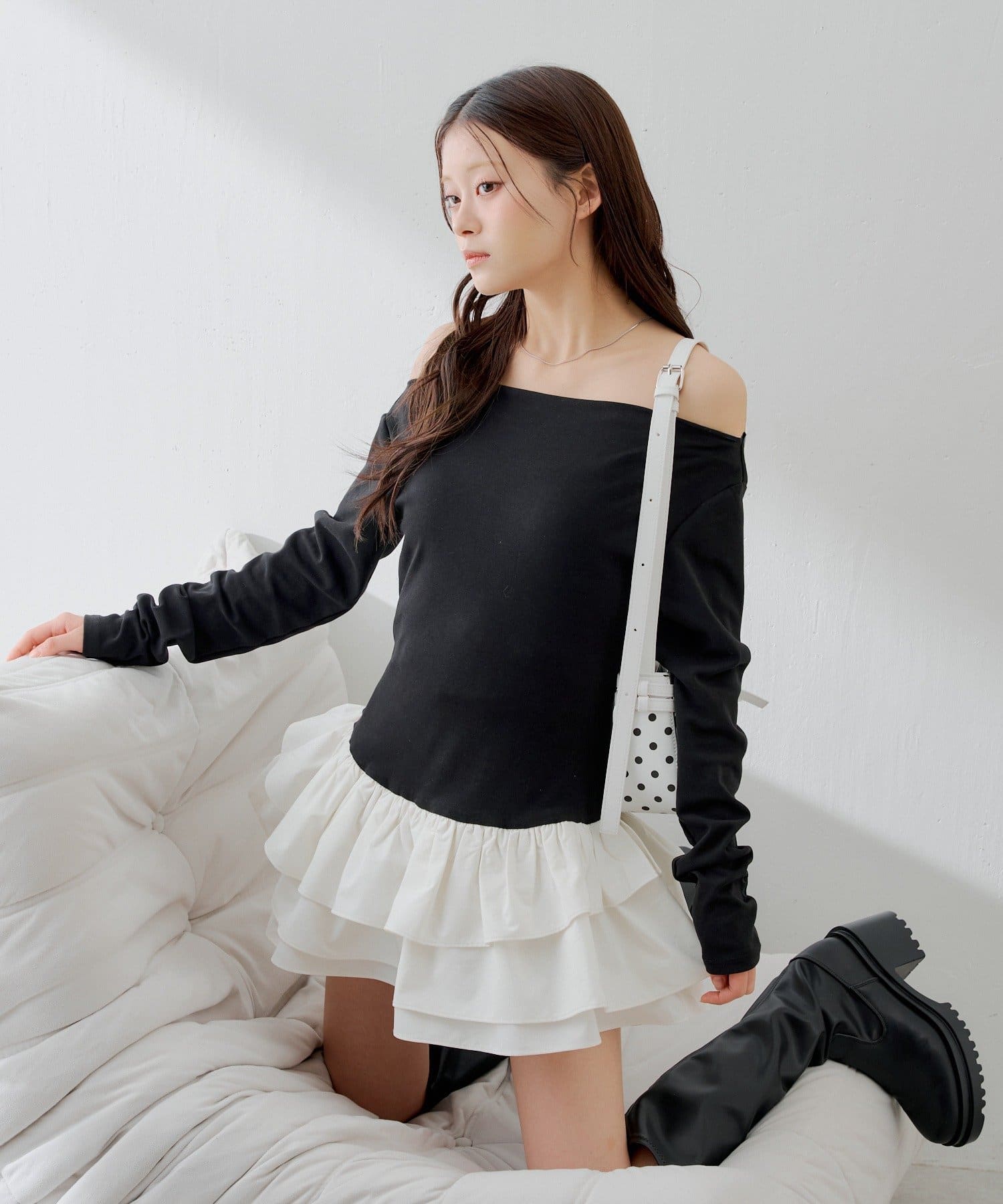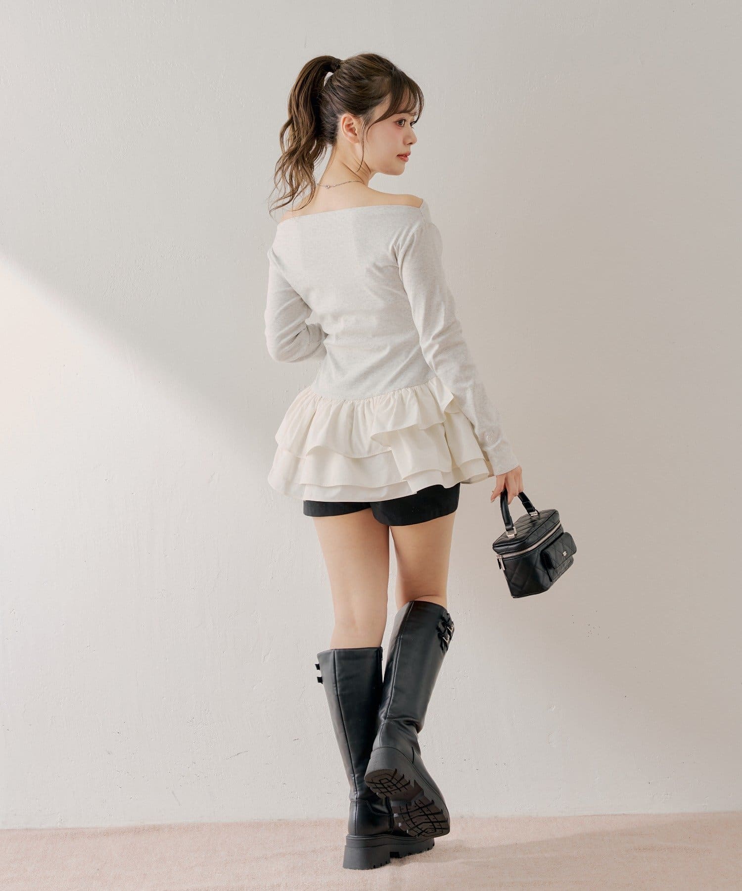 可愛いとスタイルアップを叶えるフリルティアードオフショルチュニック