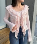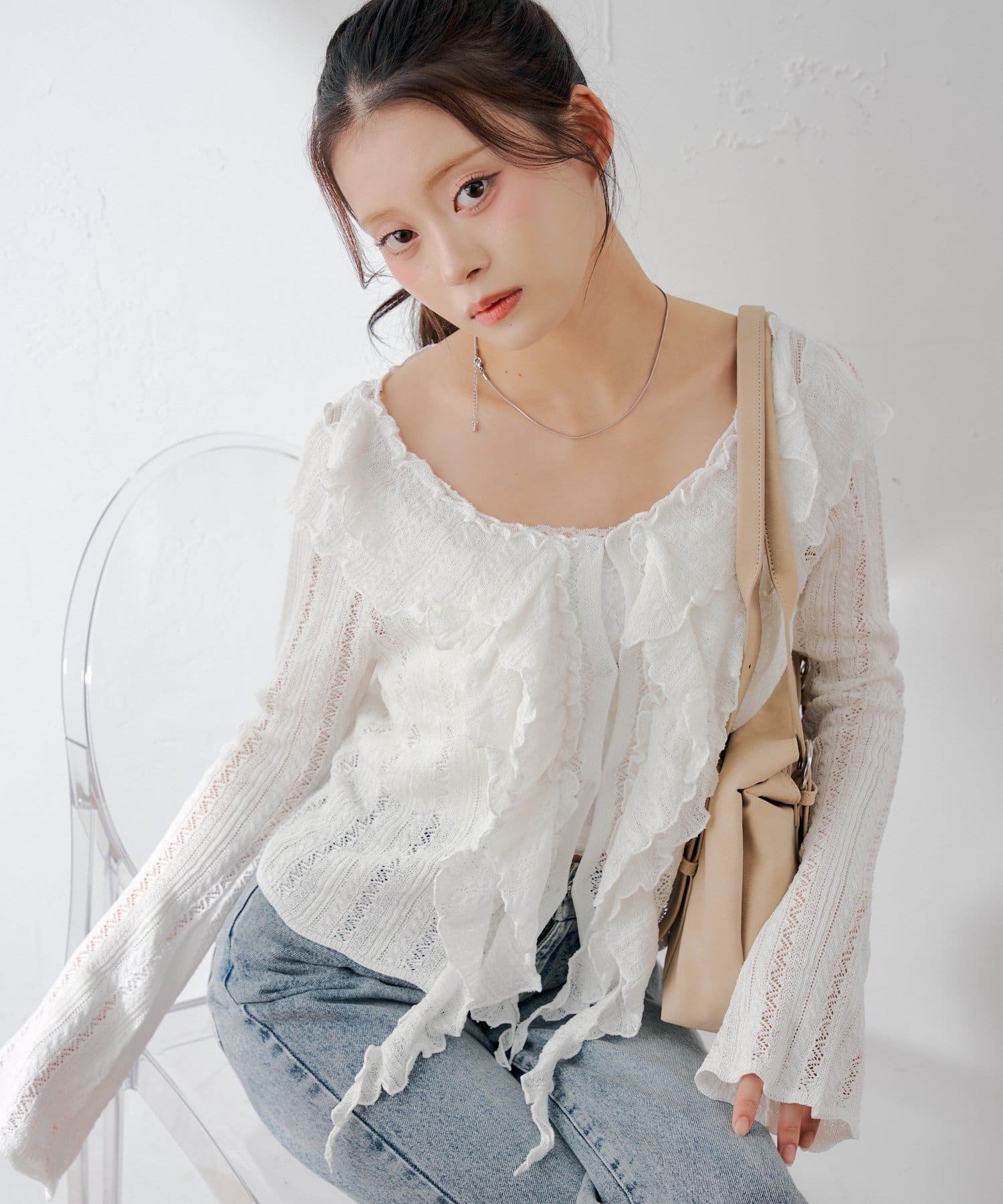 繊細な透かし柄とフリルが、大人の可愛らしさを引き立てるカーディガン登場!