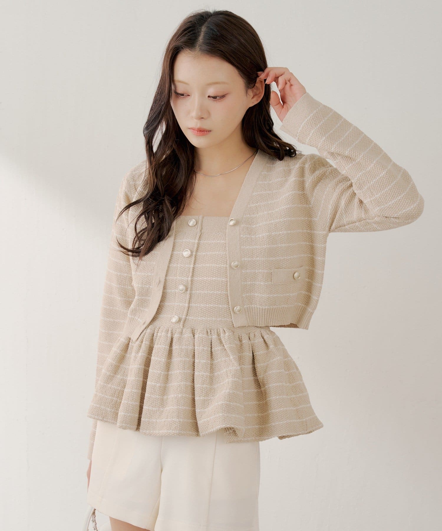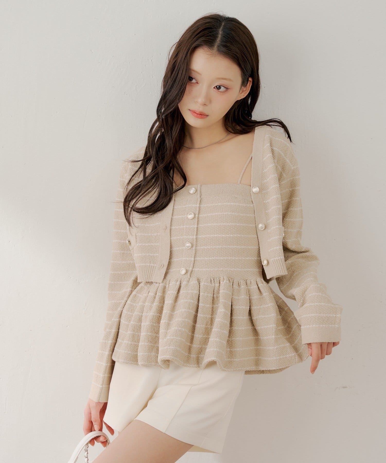・同素材のペプラムニットベアトップスとセットで着るのが可愛くておすすめです。