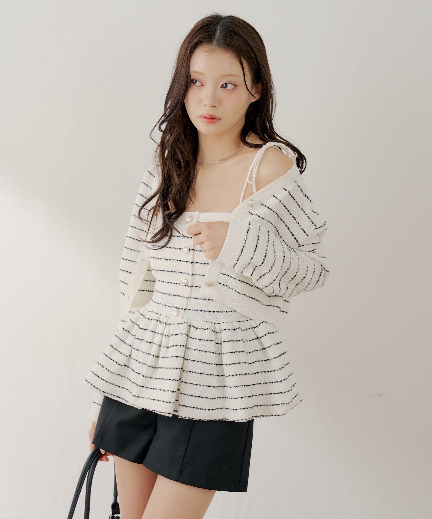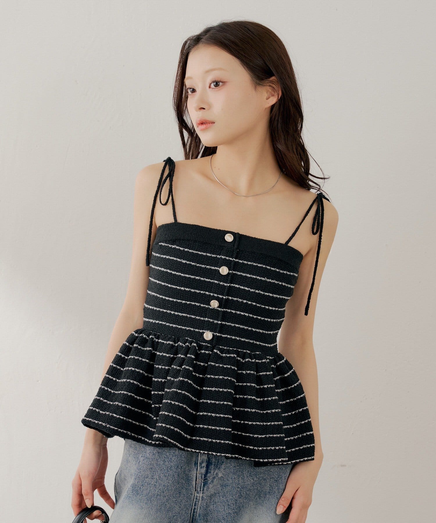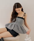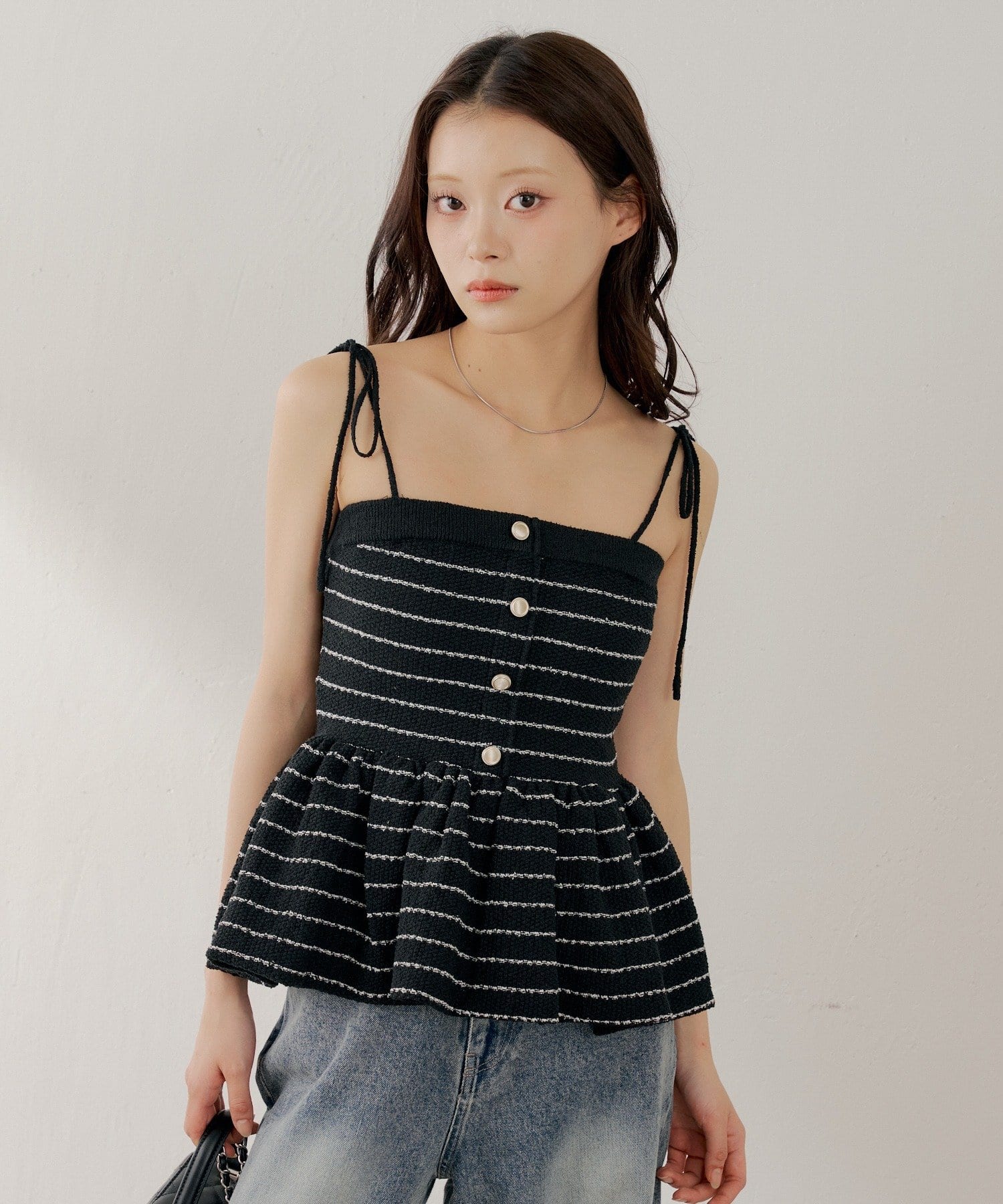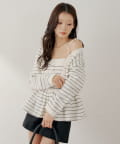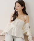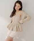 ・胸元の金ボタンがアクセントのペプラムニットベアトップス。