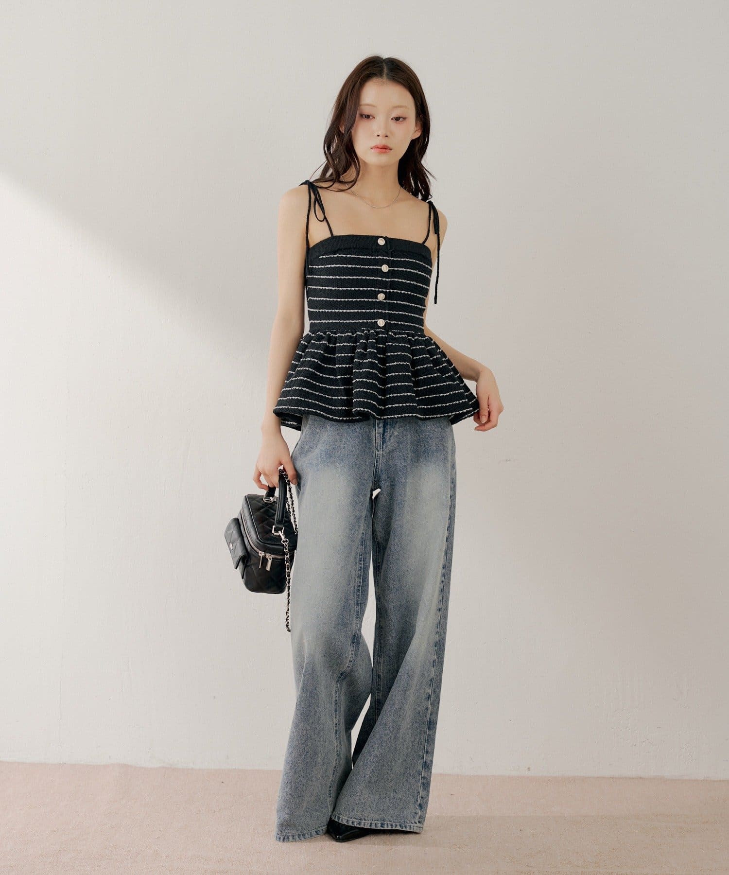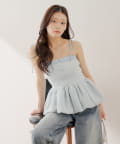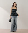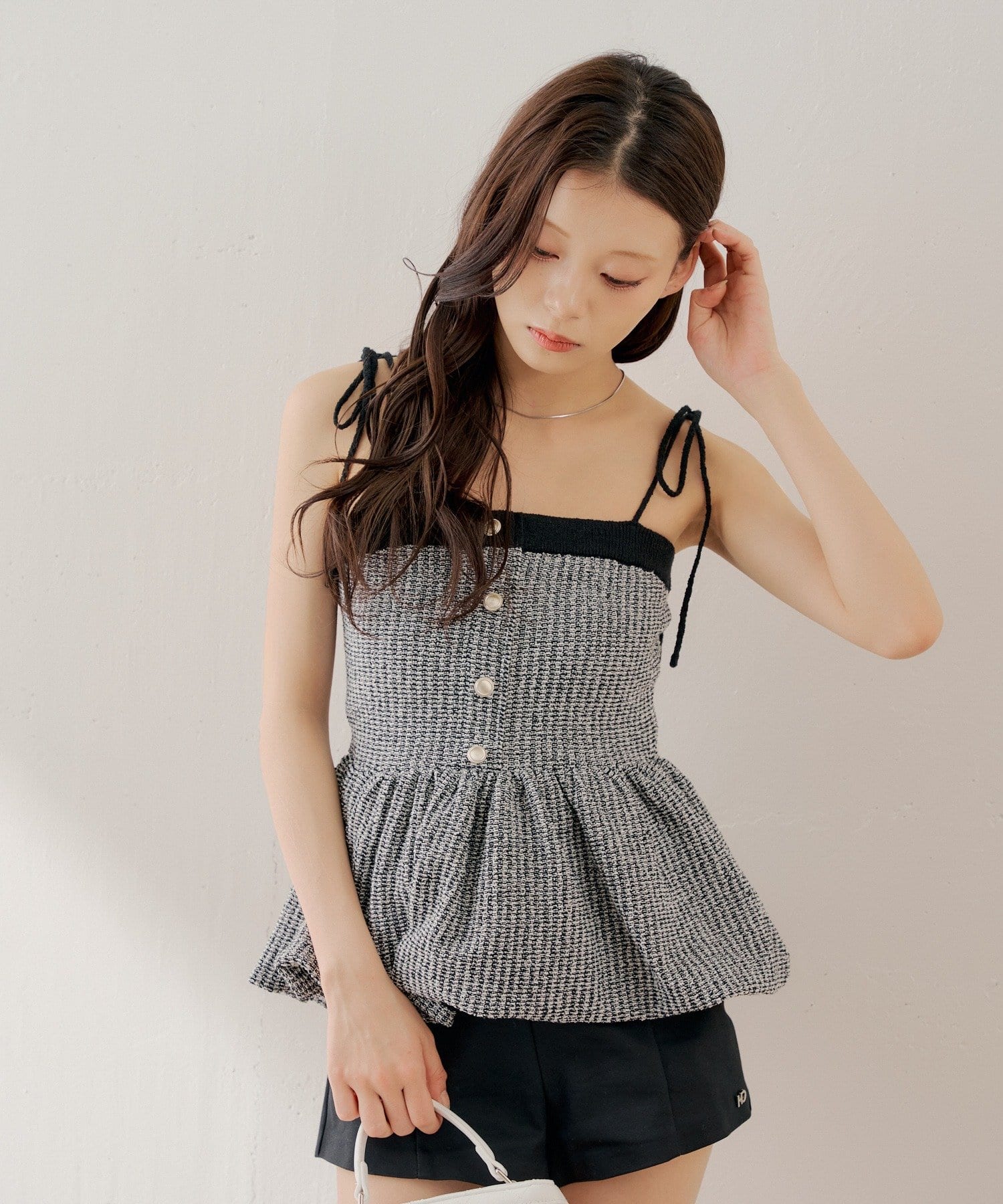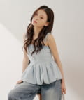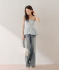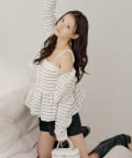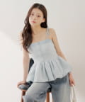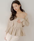 ・胸元の金ボタンがアクセントのペプラムニットベアトップス。