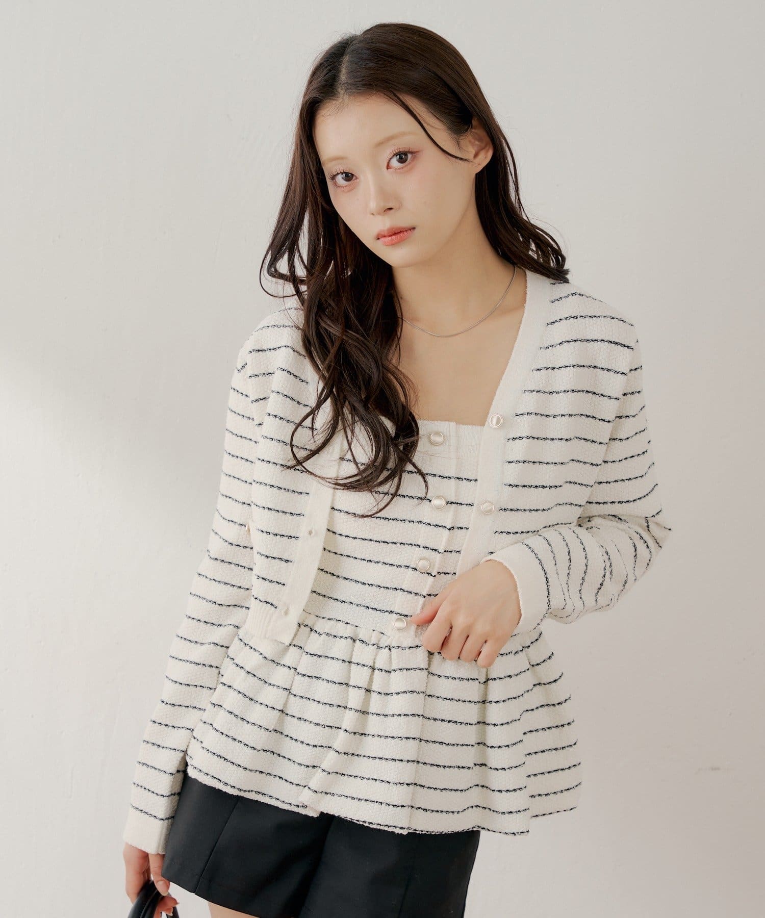 ・同素材の金ボタンVネックカーディガンとセットで着るのが可愛くておすすめです。