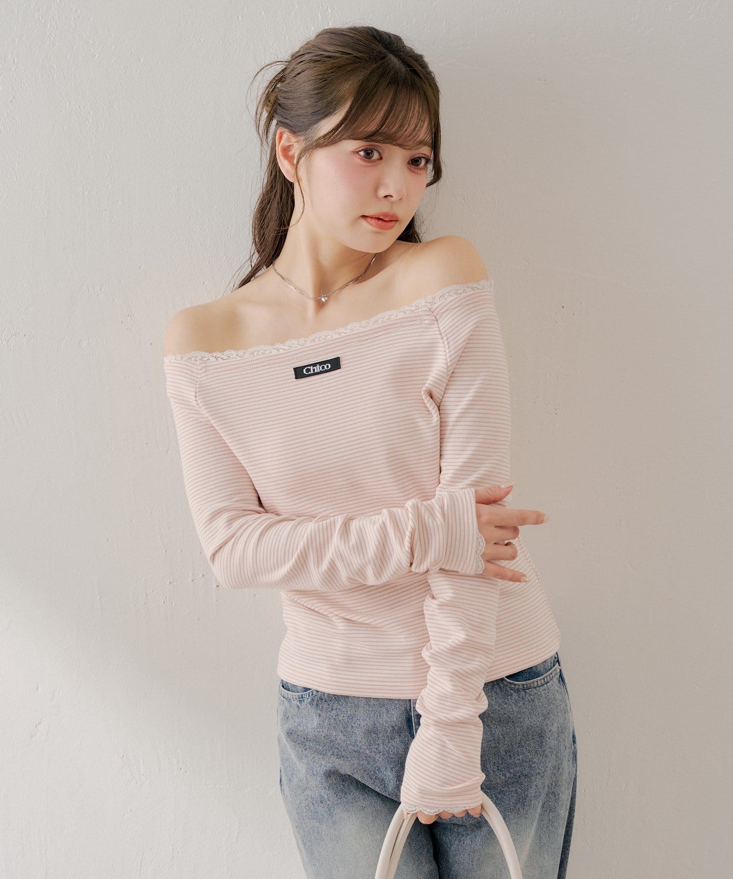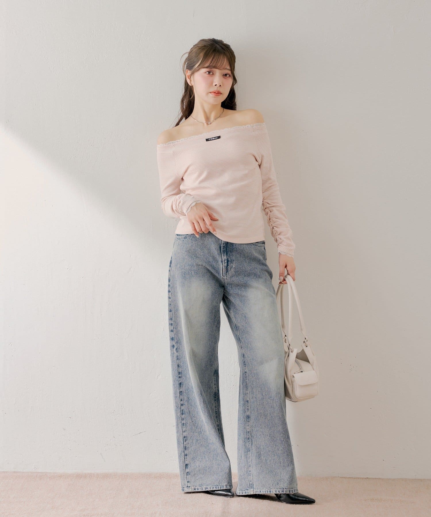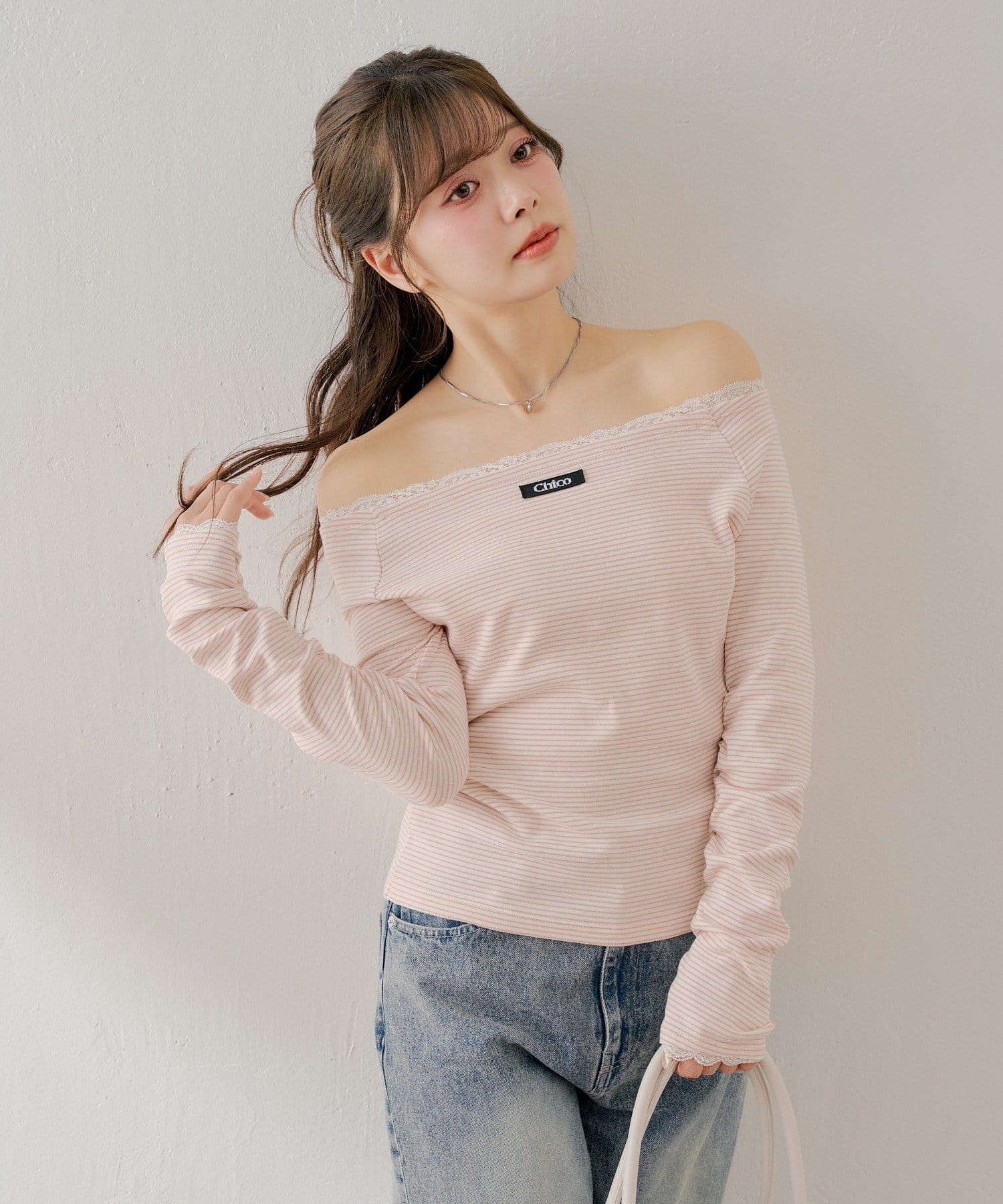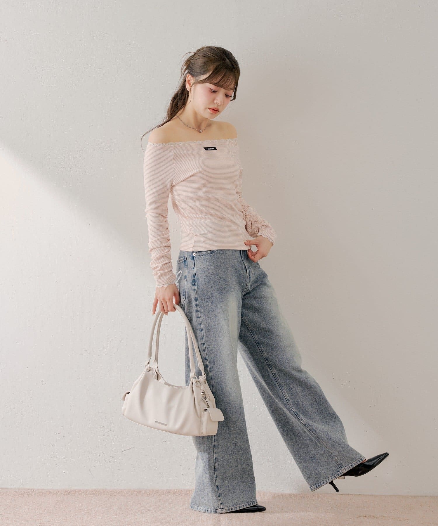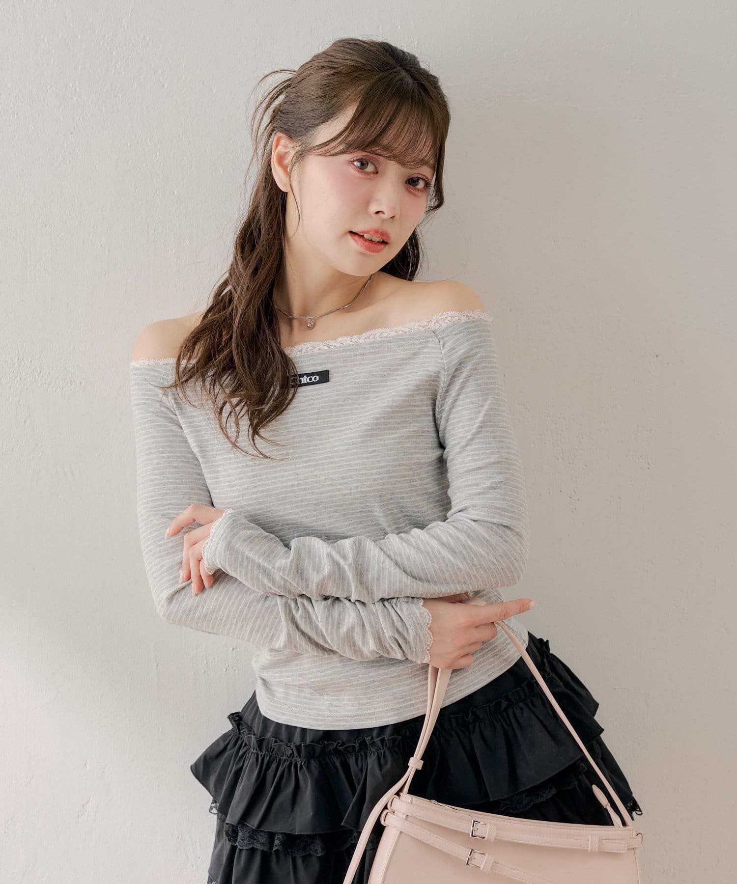 ・オフショルダーデザインがデコルテを美しく見せ、女性らしい抜け感を演出。