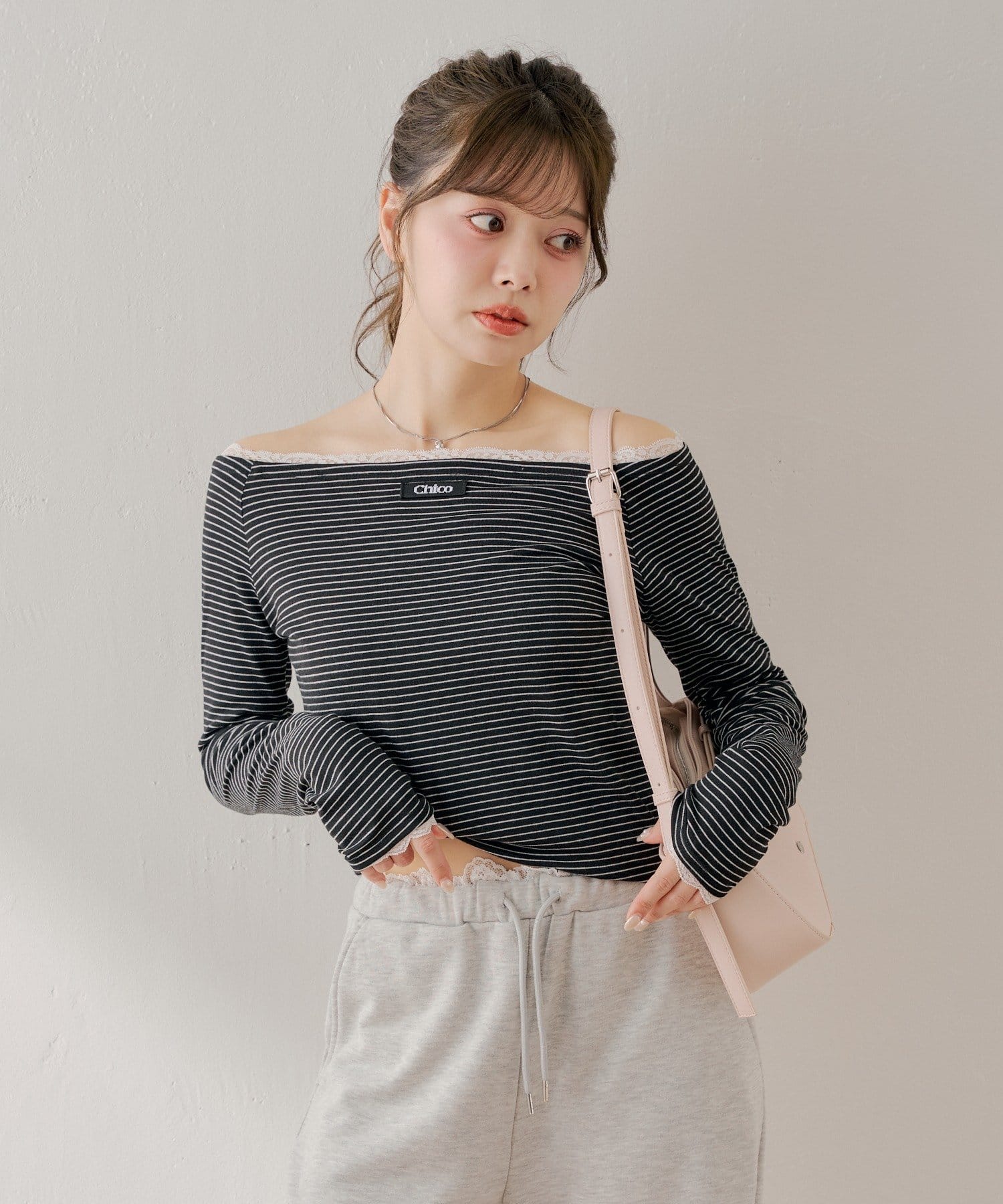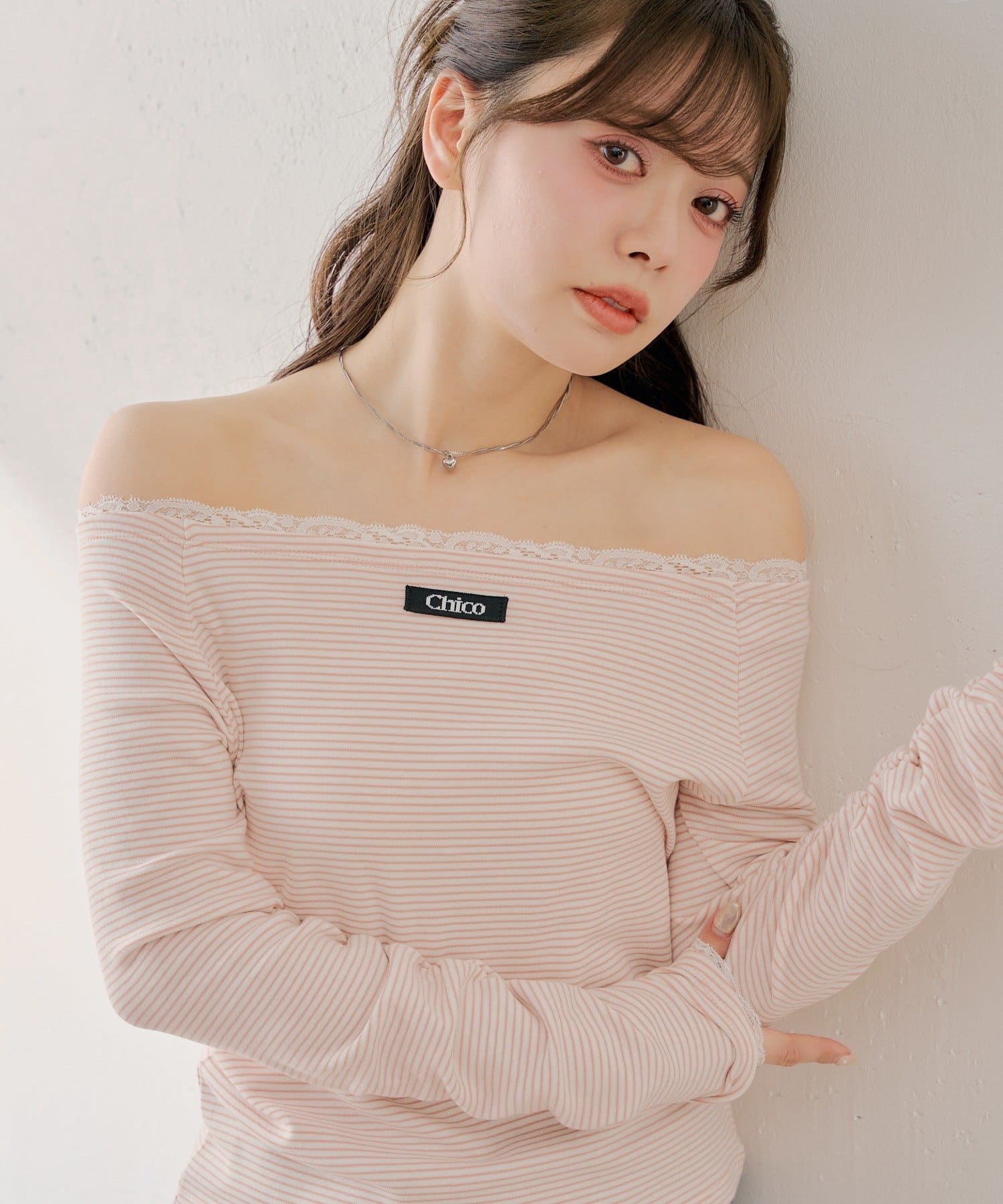・ネックラインと袖口に施されたレースが、フェミニンなアクセントに。