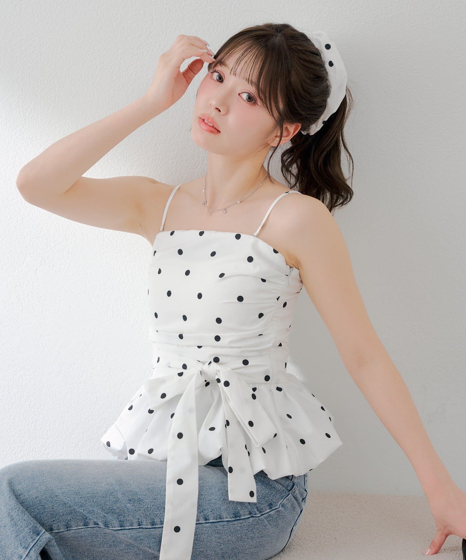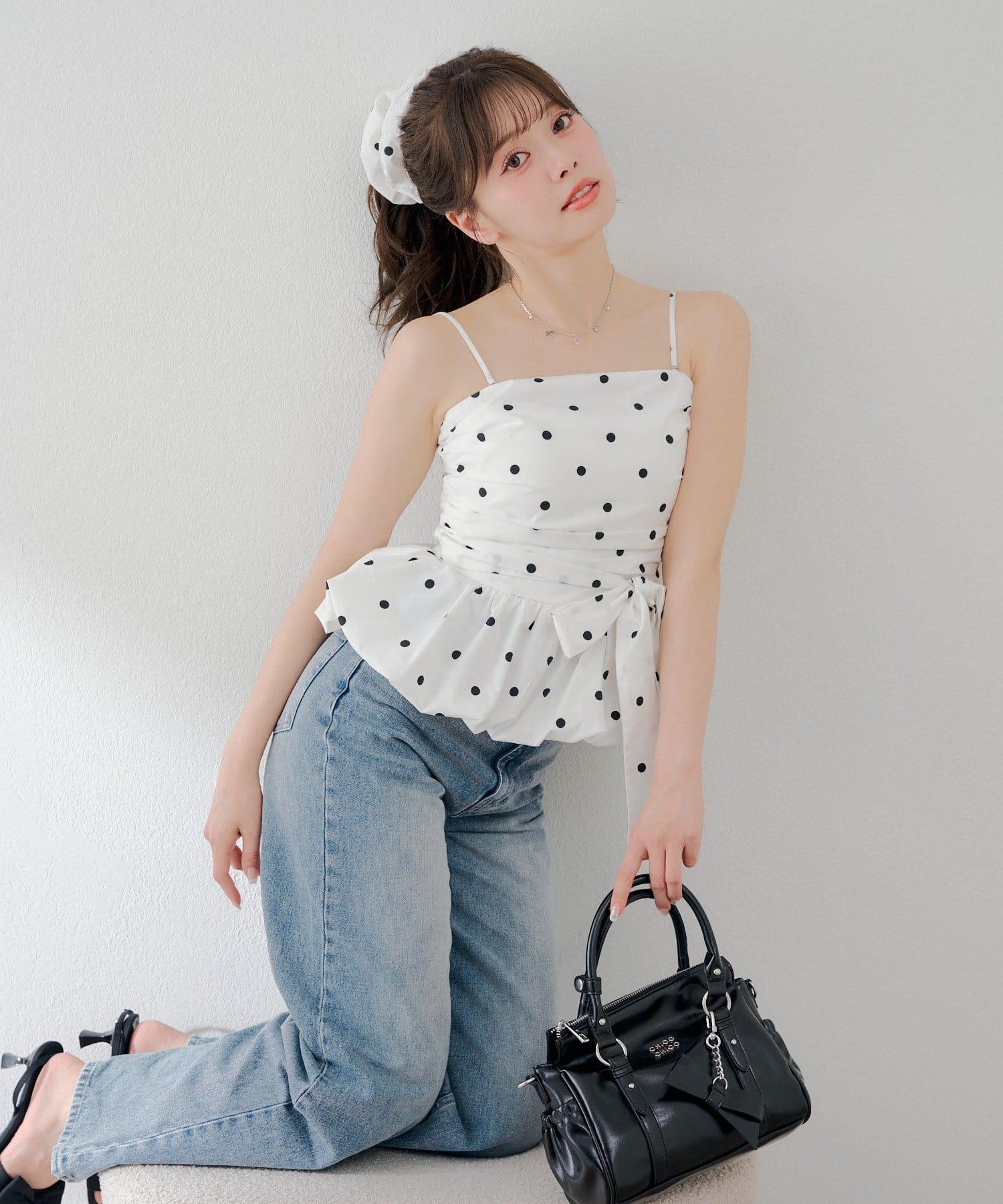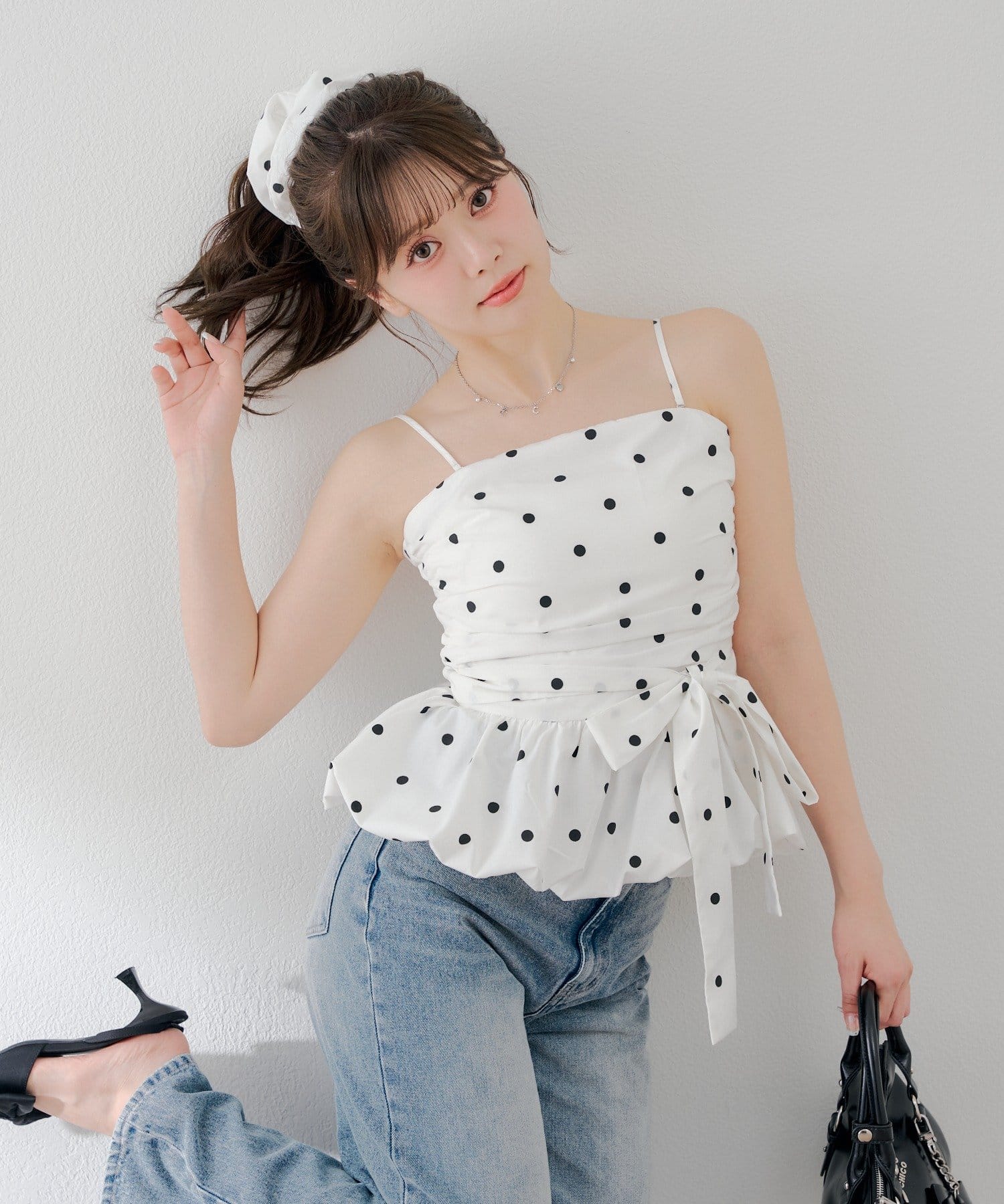 ・ふんわりシルエットが魅力のバルーンペプラムトップスとお揃いのシュシュのセットアイテム。