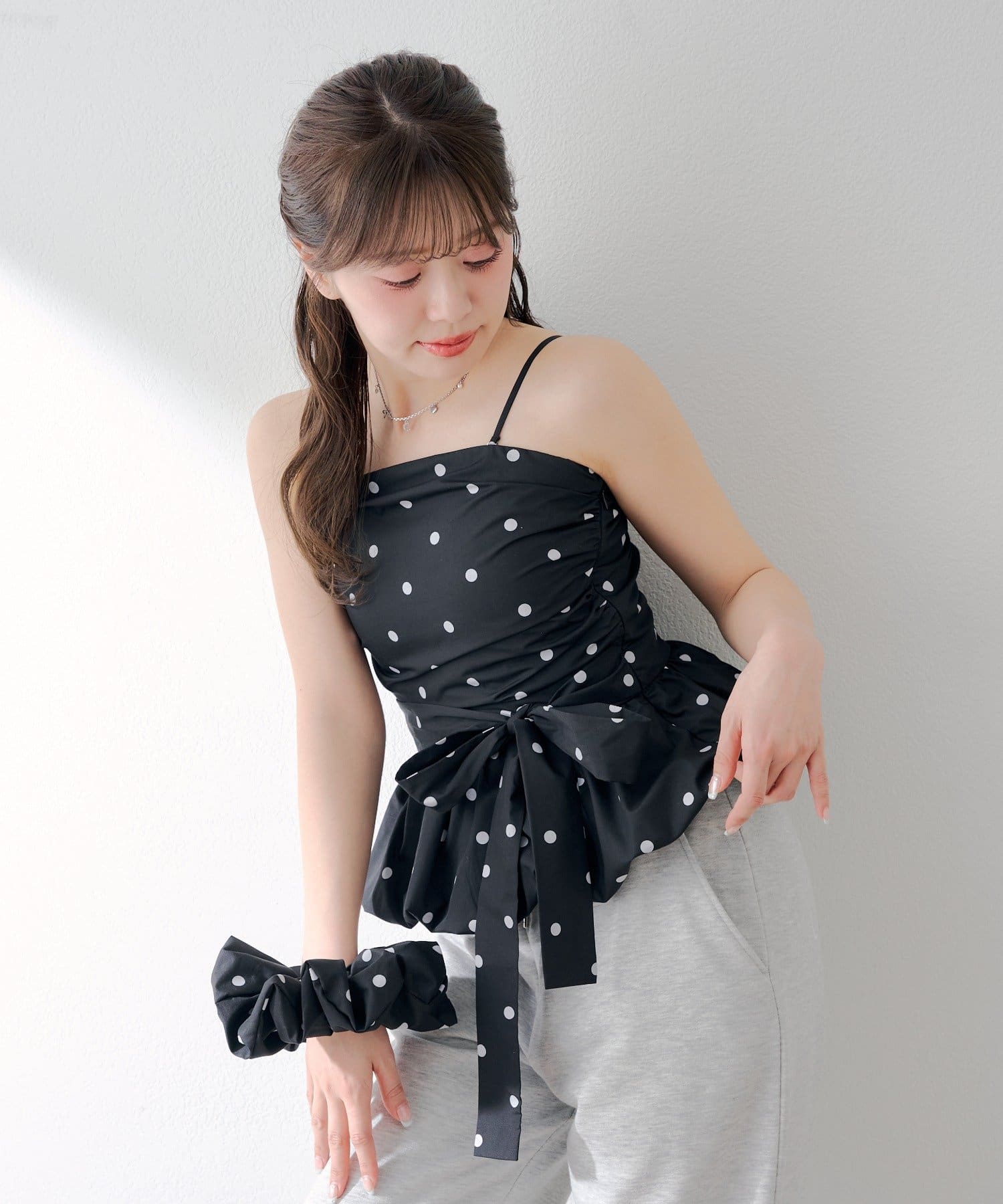 ・トップスと同じ生地で作られたシュシュがセットになっているので、統一感のあるスタイリングが楽しめます。