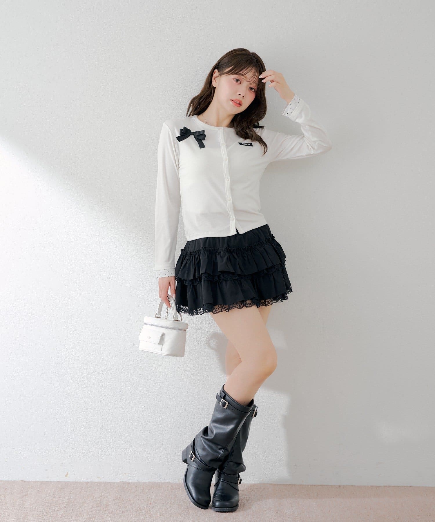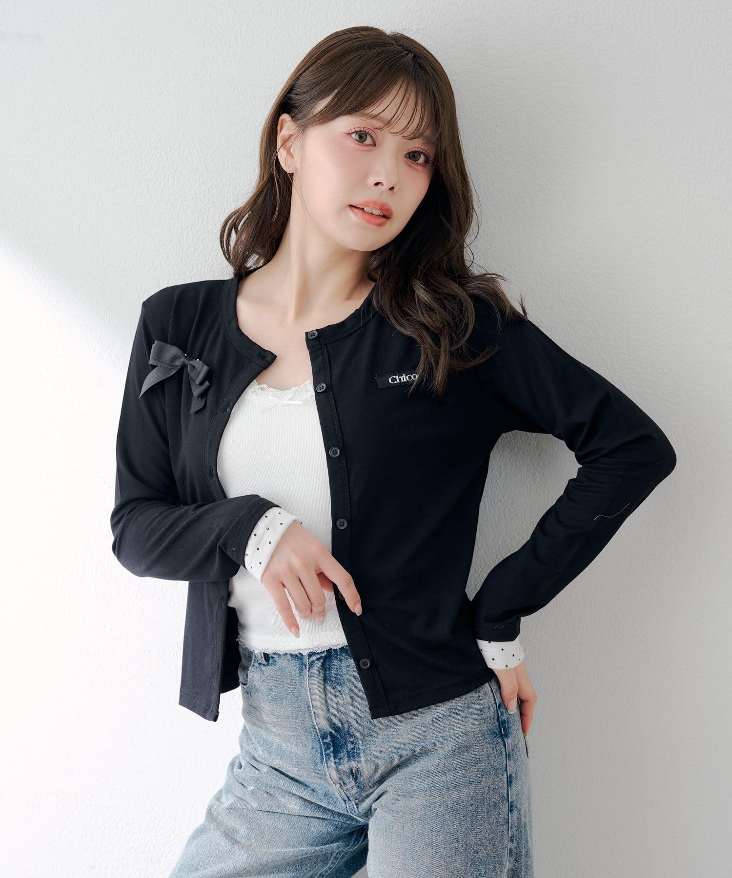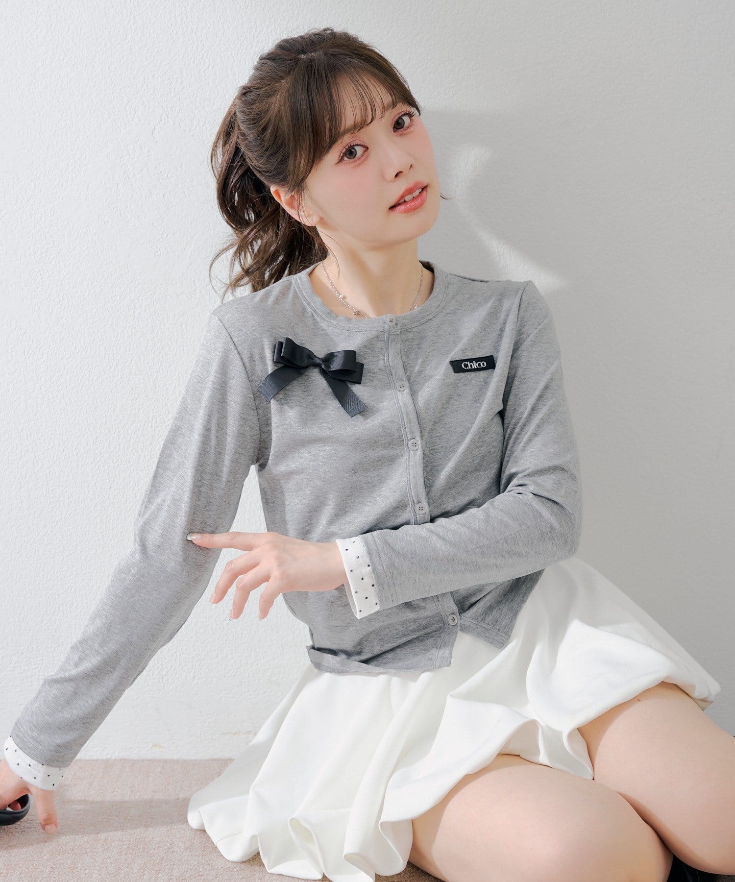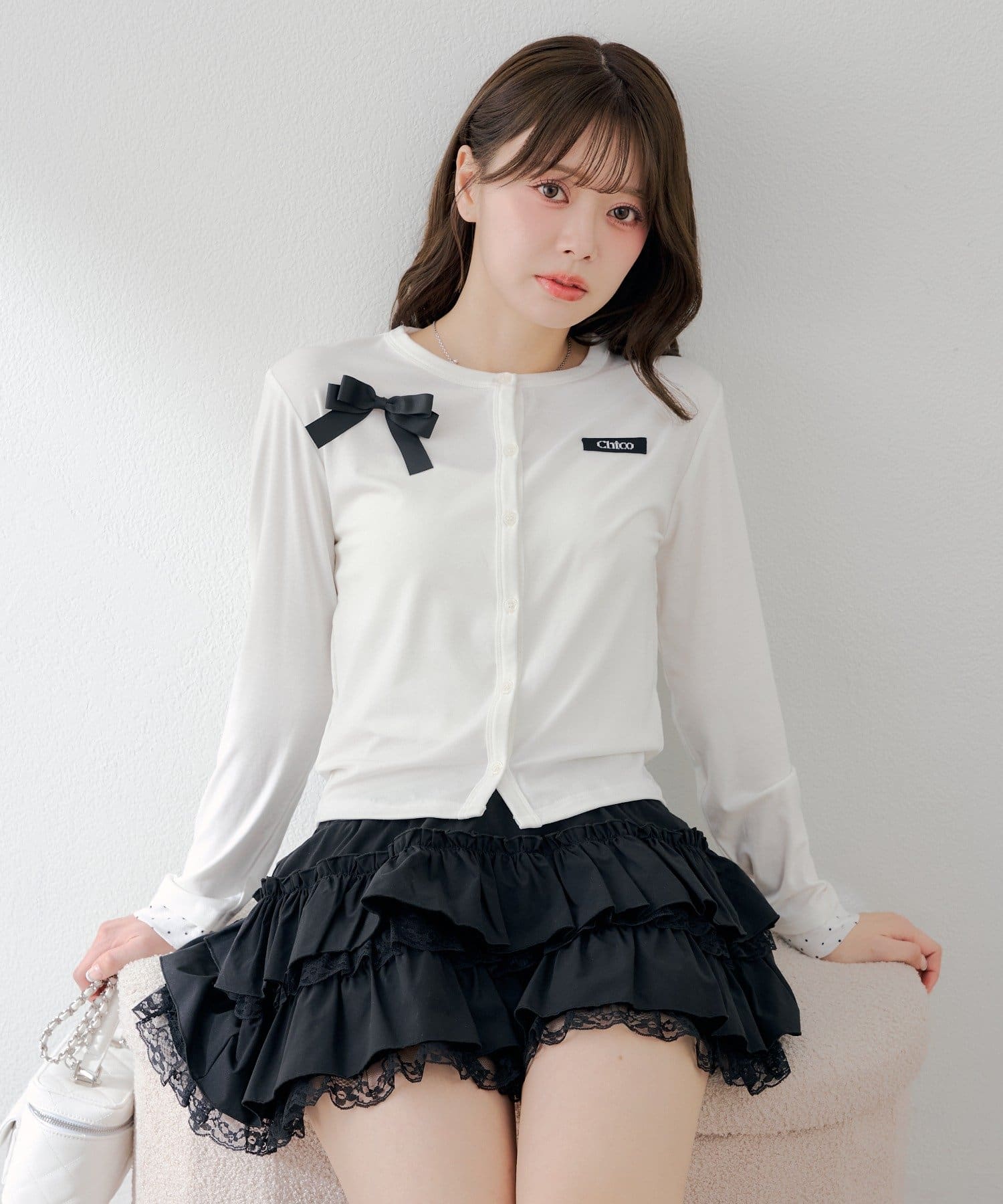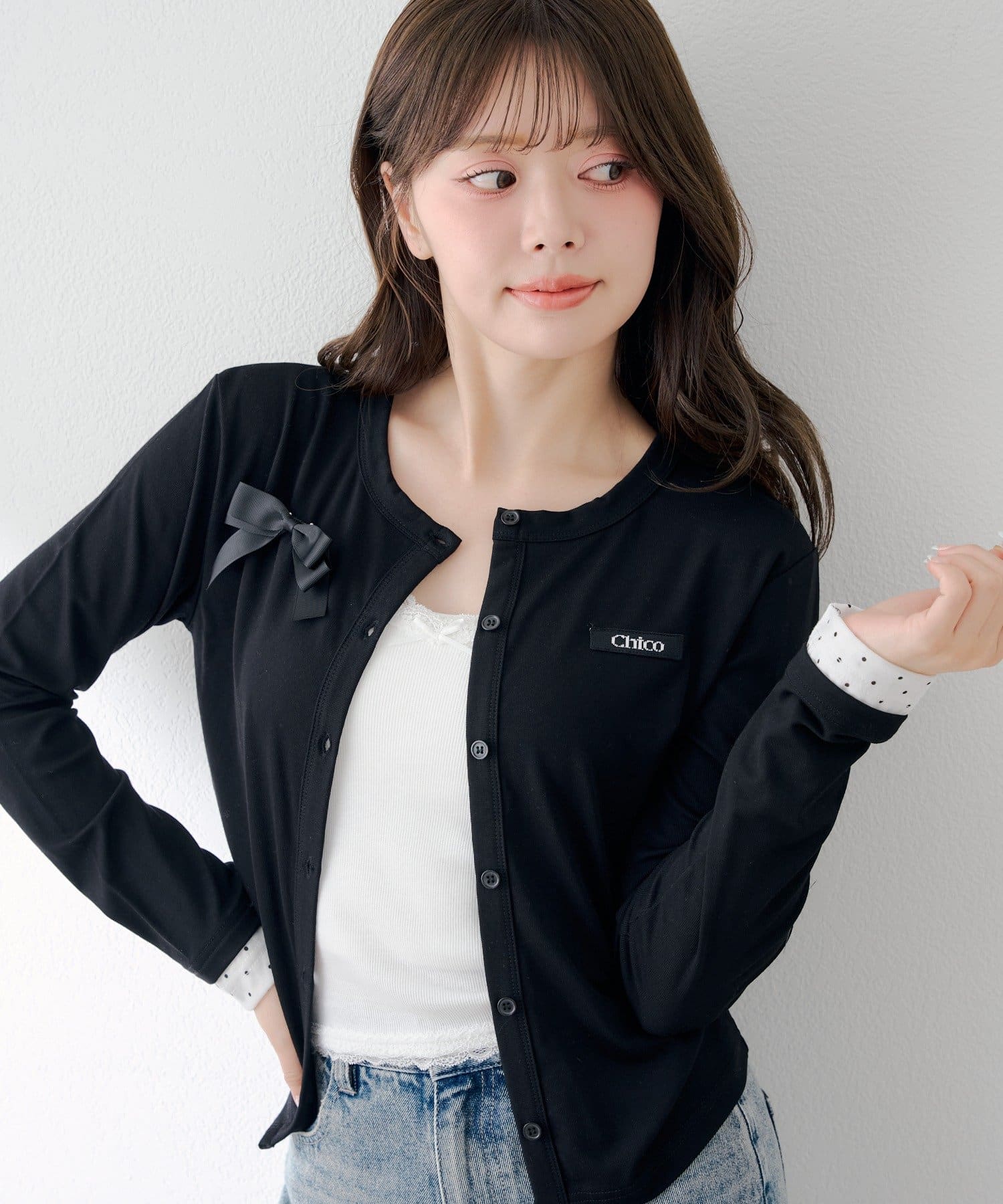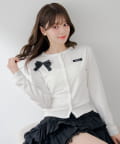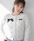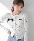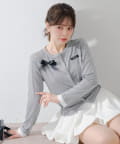 胸元のリボンとレイヤードデザインが目を惹く、コンパクトカーディガン
