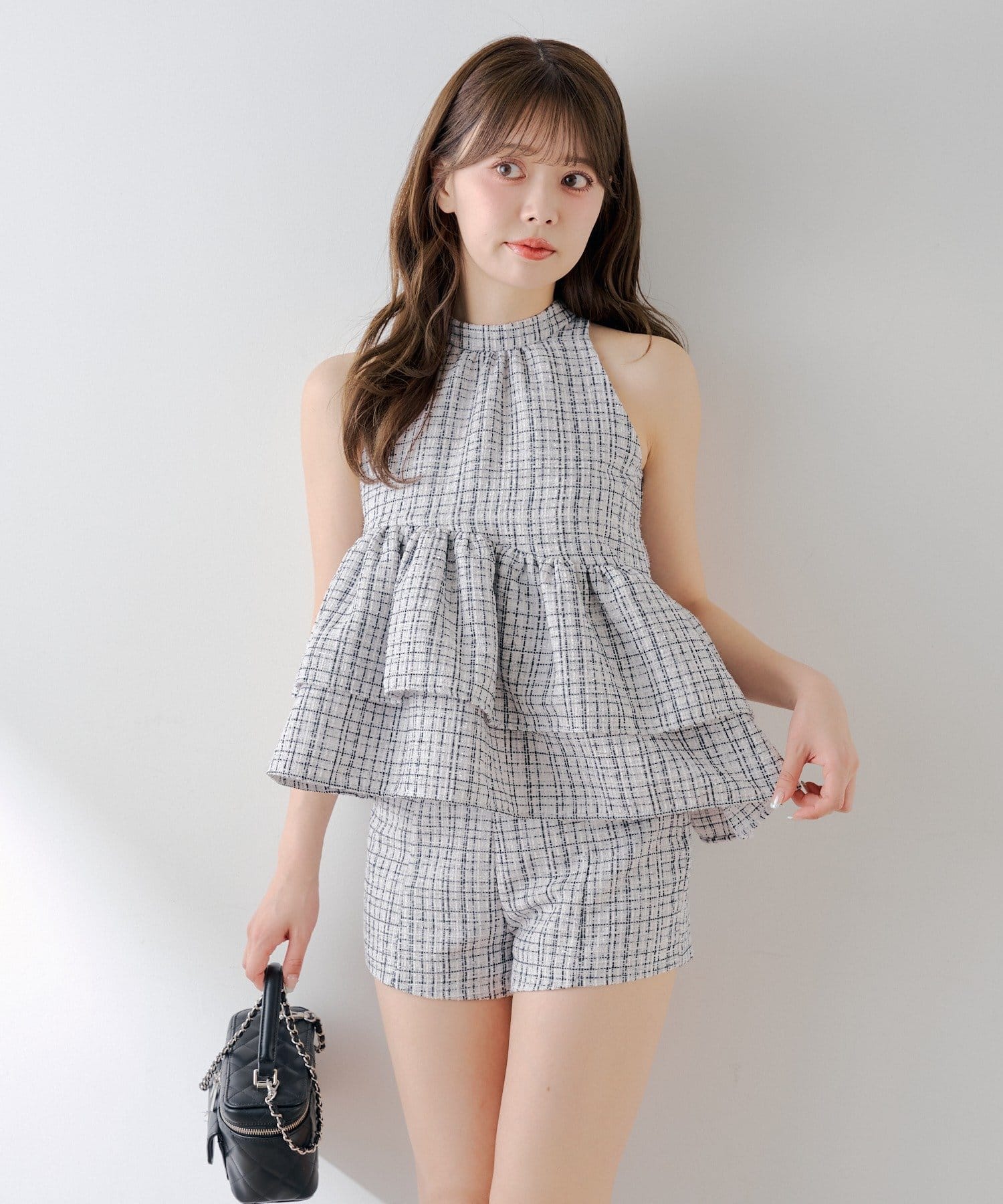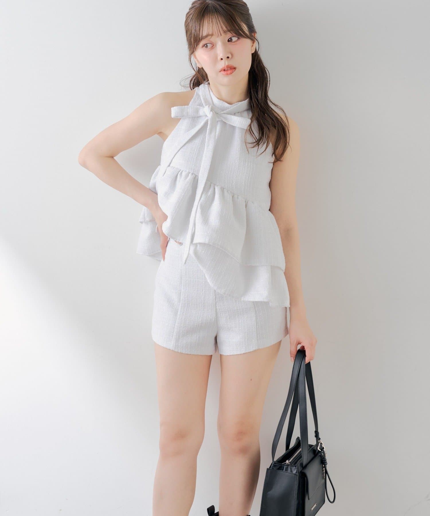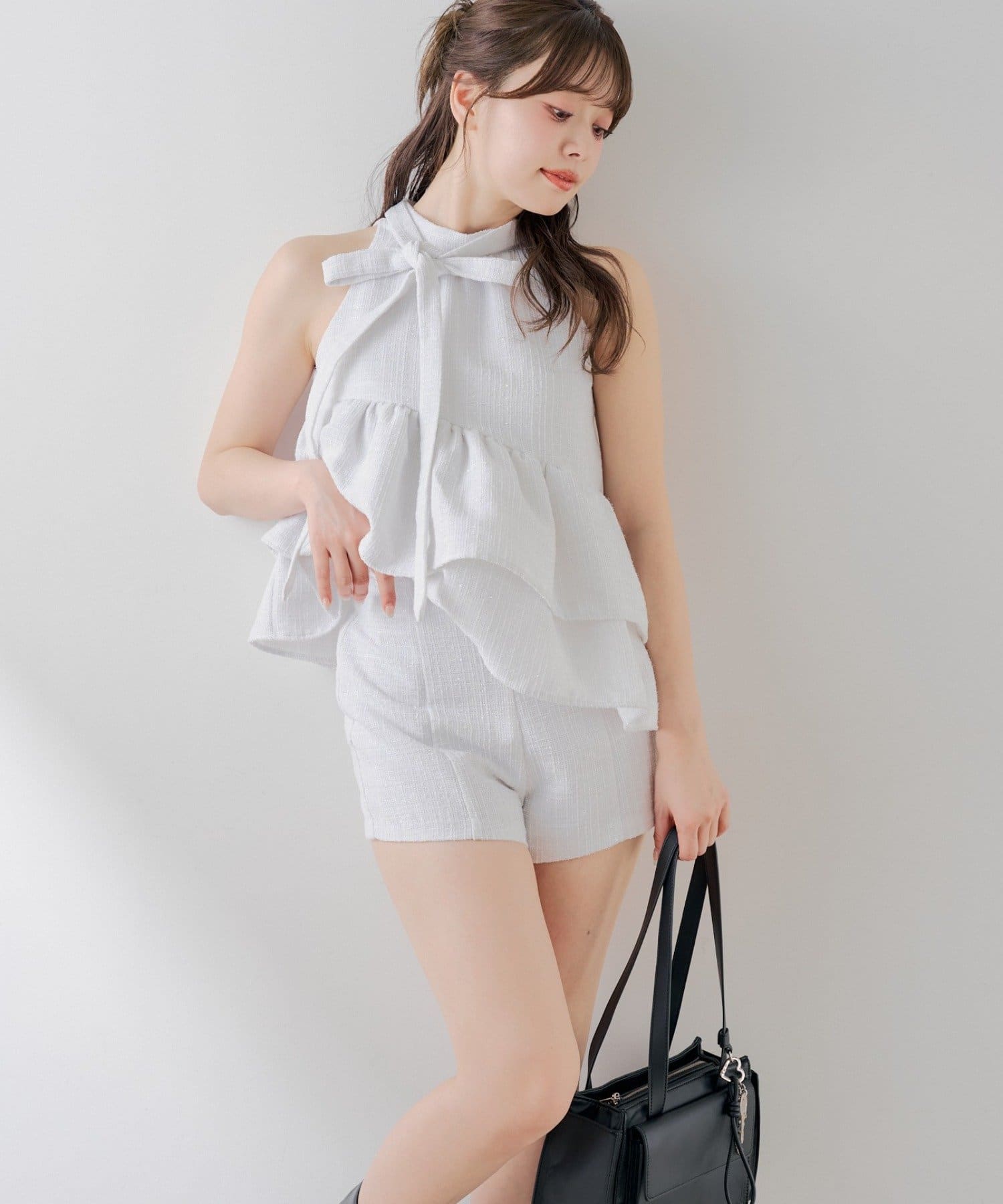・同素材のツイードアメスリブラウスと合わせてセットアップで着るのが可愛くておすすめです。
