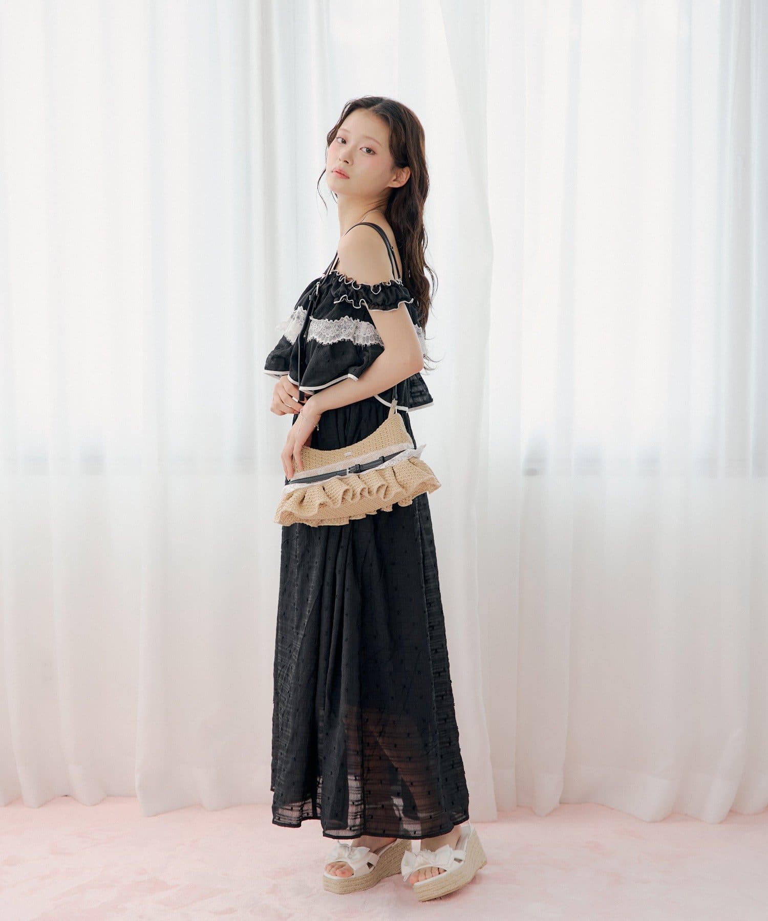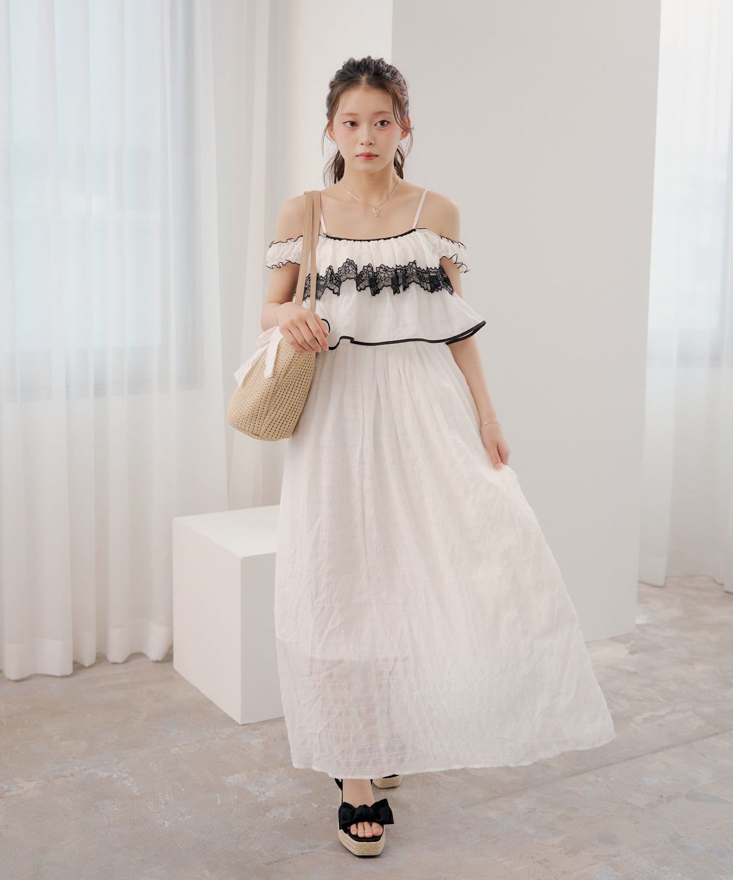 ・レースの配色がアクセントになり、シンプルながらも印象的なスタイルに。