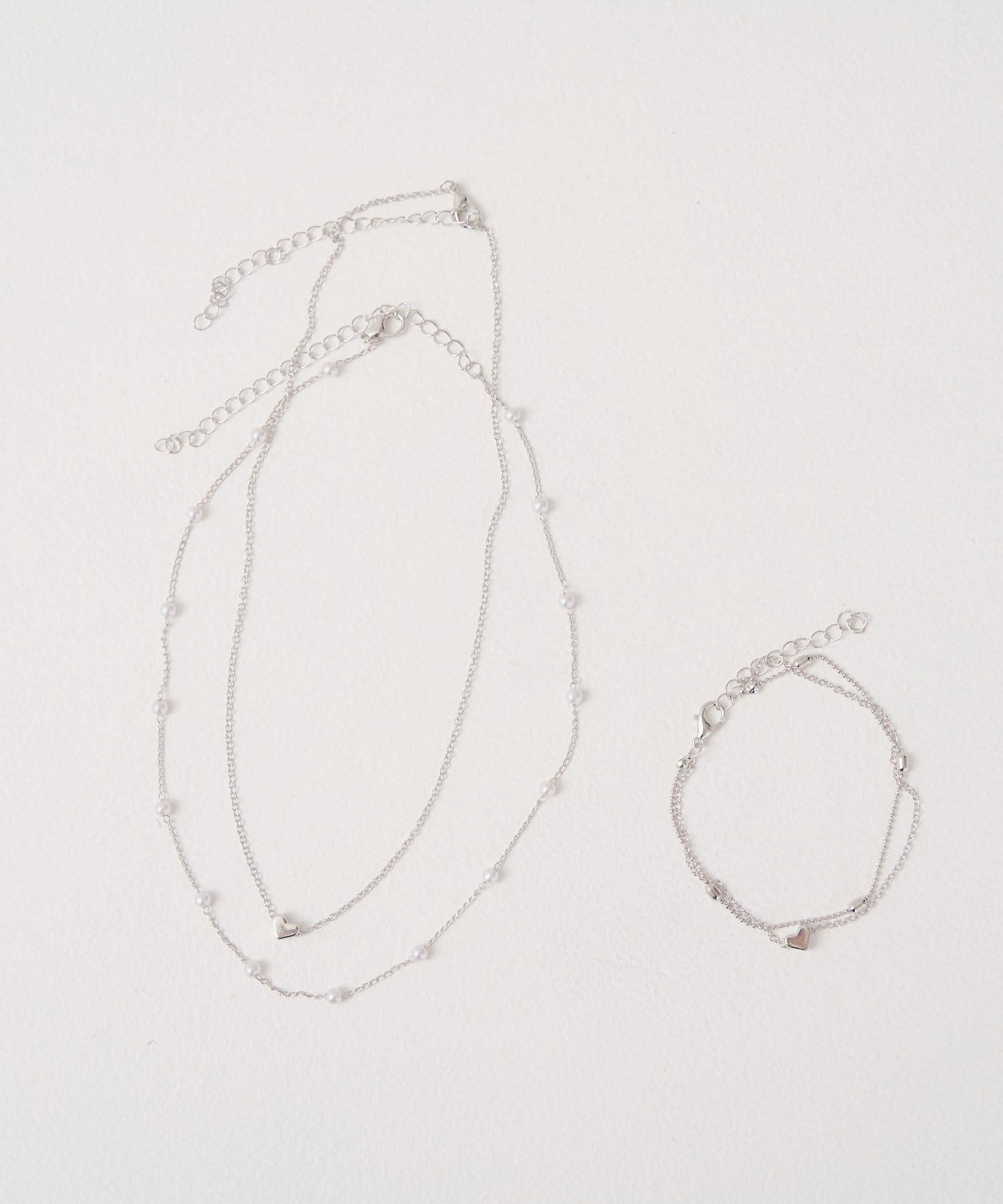 胸元と手元にさりげない可愛らしさをプラスしてくれるハートパールネックレス+ブレスレットセット