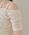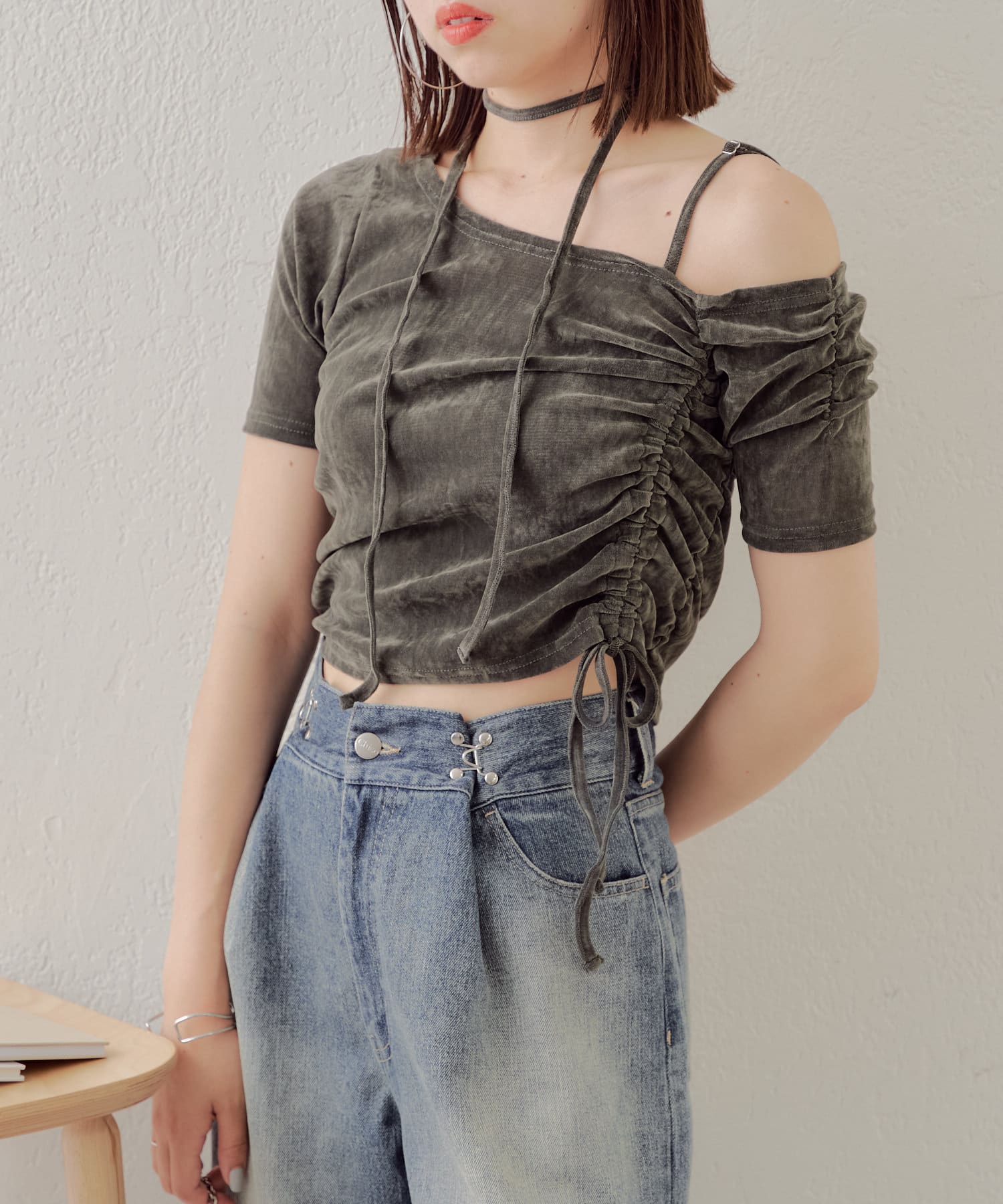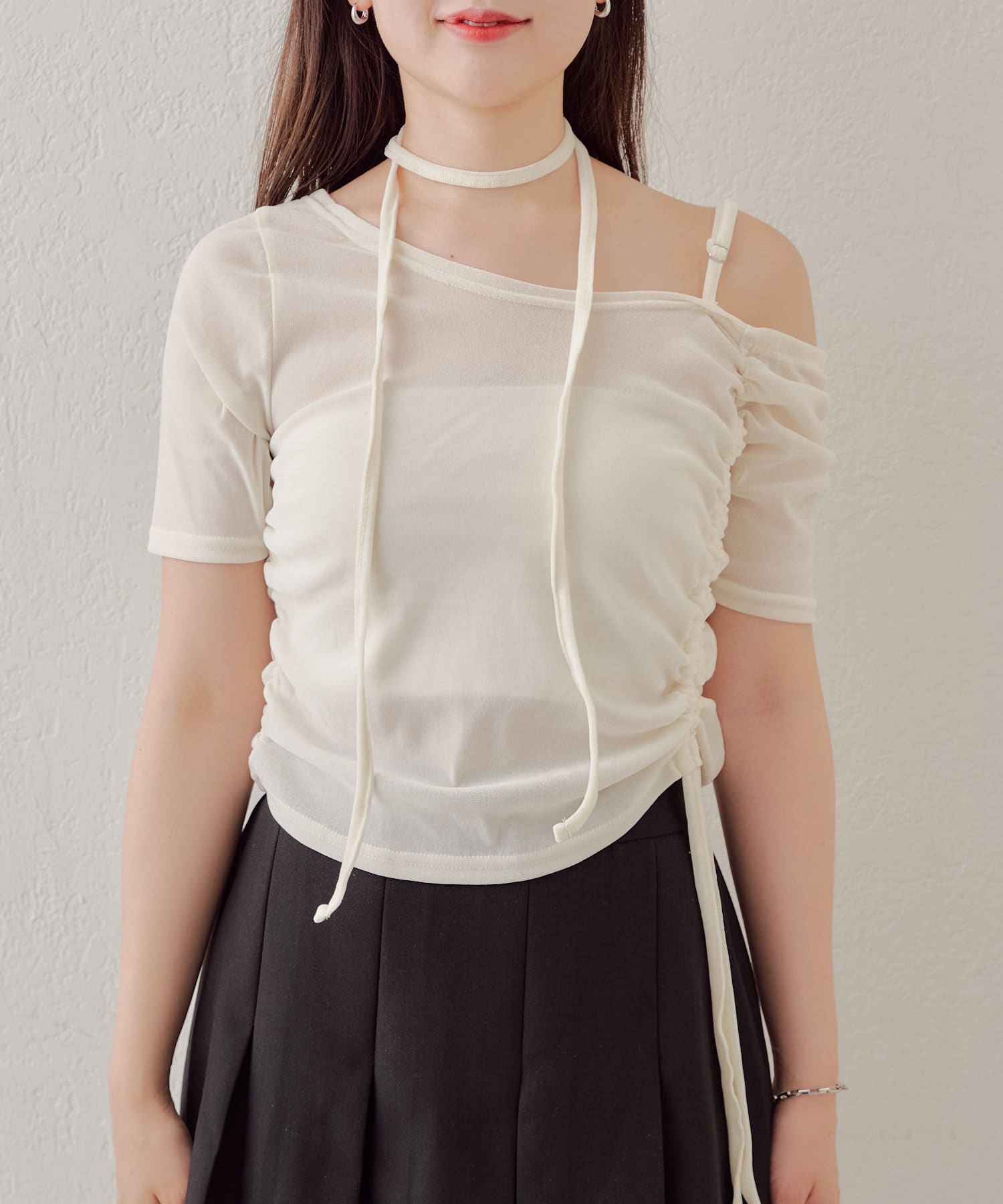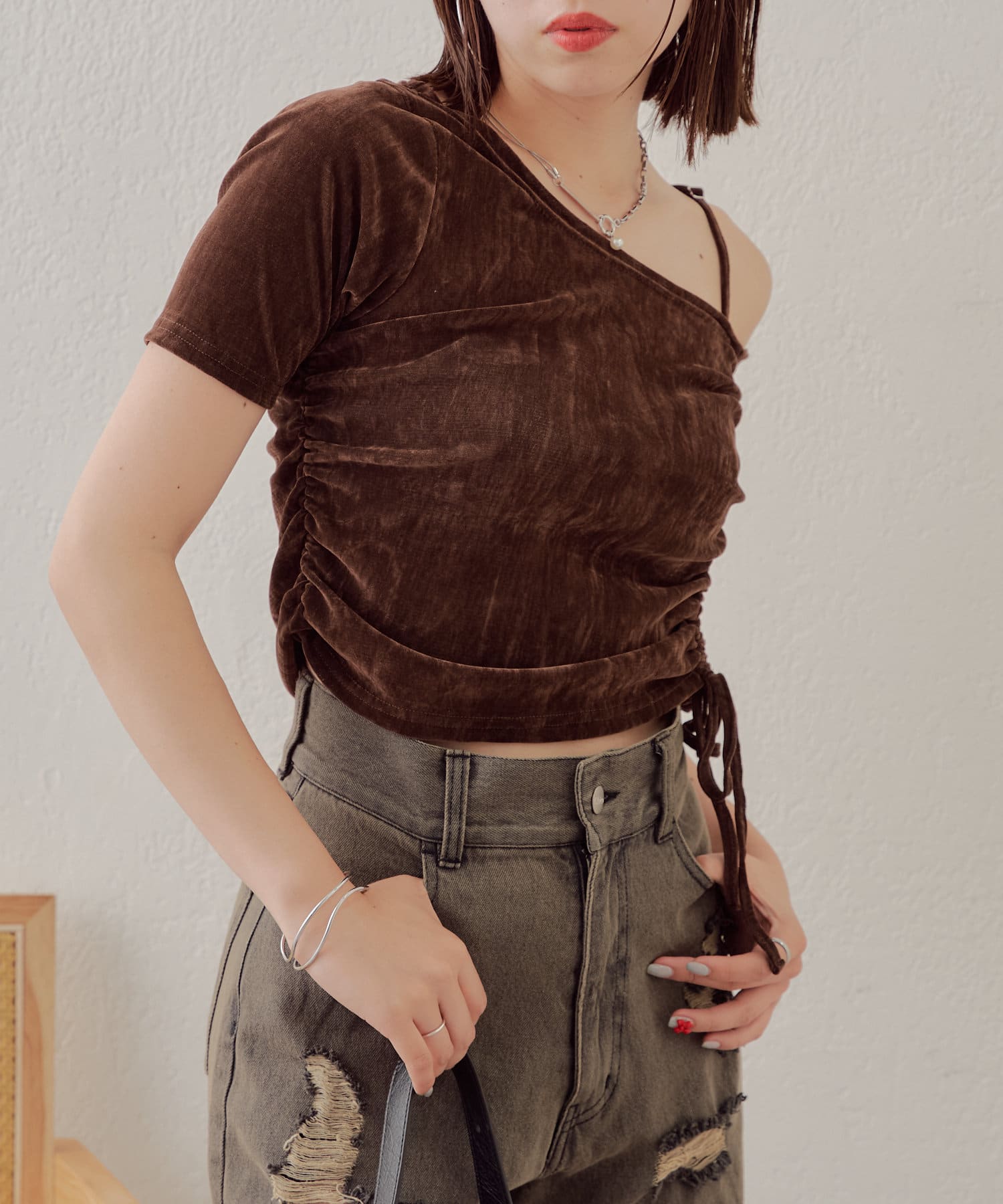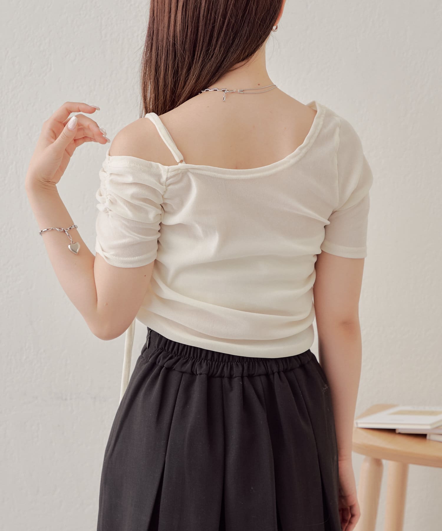 ・ワンショルデザインでヘルシーな肌見せが叶うトップス。