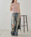 ・ノースリーブなのでニット素材でも比較的涼しく着ることができ秋先取りしたい方におすすめの一枚です。