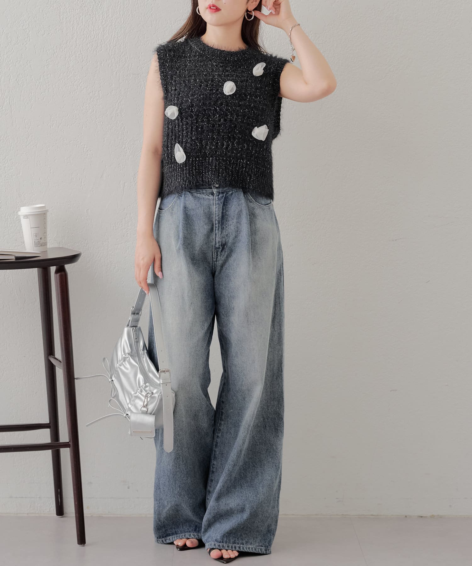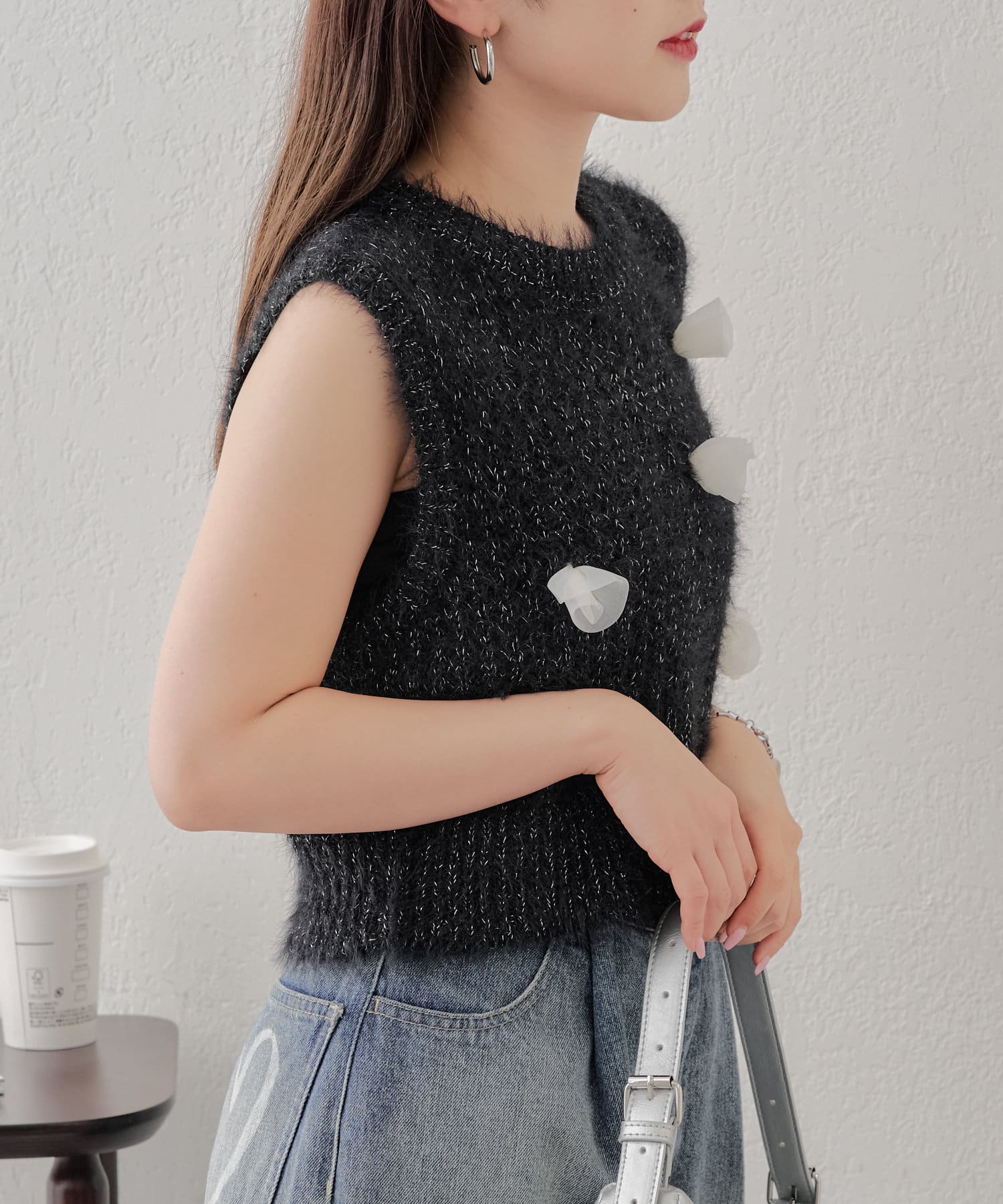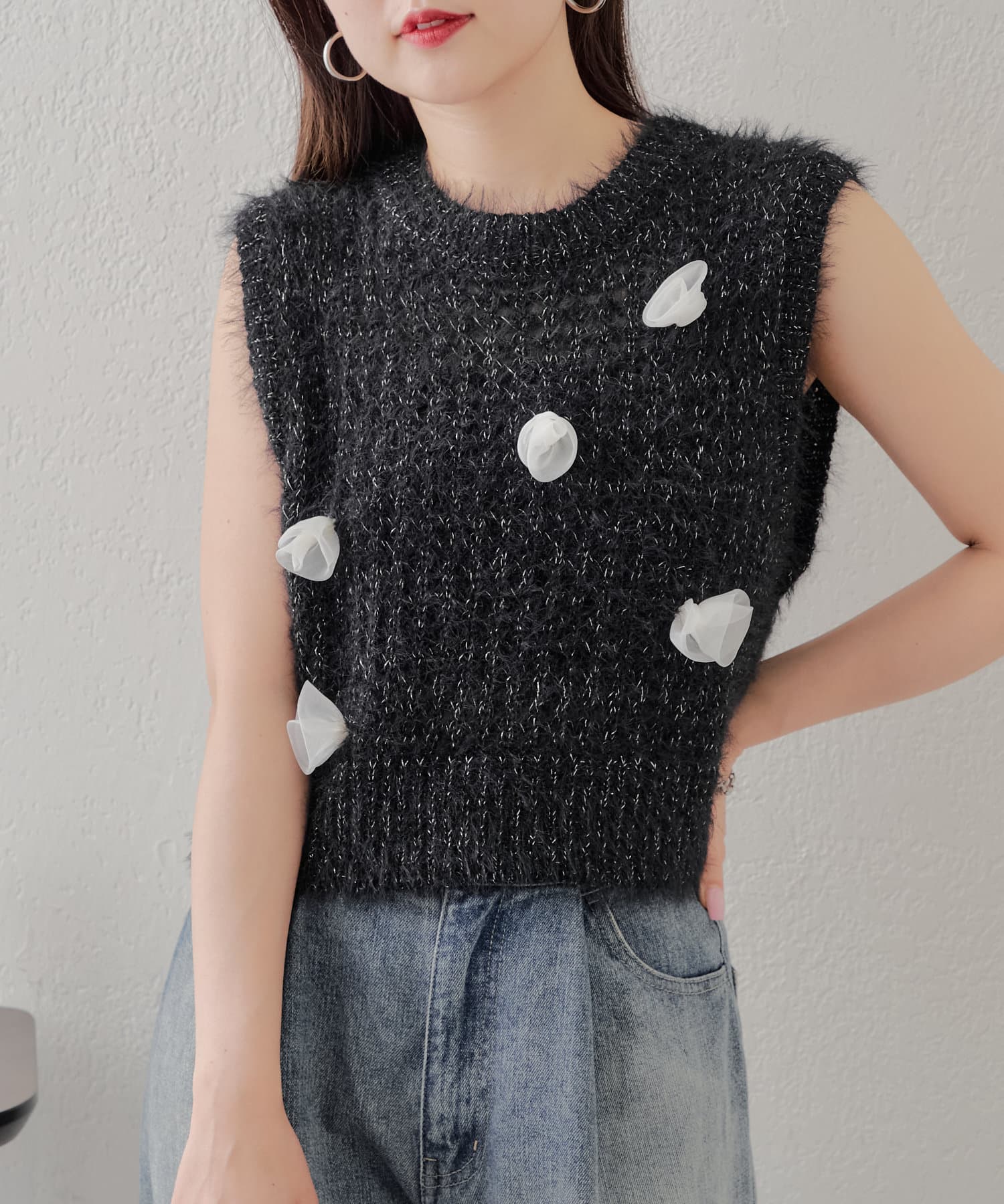・ラメのメッシュタンクに立体的な薔薇モチーフが付いており可愛いが詰まったニットタンク。