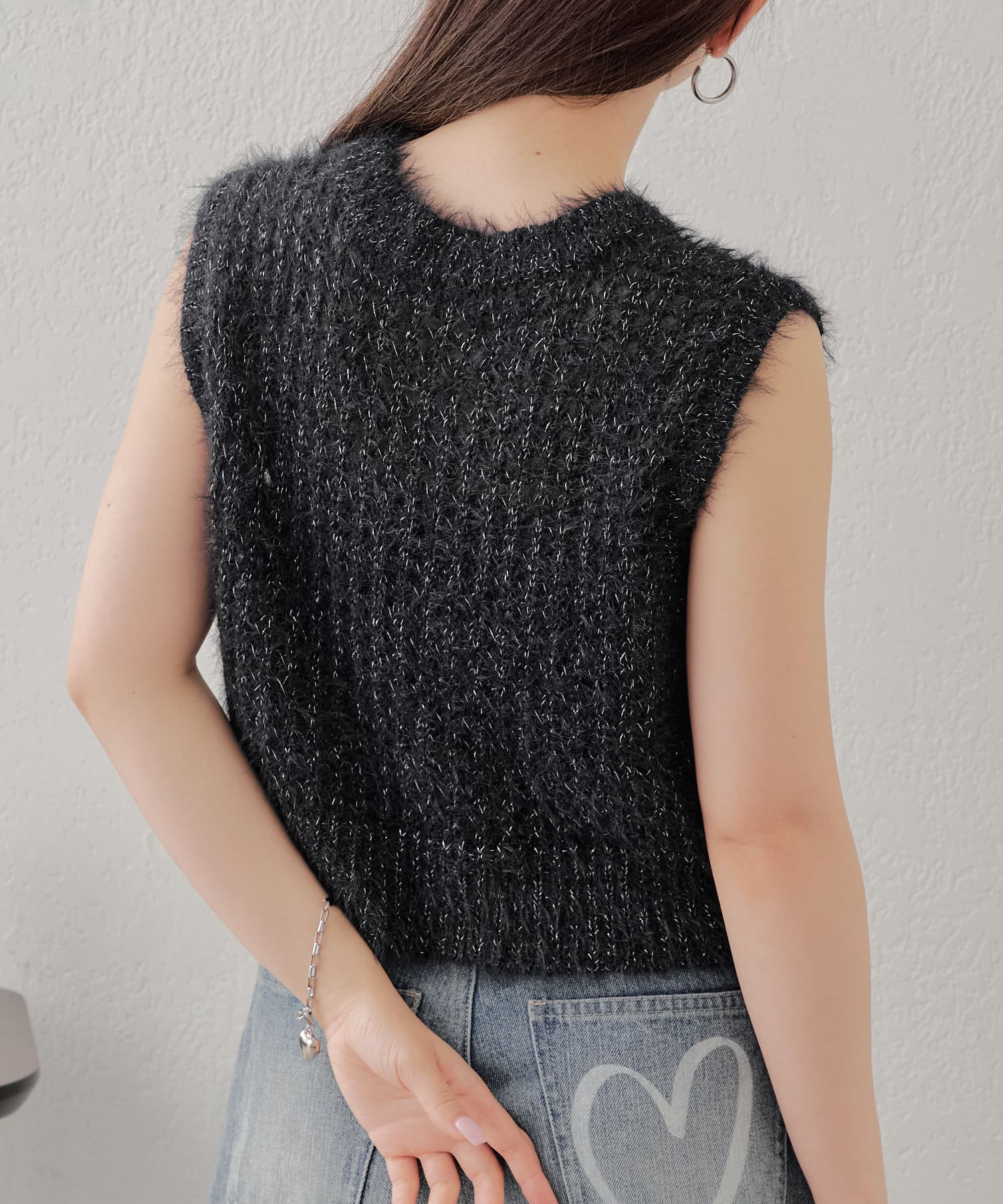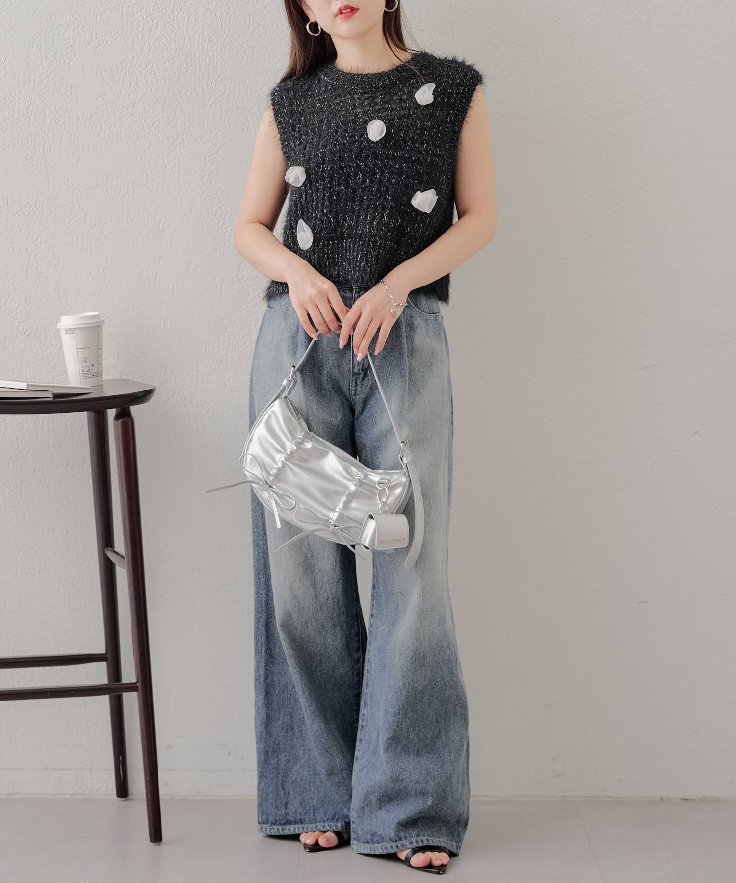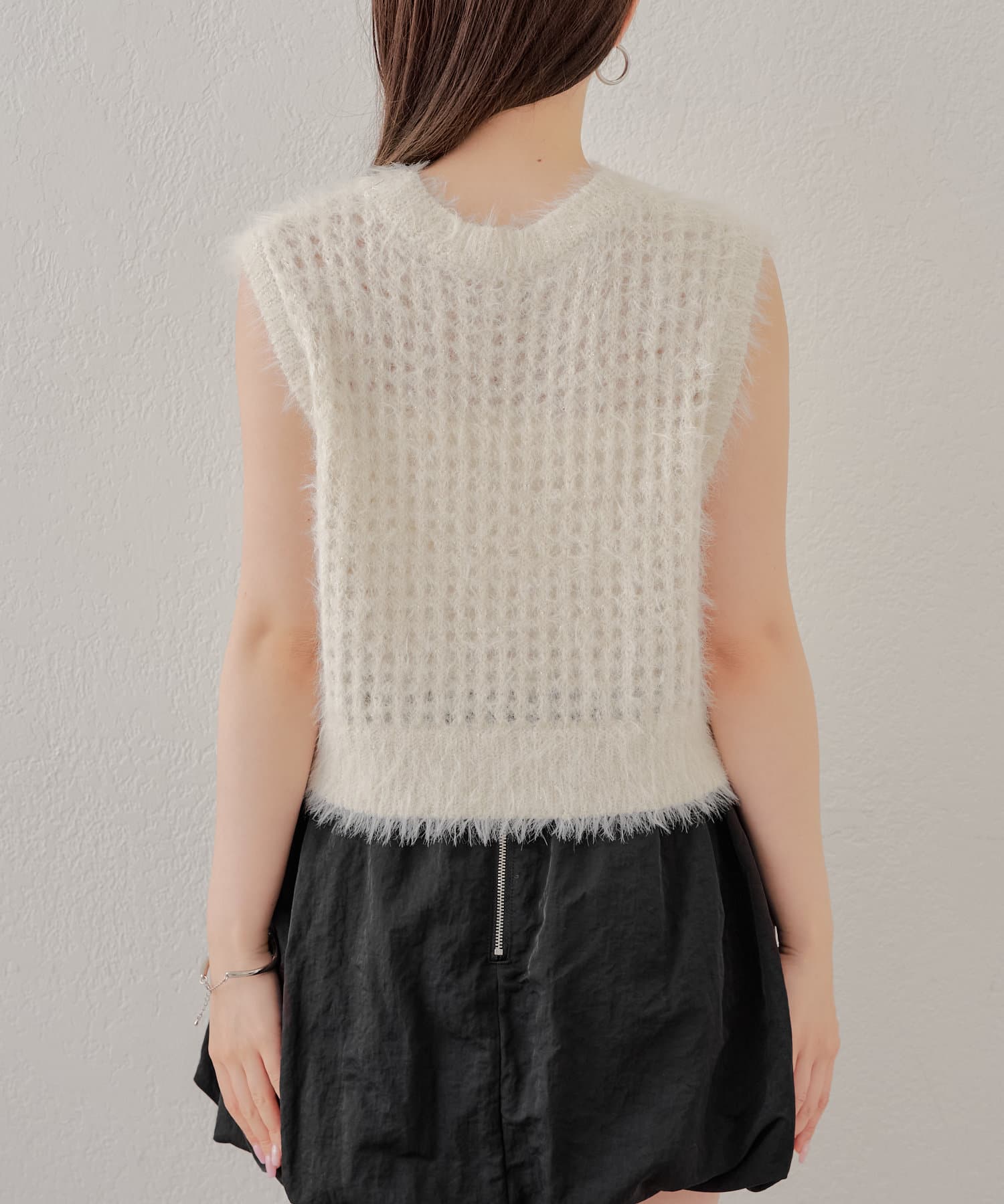 ・ラメのメッシュタンクに立体的な薔薇モチーフが付いており可愛いが詰まったニットタンク。