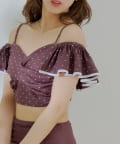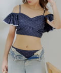 ・ドット柄とフリルがあしらわれたオフショルダーデザインがポイントのスイムウェア。