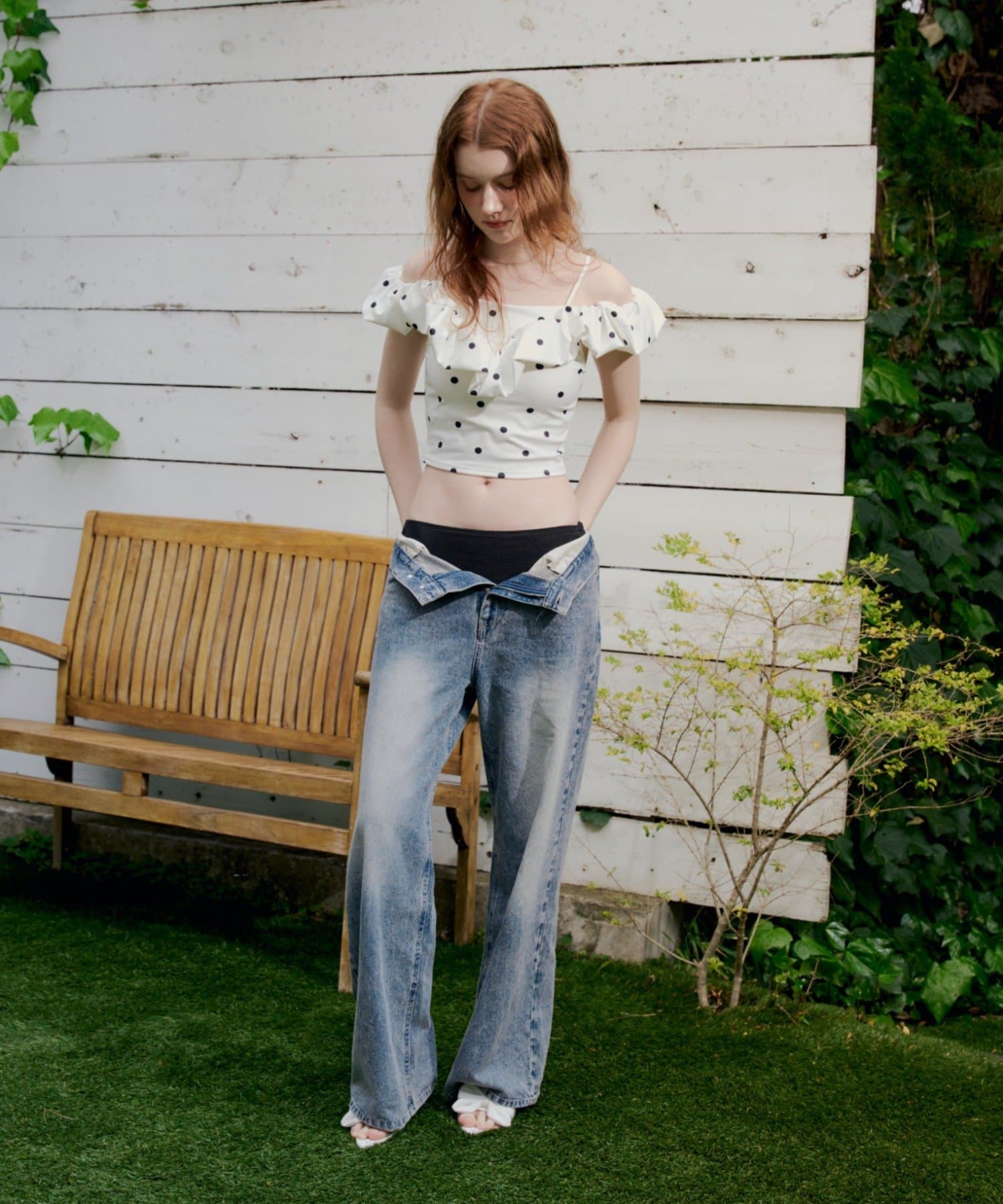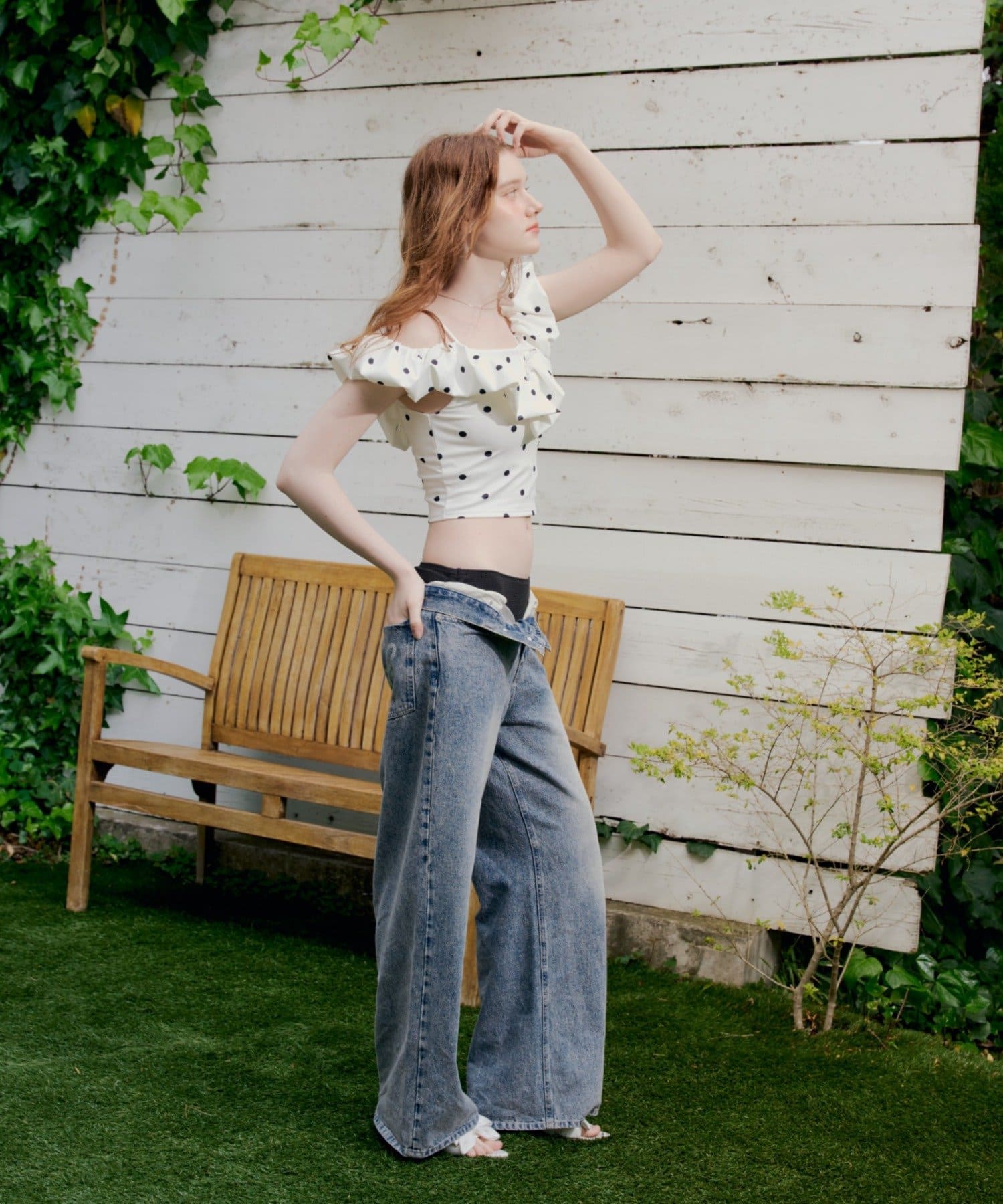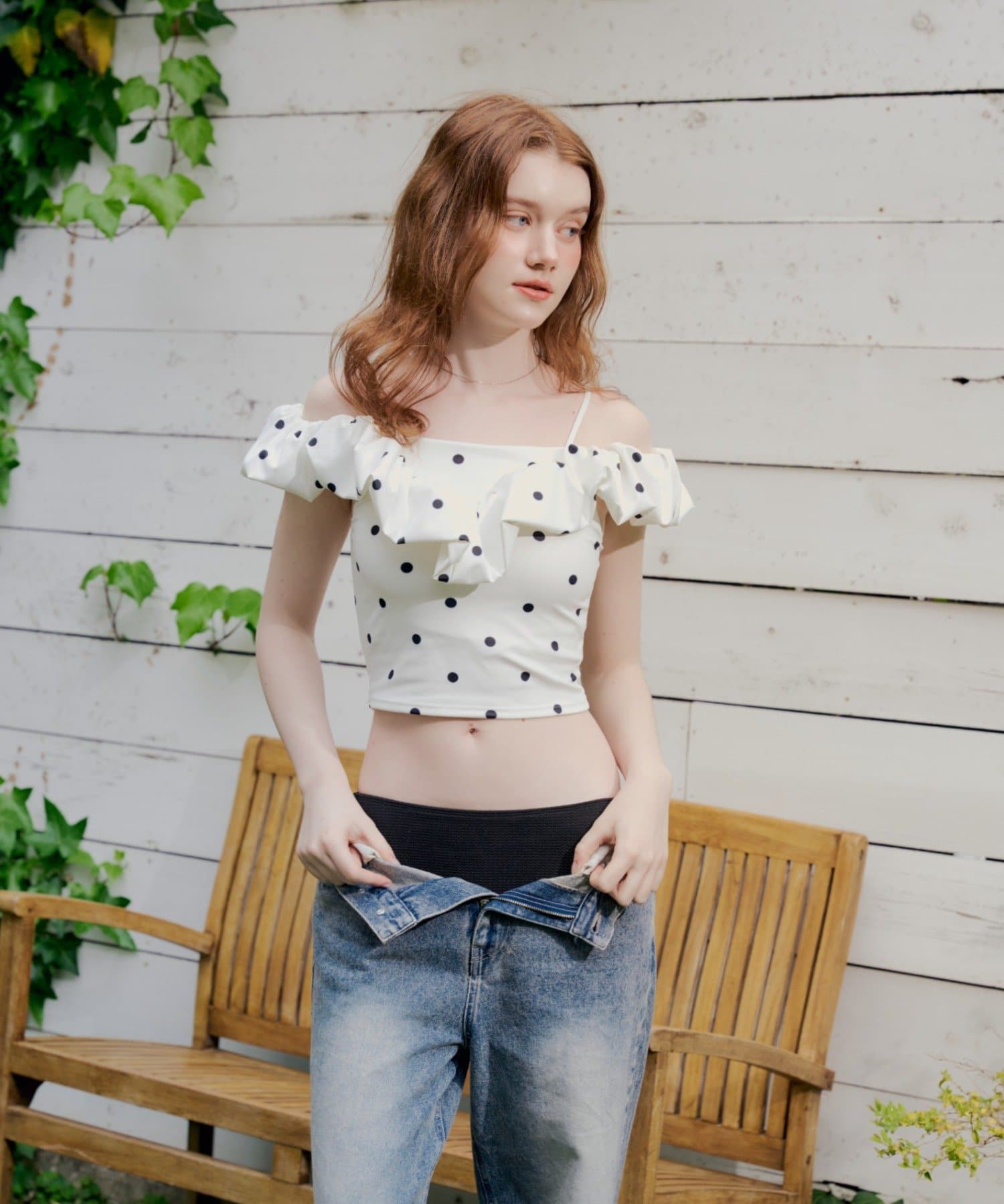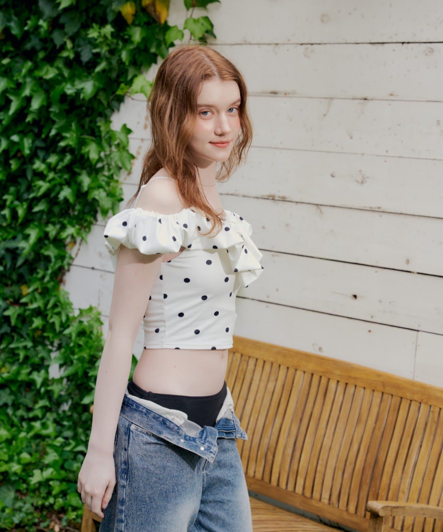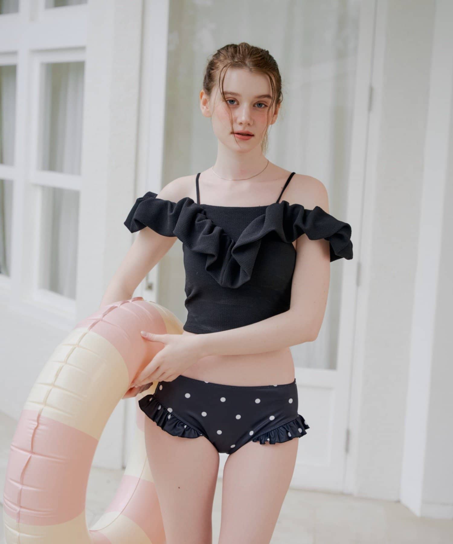・デコルテを美しく魅せるオフショルダーデザインに、ふんわりと波打つフリルをあしらったスイムウェア。