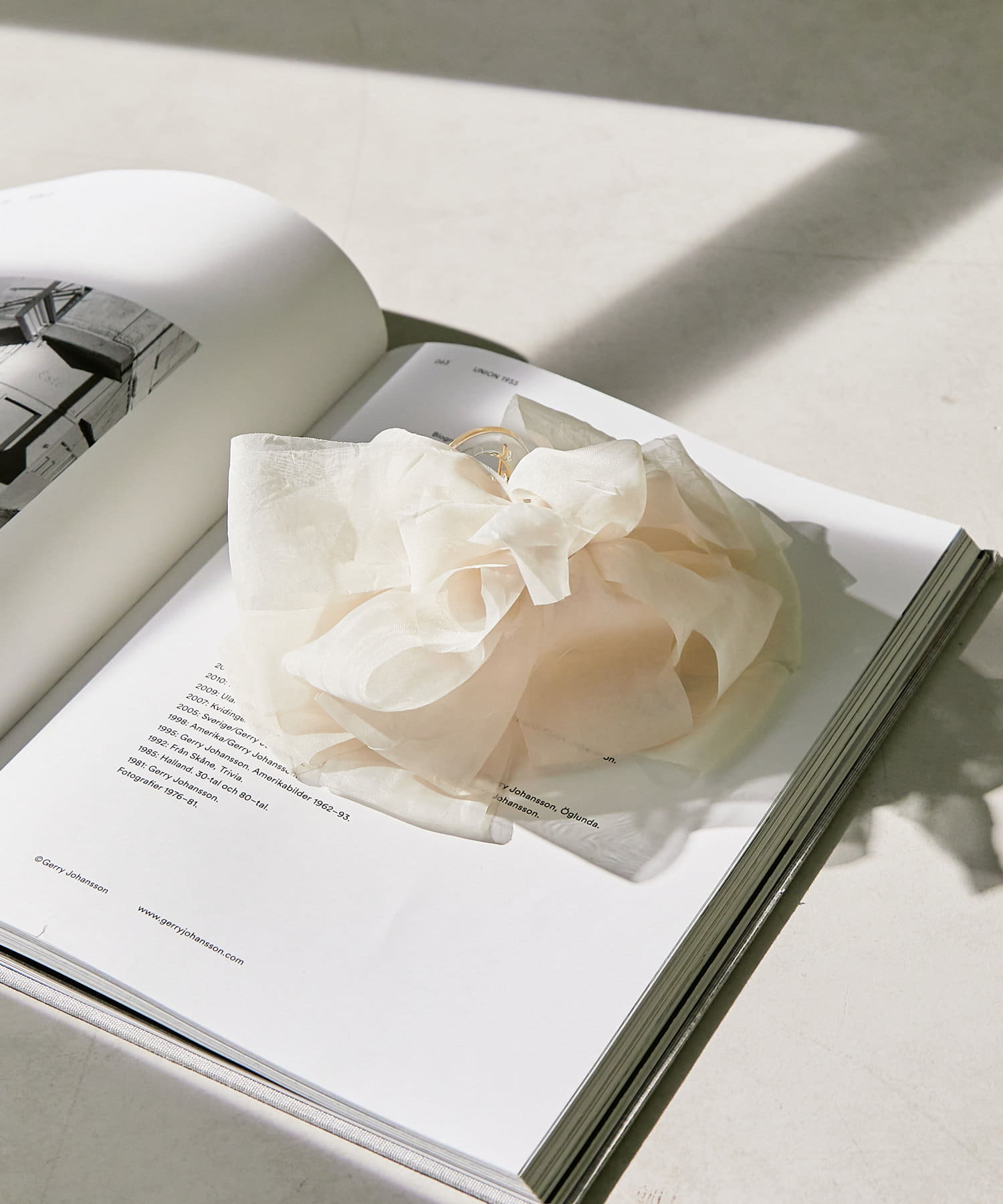 大きめのリボンのヘアアクセサリーがほしいなぁと思いつつ、可愛すぎると年齢的につけづらいので迷う、というところでこのリボンは素材がシアーで甘くなりすぎて今の時期にもとてもかわいいなと思って購入しました。