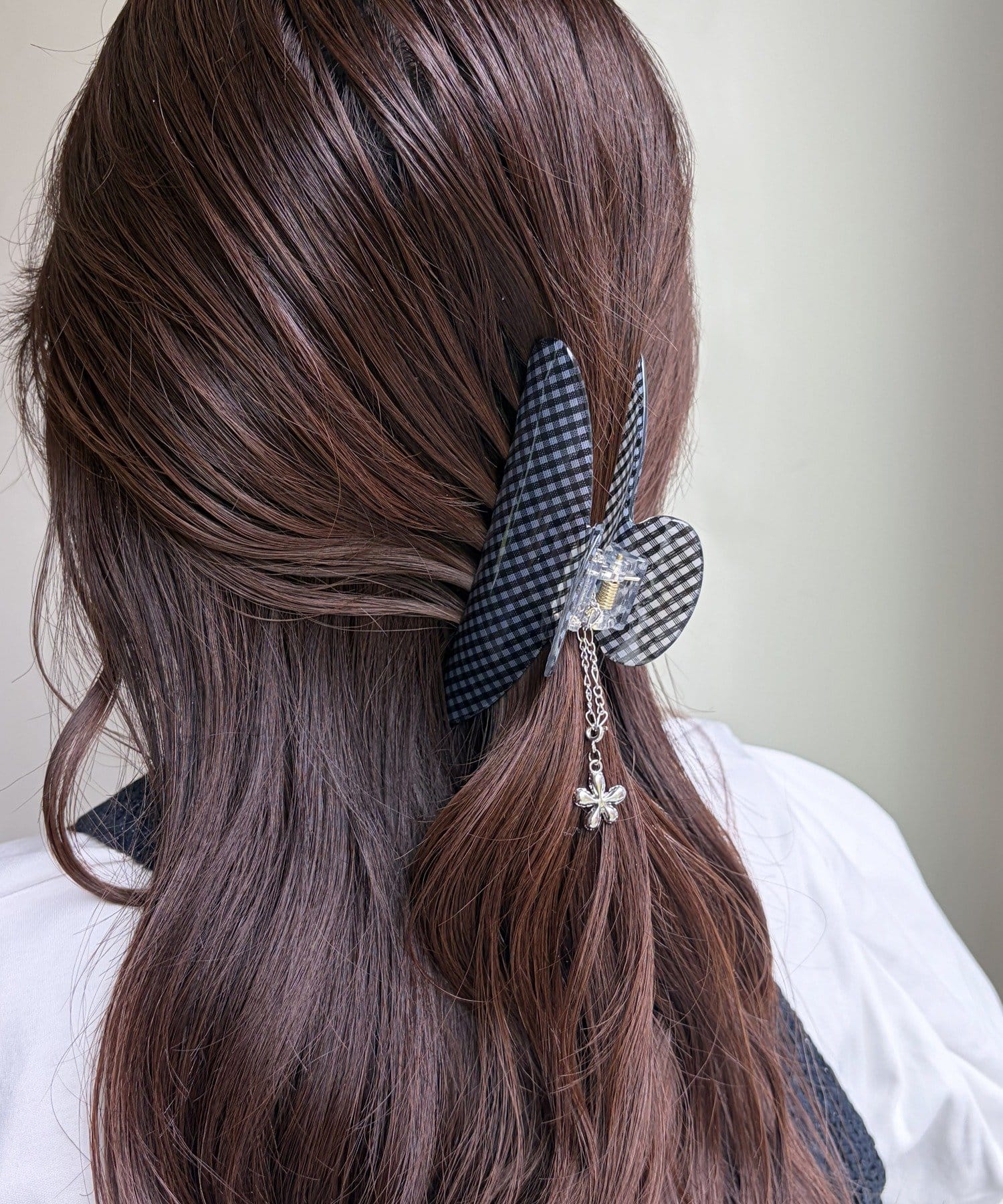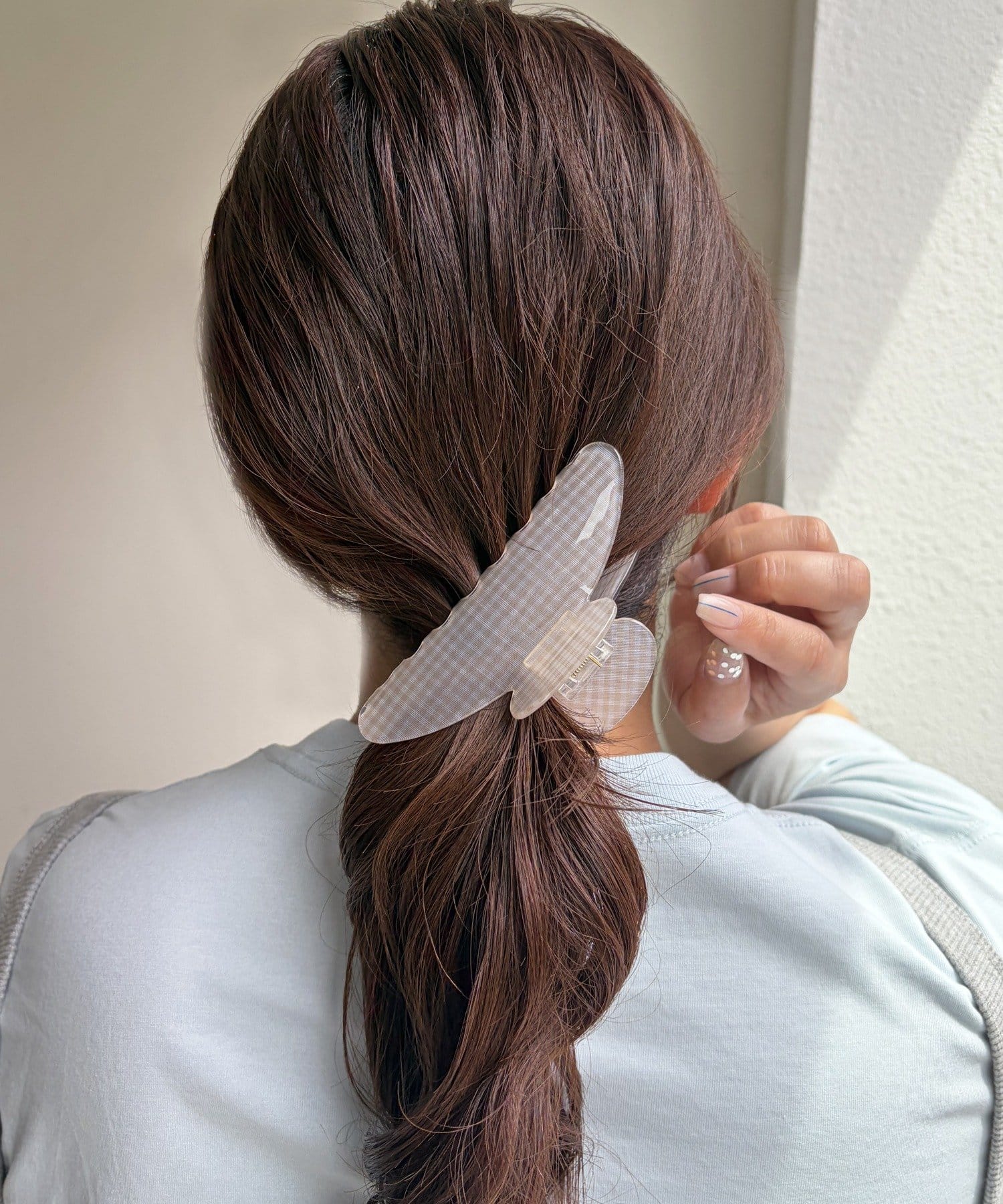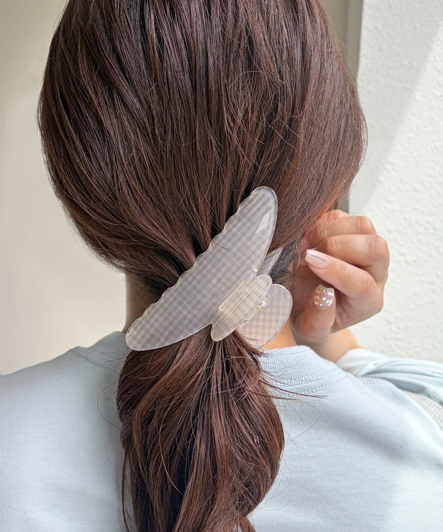 透け感のあるチェック柄が軽やかで、上品なヘアスタイルを演出します。