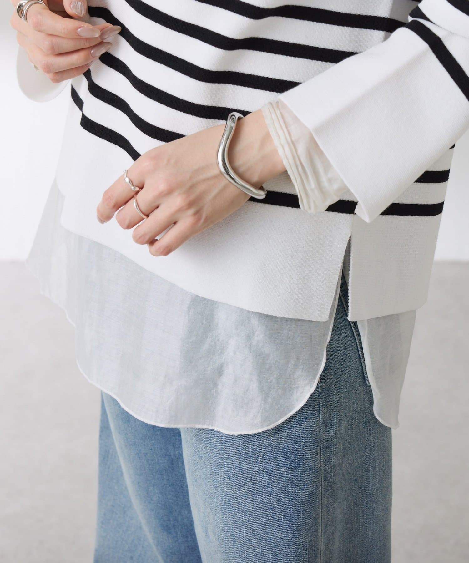・短めのトップスと合わせて、下から裾のシアー素材をのぞかせたり1枚あるとコーディネイトが広がります。