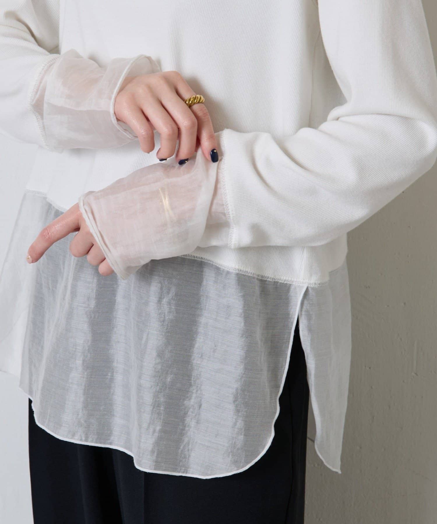 ・裾と袖口を滑らかなシアー素材に切り替えた抜け感のあるトップスです。
