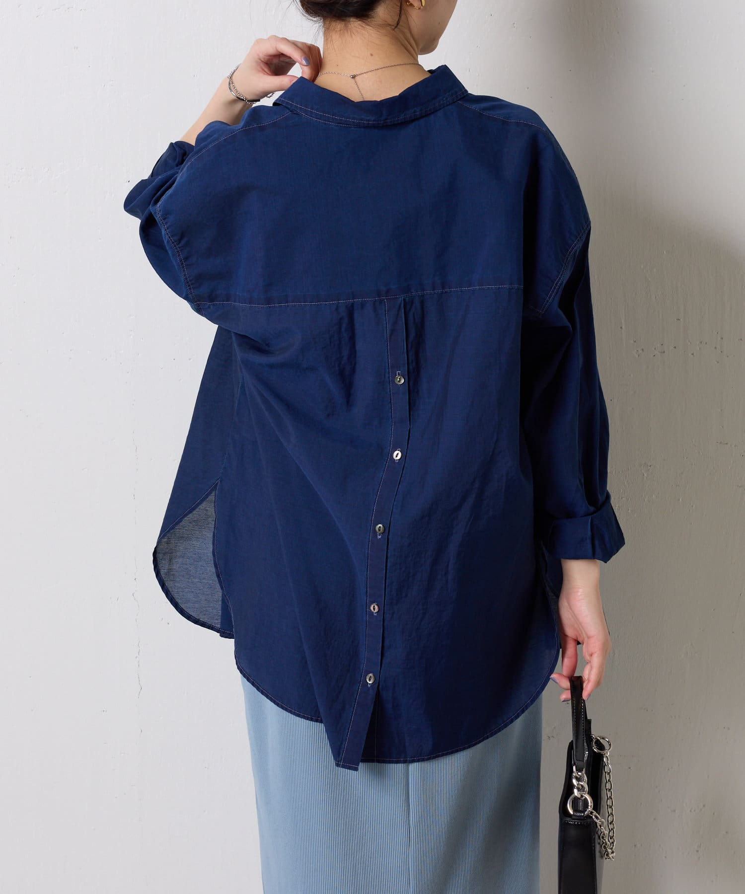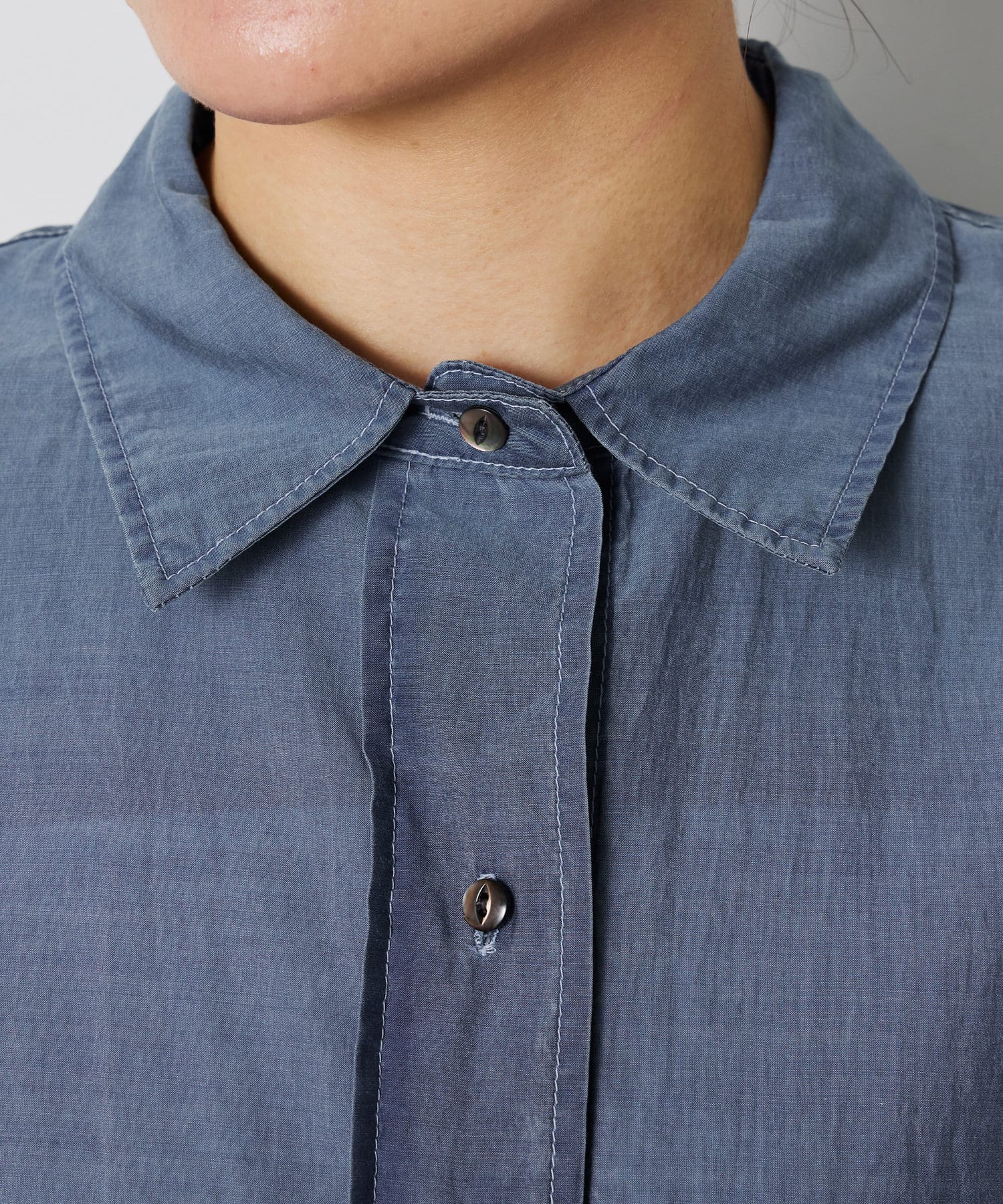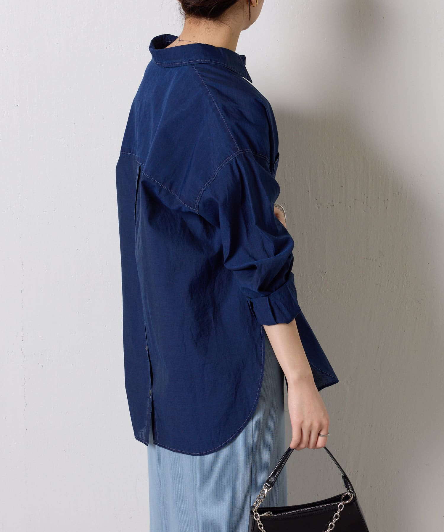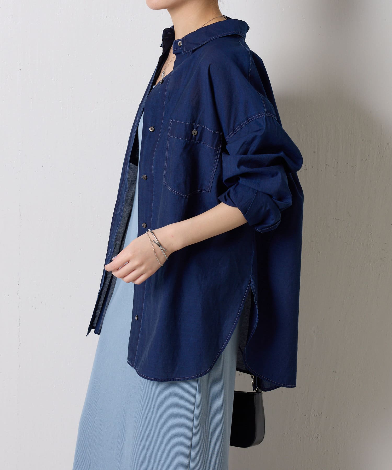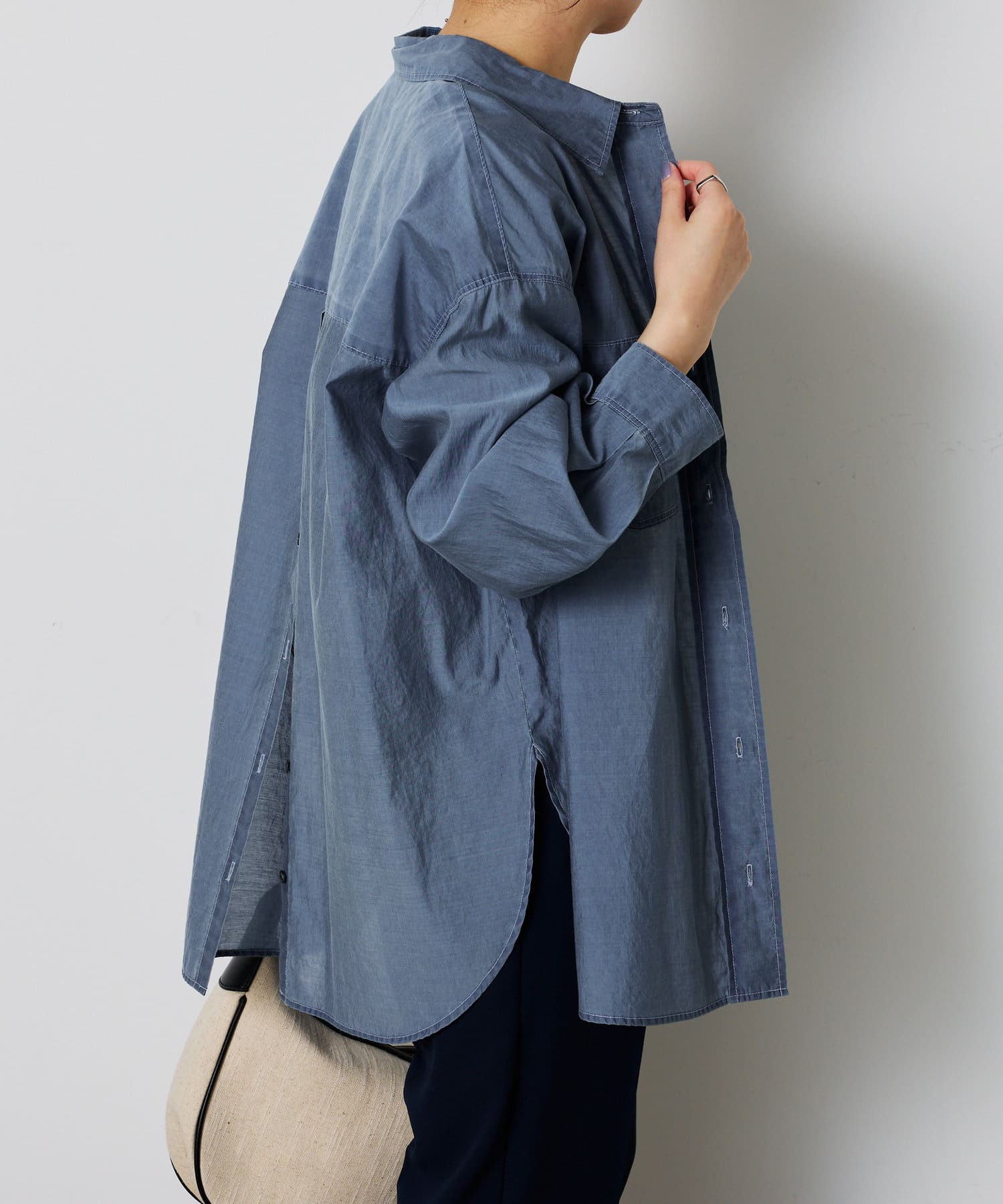・(インディゴ、サックスブルー)シアー感のあるローン系シアー素材で夏でも着れるデニムシャツ。