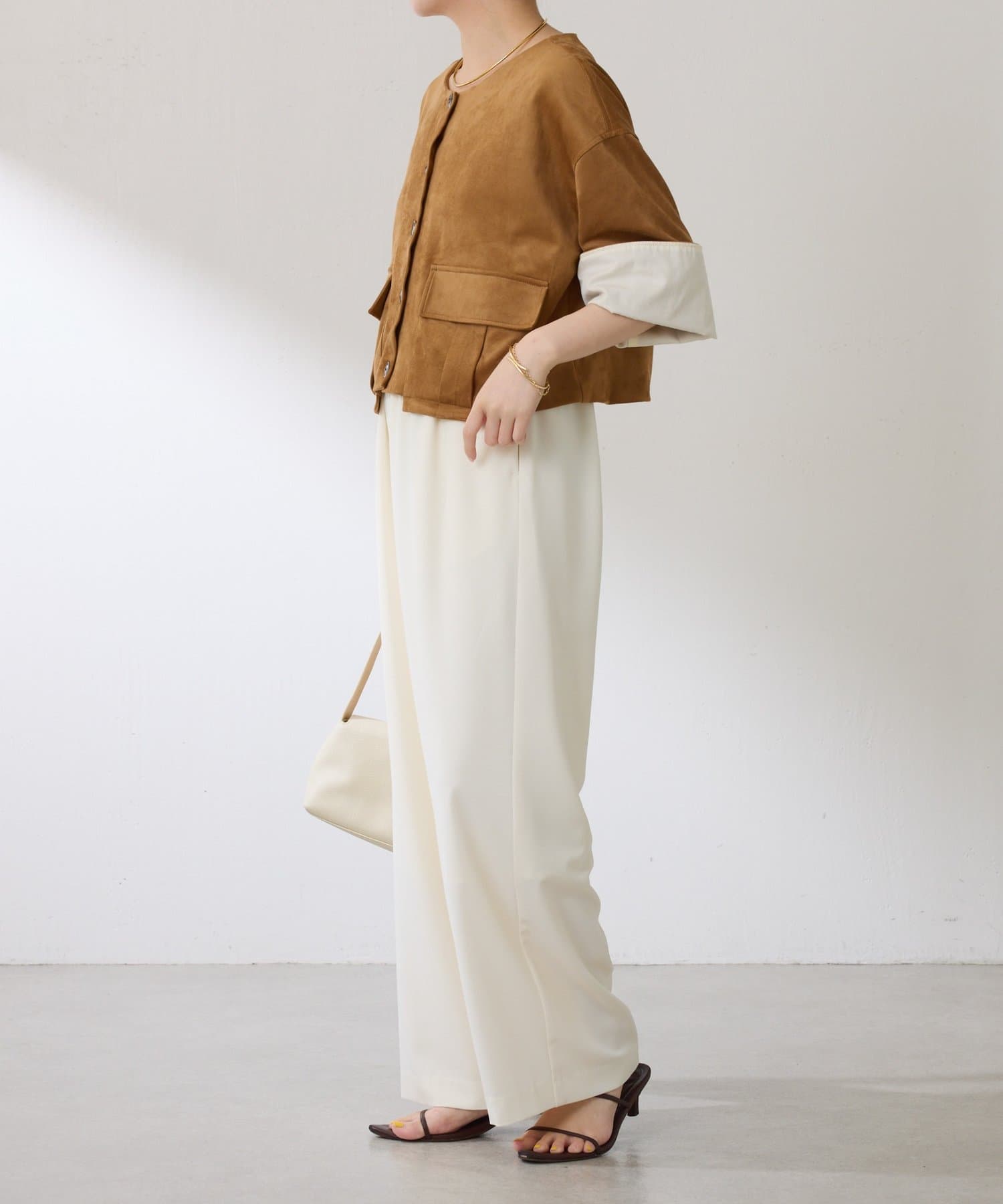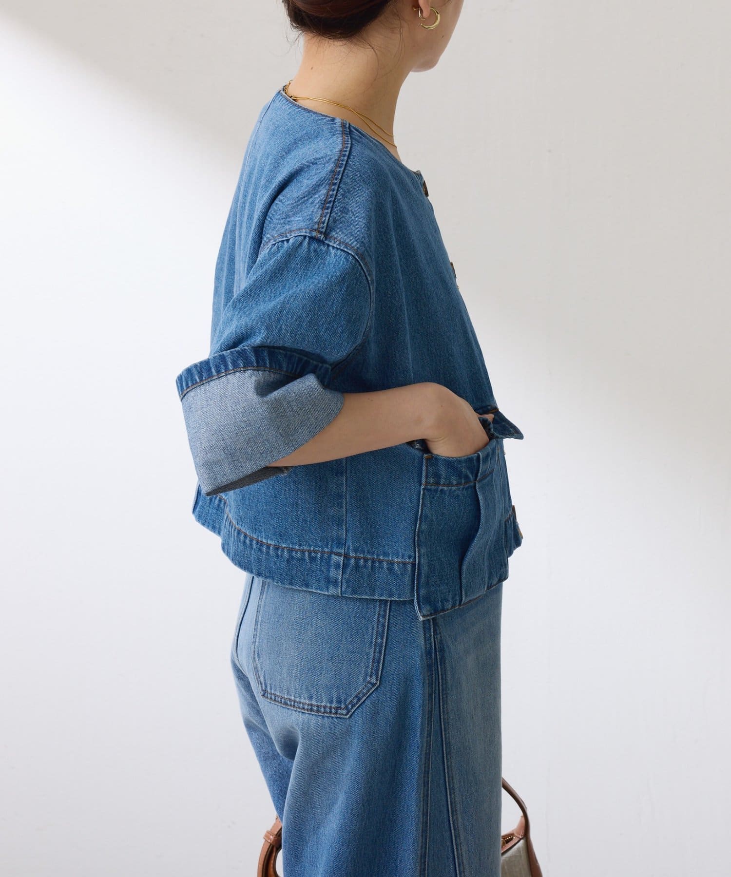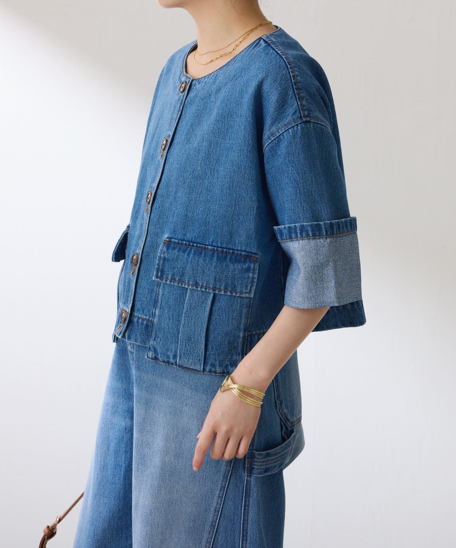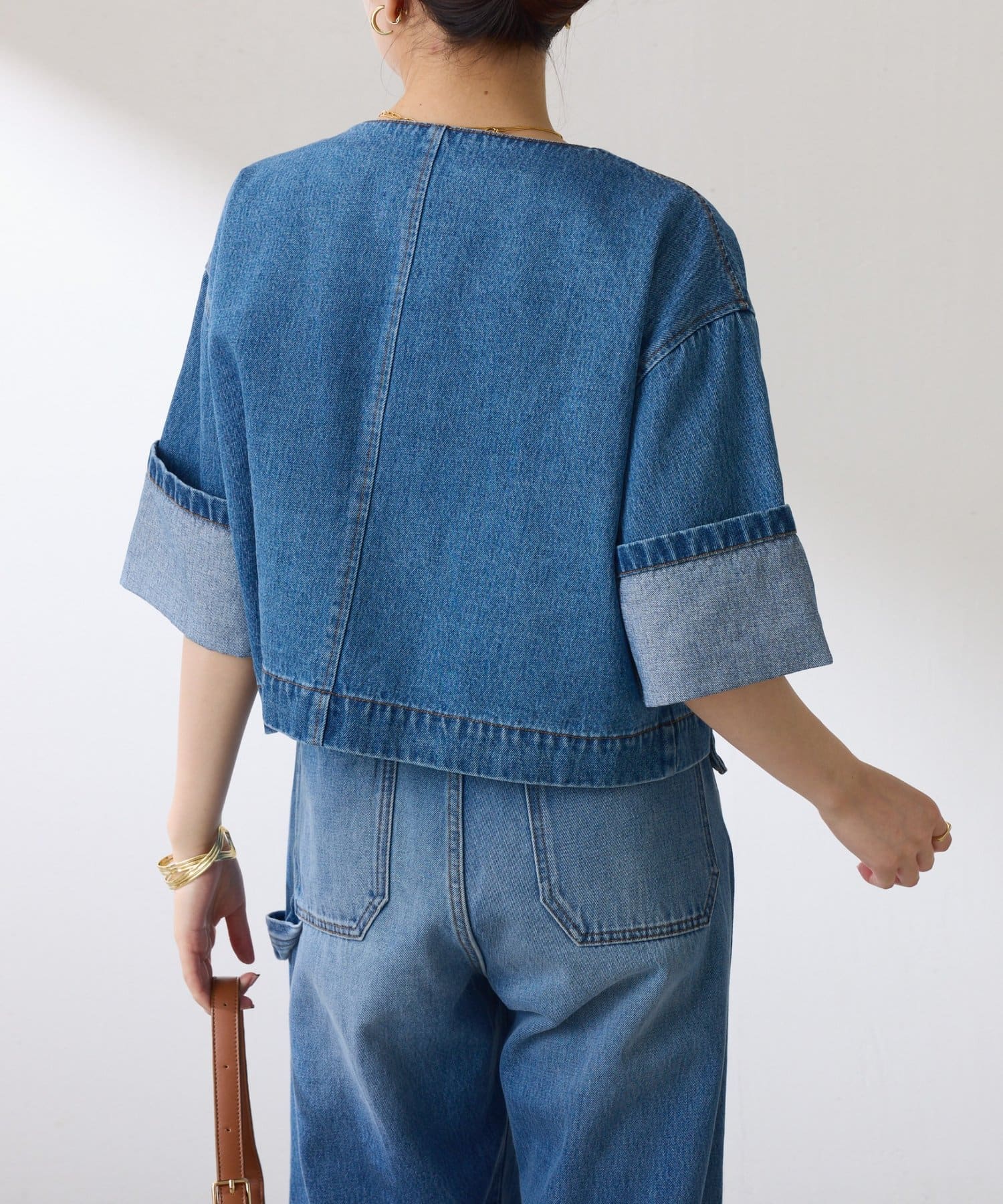 ブラウンは、デニムとも相性抜群です。短丈なのでワイドパンツやワンピースとも相性が良いです。